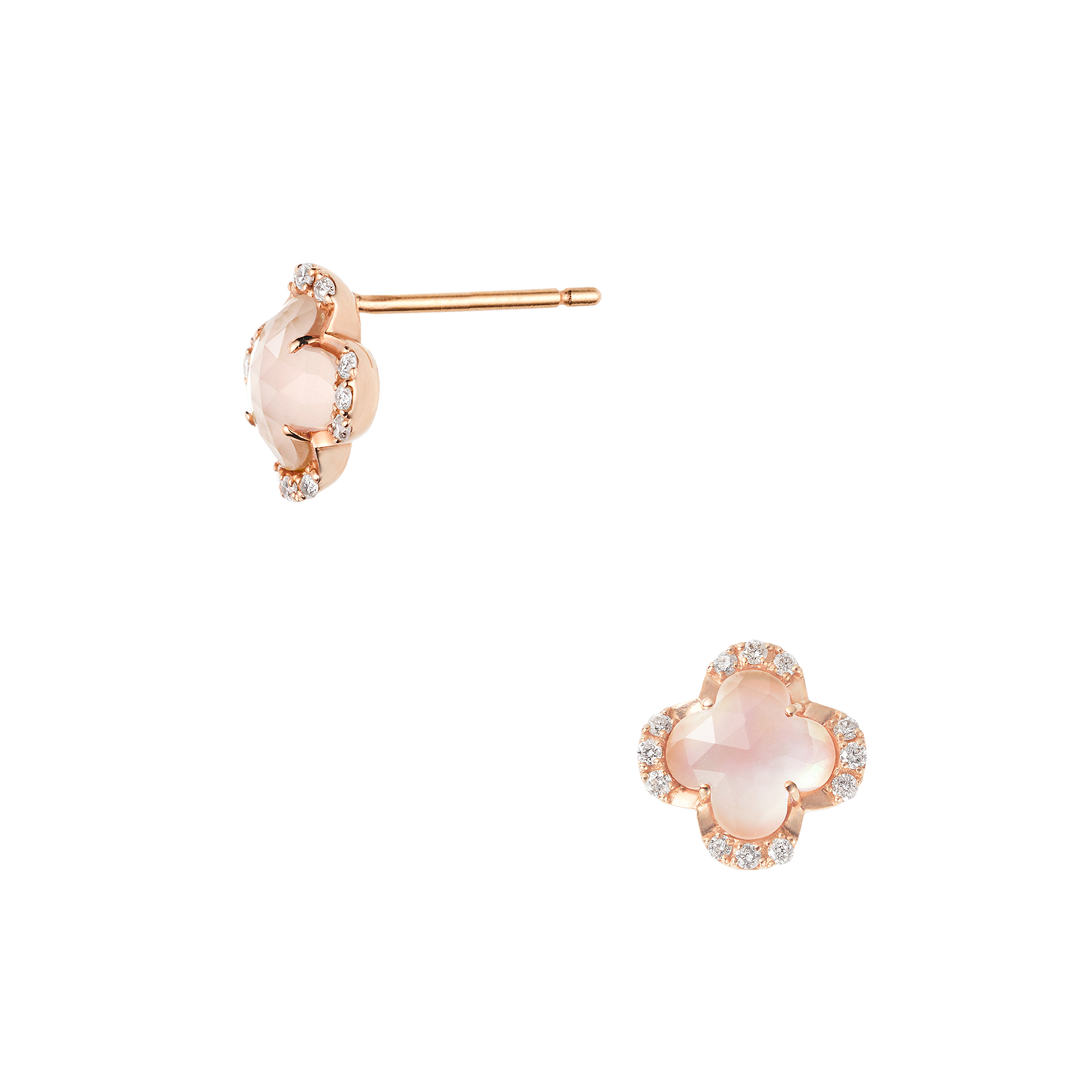シェルの上にローズクォーツを重ねることでみずみずしいカラーと透明感を引き出し、コロンとした立体感が愛らしさをプラスしてくれます。