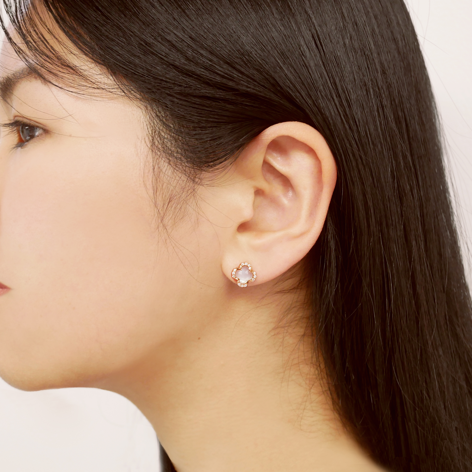 ピンクゴールドにピンクのストーンを組み合わせたフェミニンなカラーリングでクローバーを可愛らしく描いたピアス。