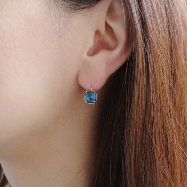 シェルの上にロンドンブルートパースを重ね、深いブルーの奥にやわらかさのあるシェルの輝きが透けて見えるピアス。