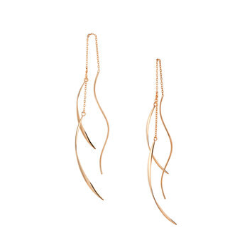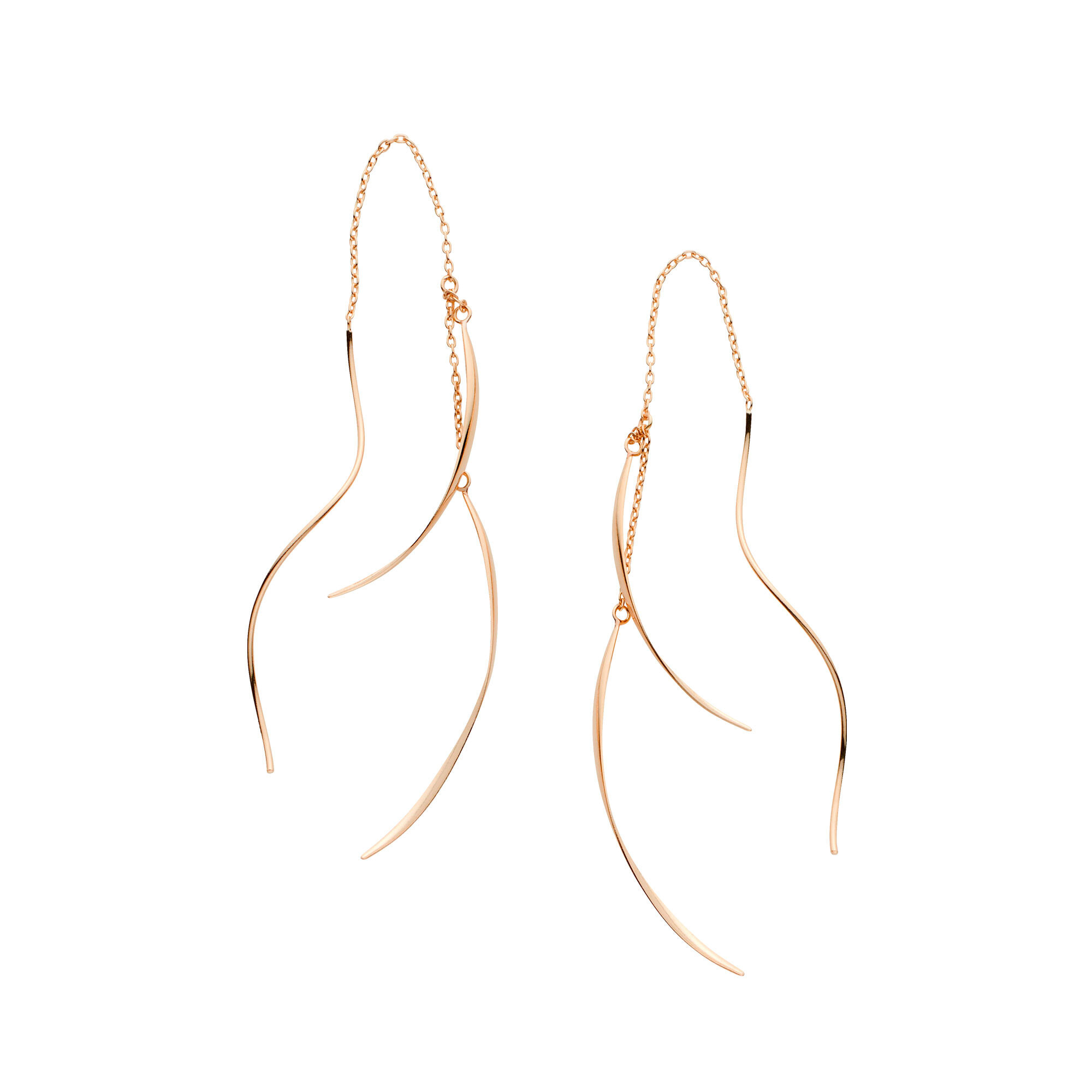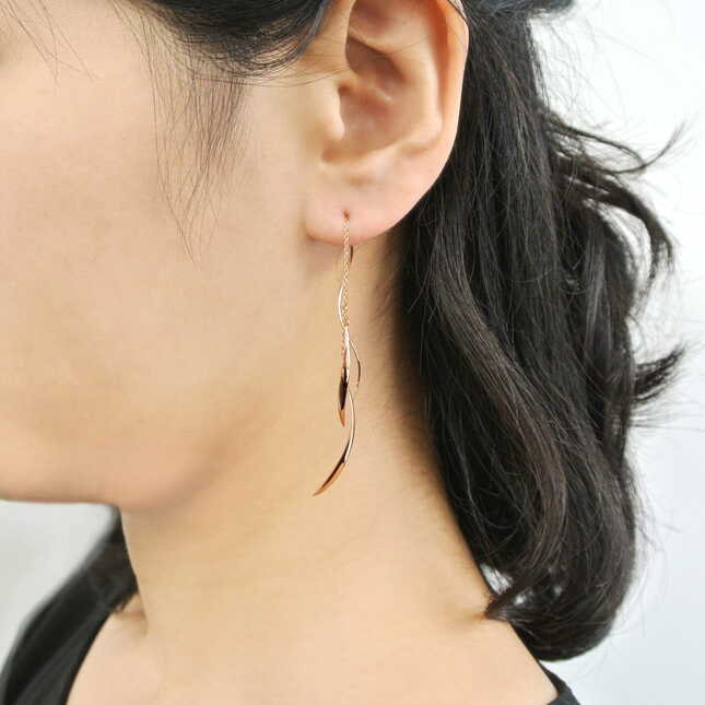 ピンクゴールドの繊細なチェーンとモダンな曲線モチーフが波打つようにアシンメトリーに組み合わさり、おしゃれでこなれた印象に。