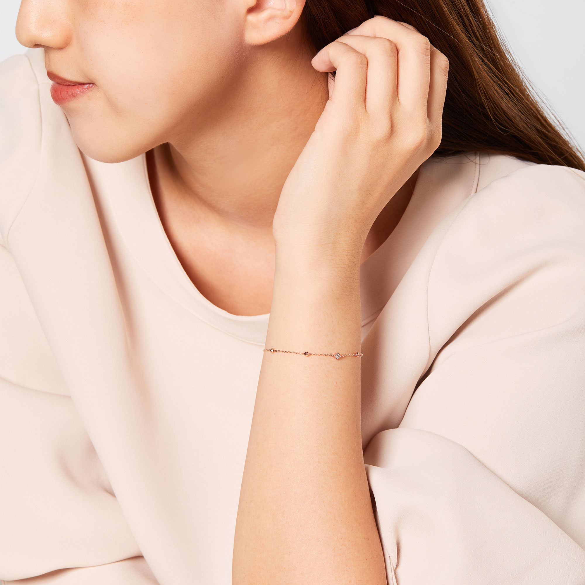 動くたびに光を反射して煌き、毎日の着こなしに上品な印象をプラスします。