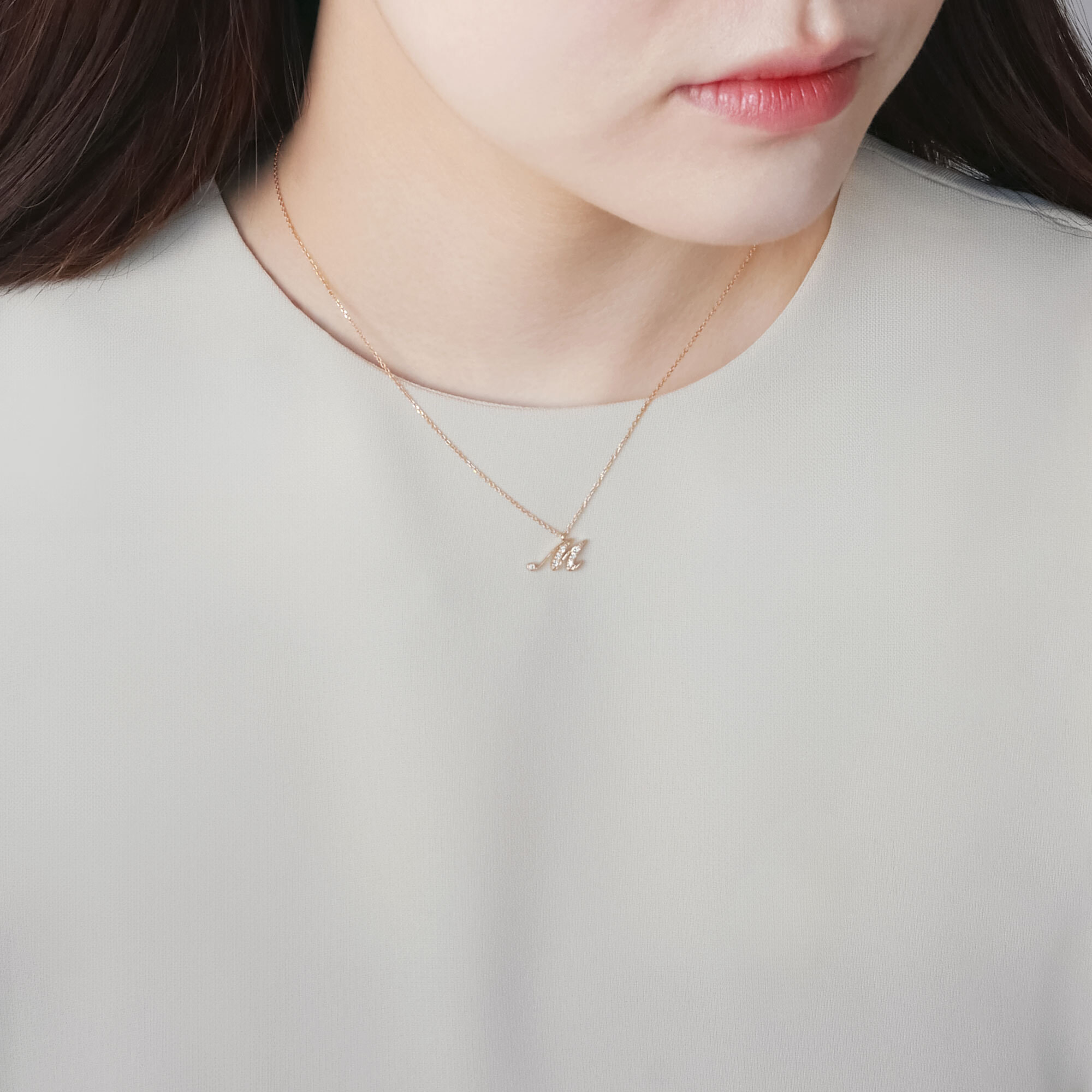 羽ペンのレタリングのような、華やかでエレガントな印象のイニシャルネックレス。