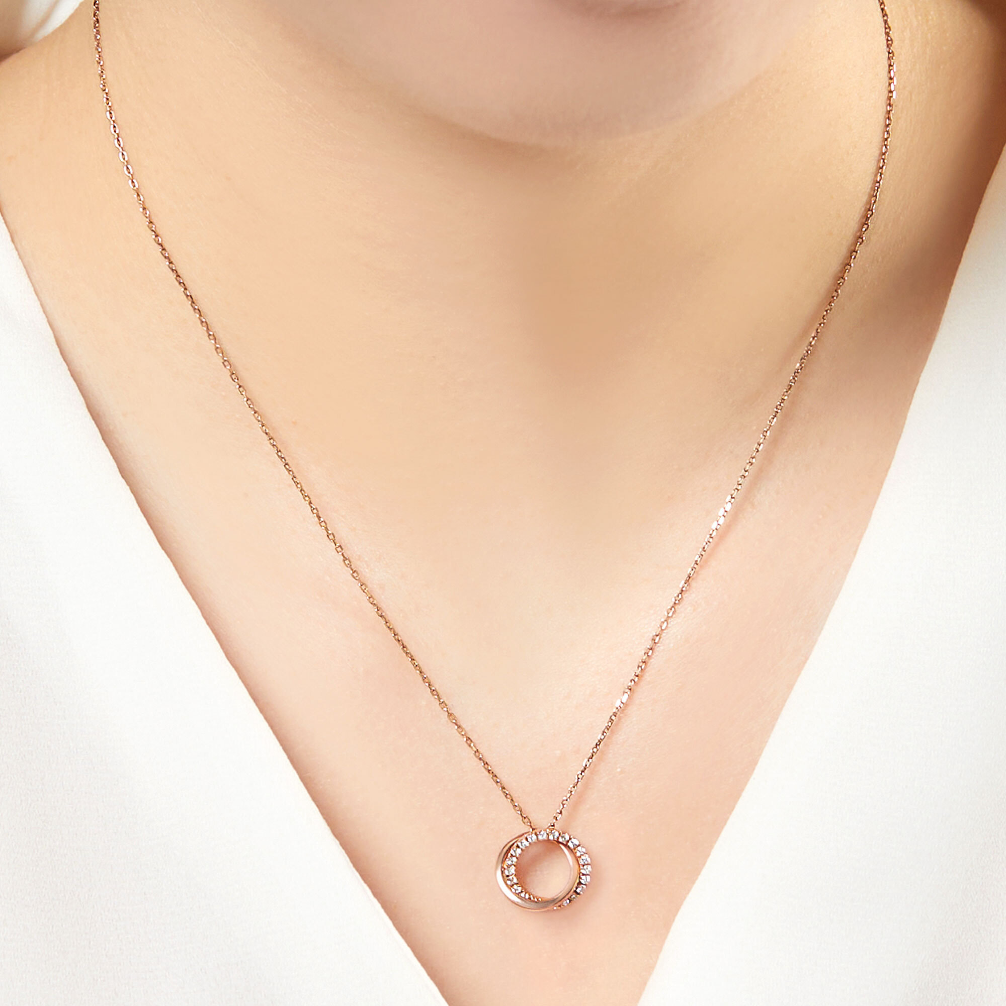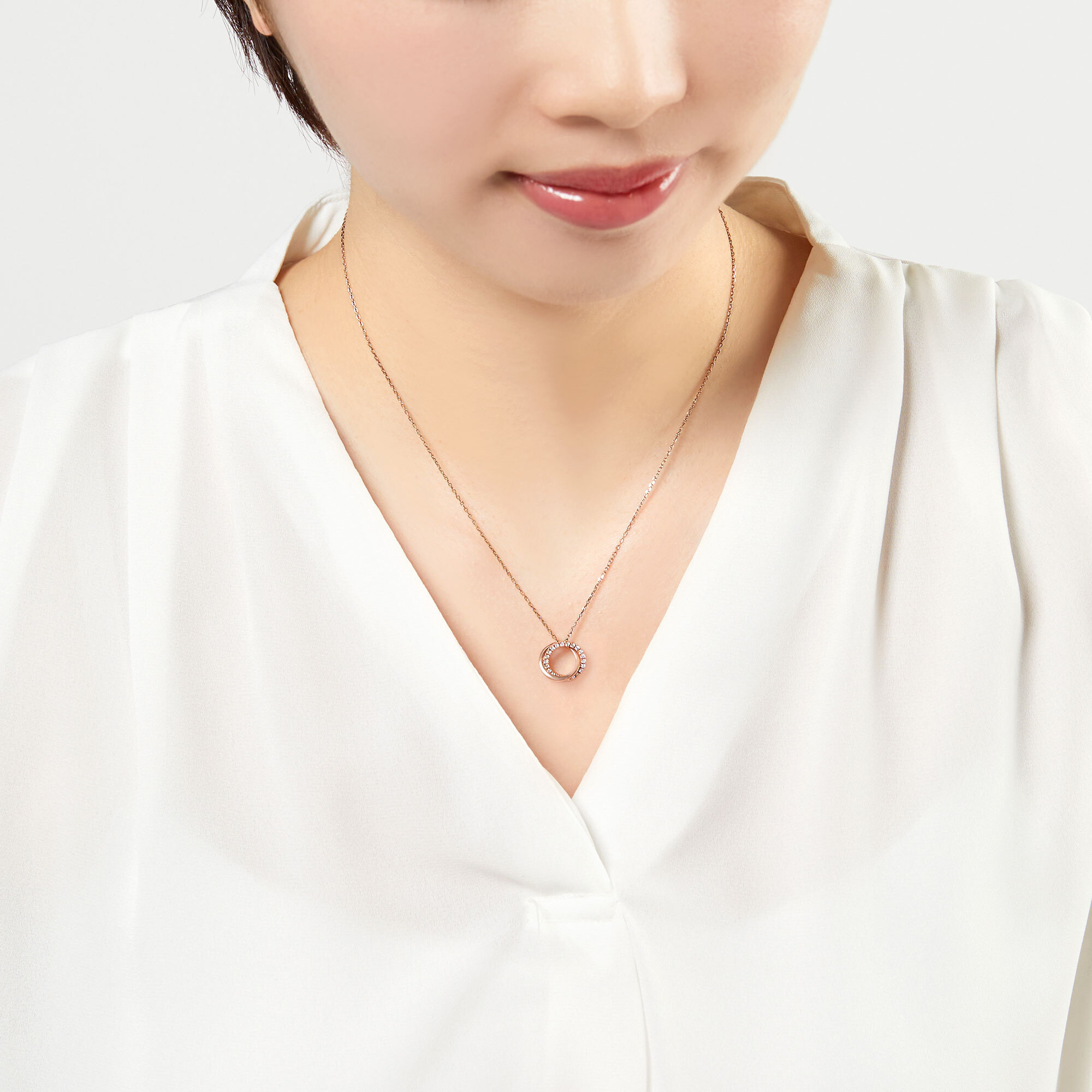 地金とダイヤモンドで描いたふたつのサークルが軽やかな空気を感じさせる、立体感のあるダブルサークルモチーフのネックレス。