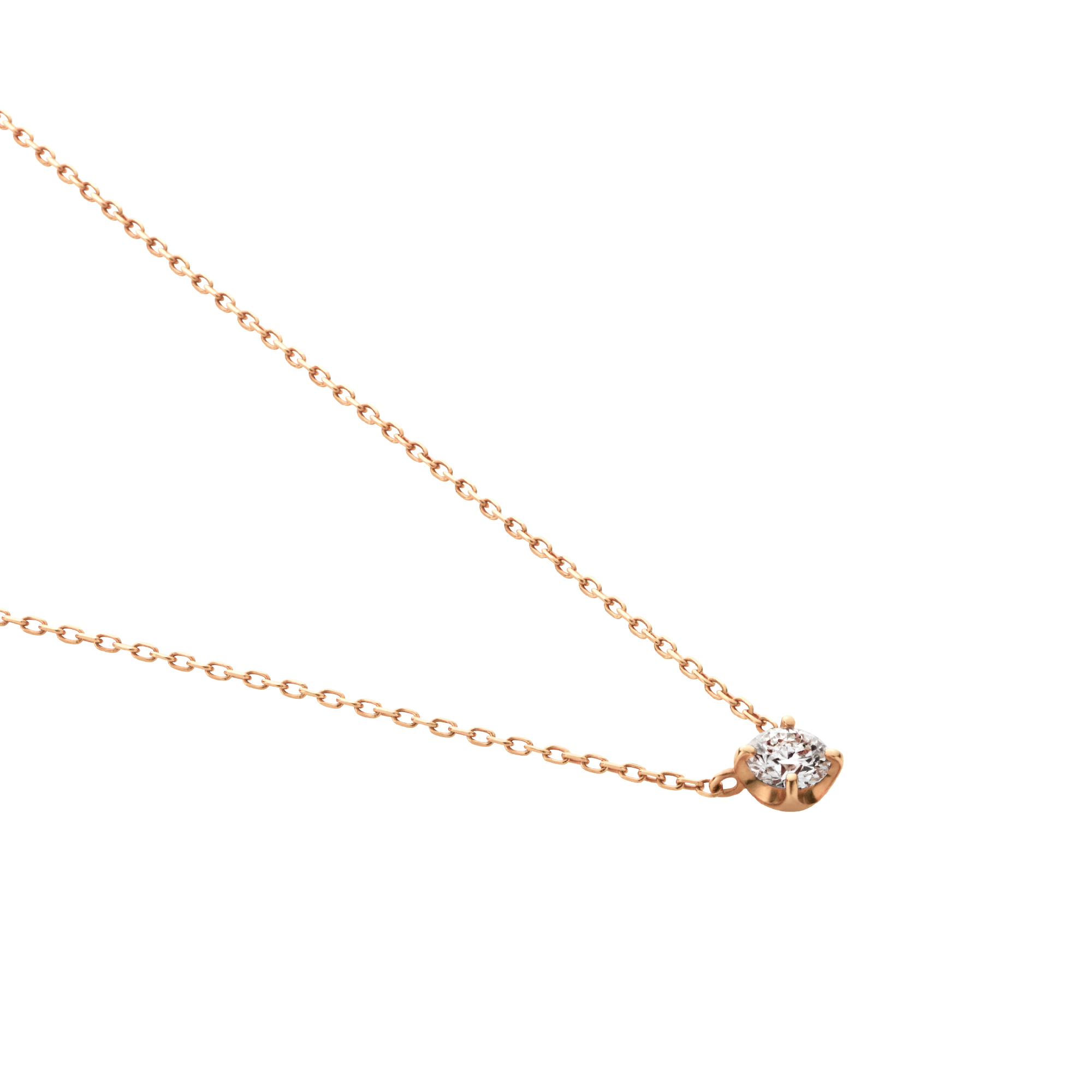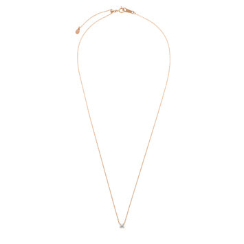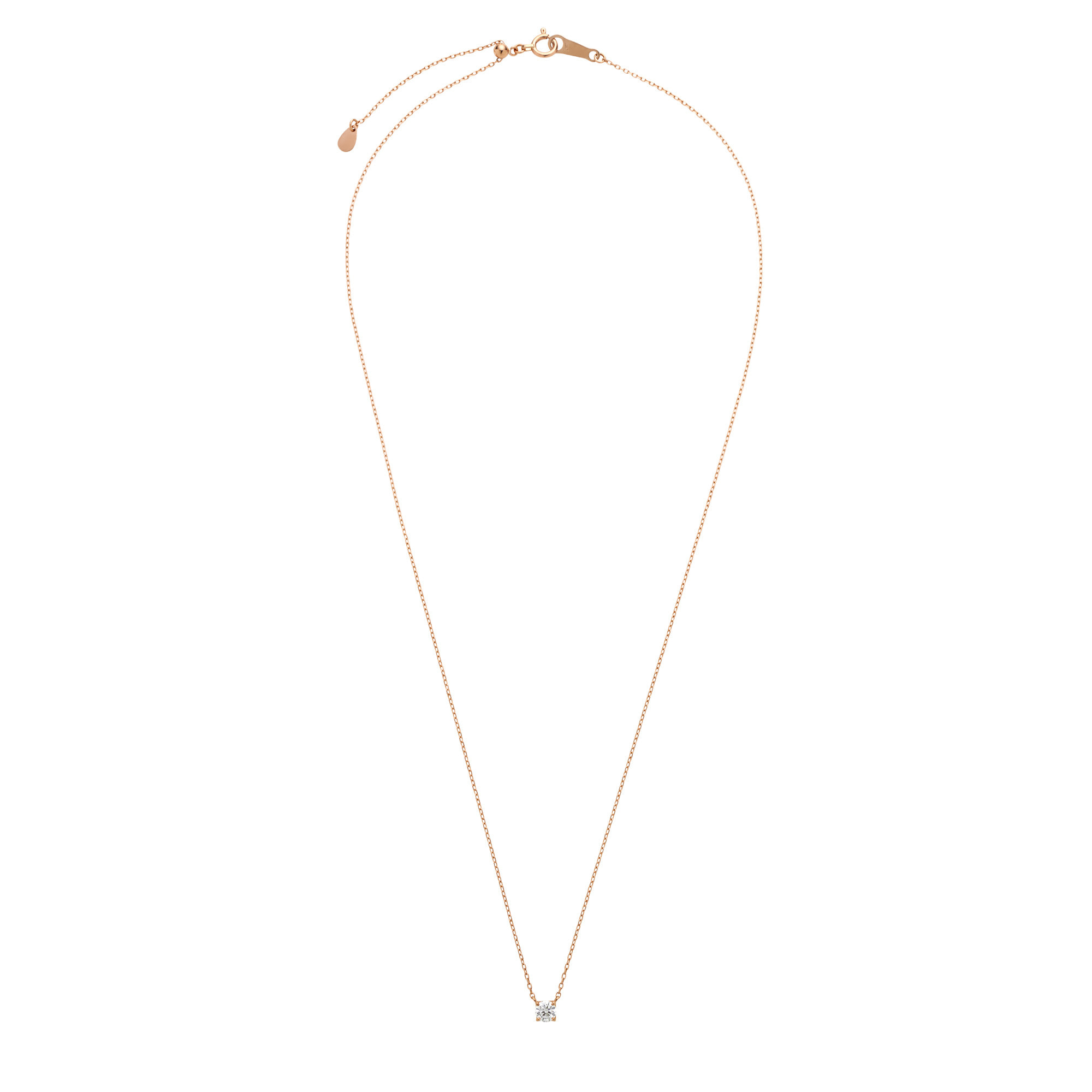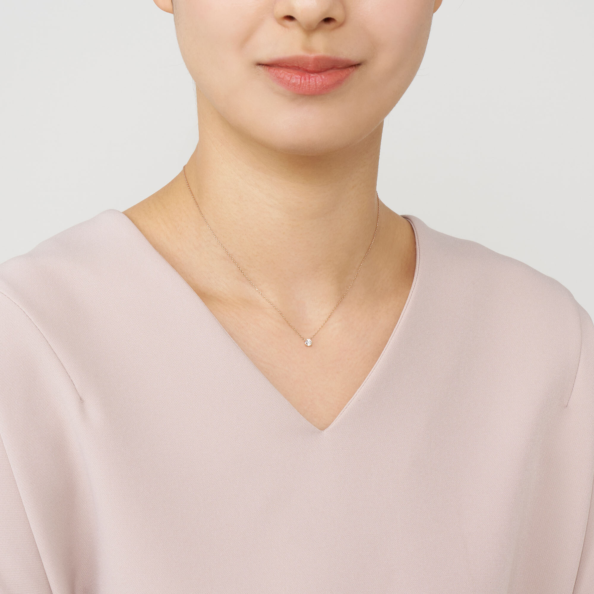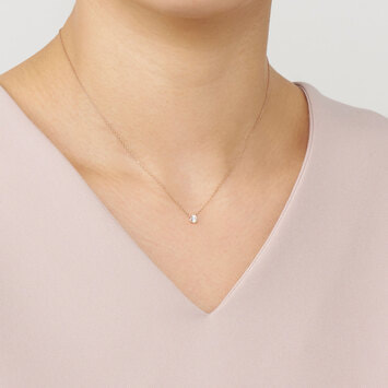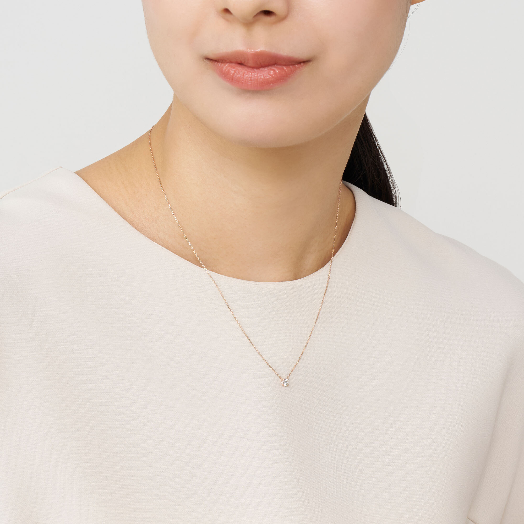 チェーンはダイヤモンドだけが胸元に可憐に浮かび上がる、繊細なアズキチェーンを使用。スライドアジャスターもついているので、自由に長さを調節できてコーディネートの幅が広がります。