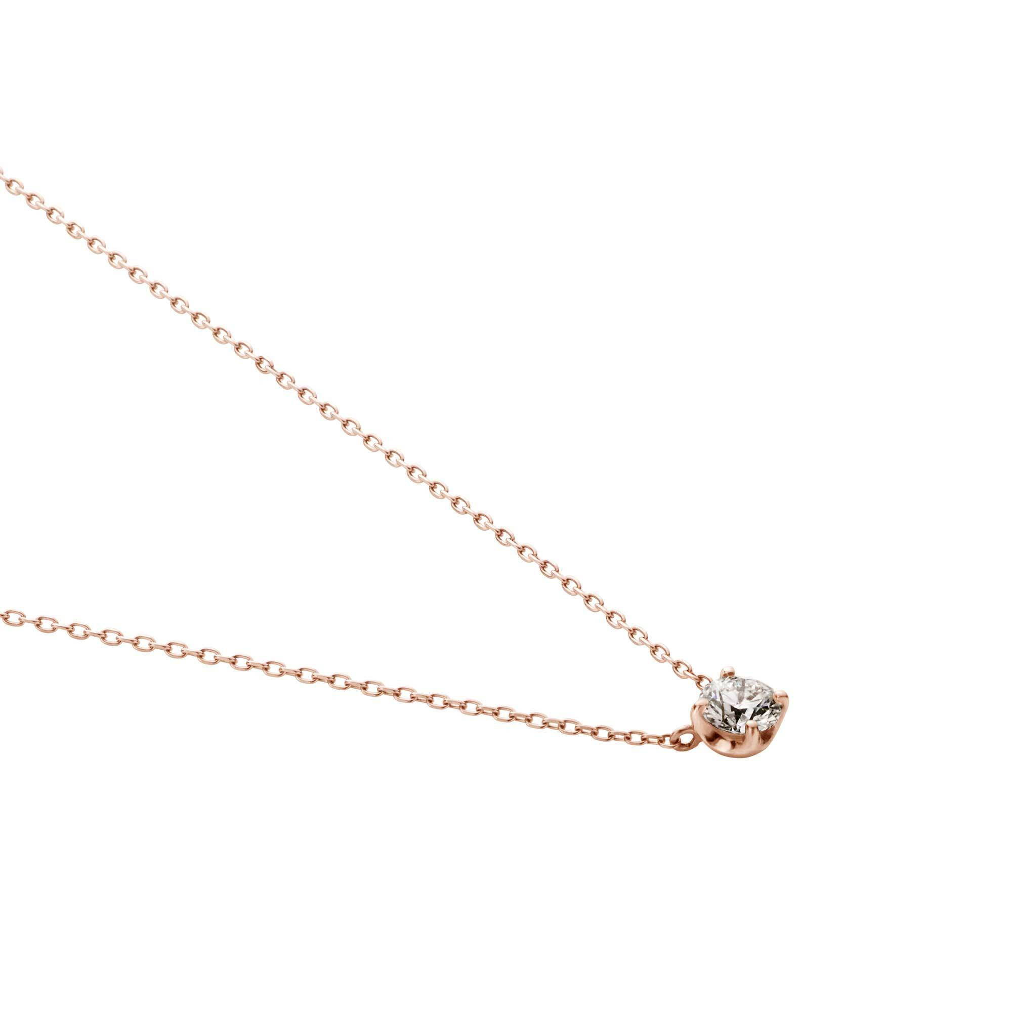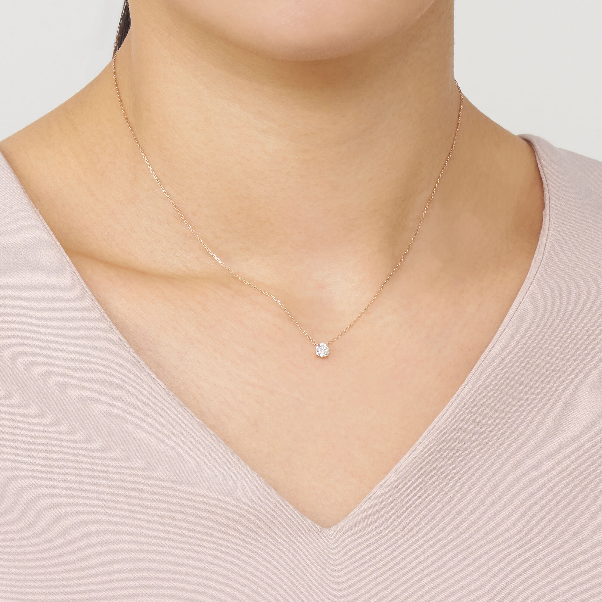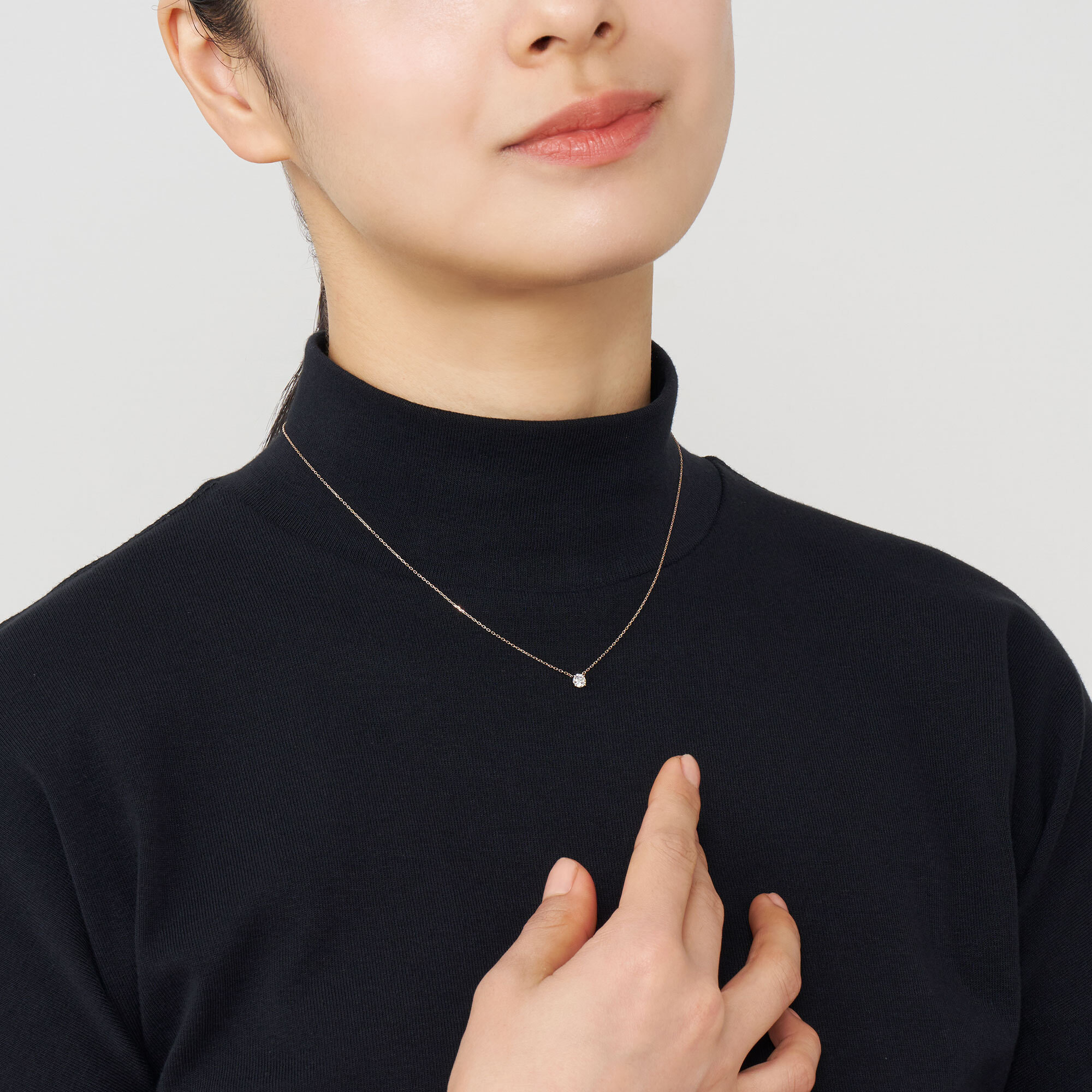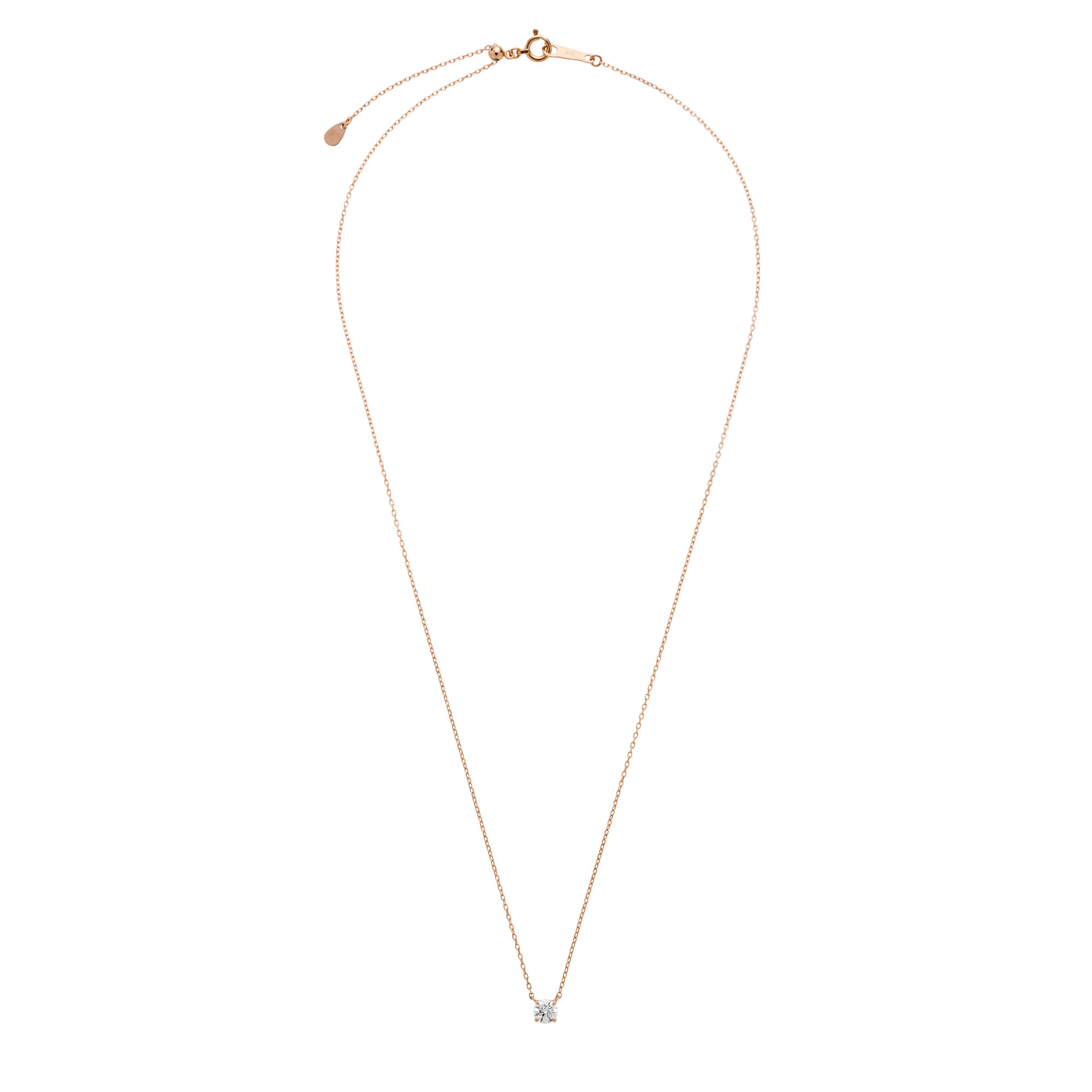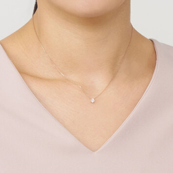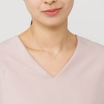 チェーンはダイヤモンドだけが胸元に可憐に浮かび上がる、繊細なアズキチェーンを使用。スライドアジャスターもついているので、自由に長さを調節できてコーディネートの幅が広がります。