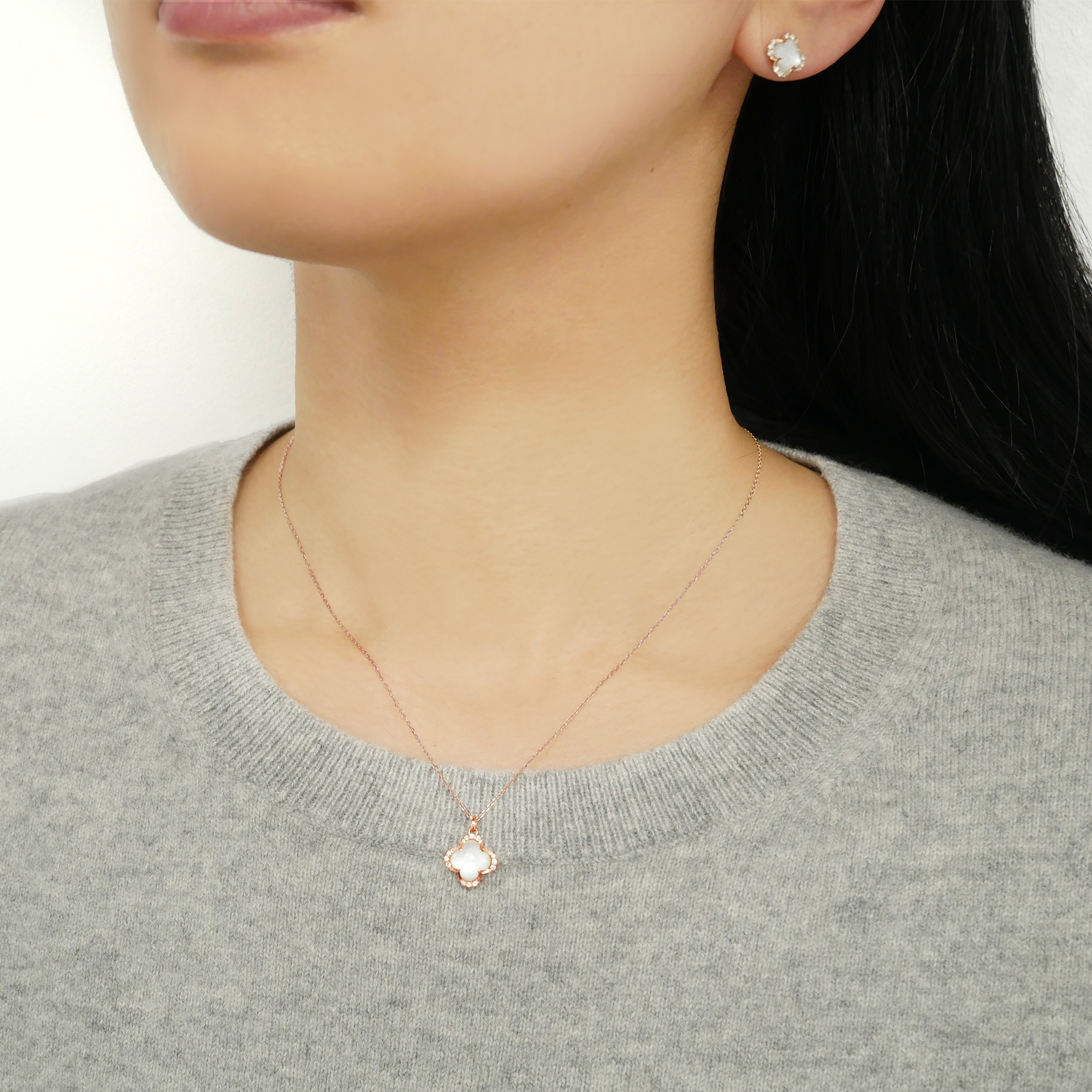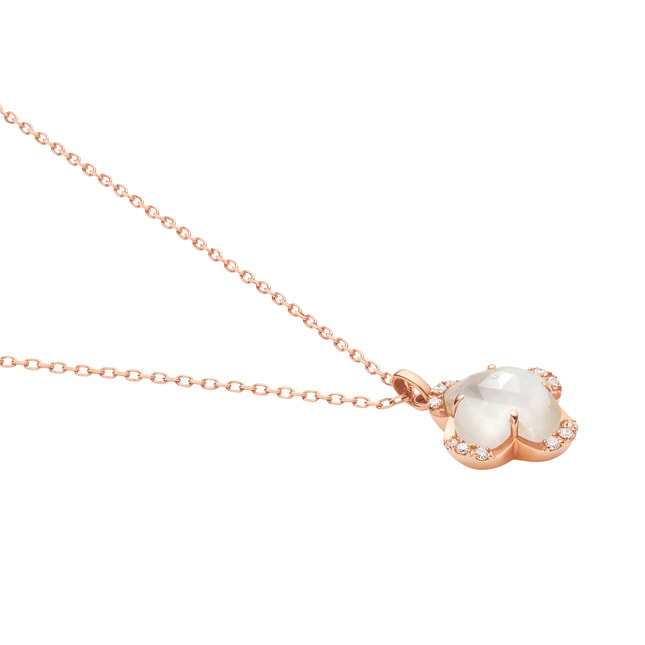 ピンクゴールドにさわやかなシェルとクォーツを組み合わせ、 フェミニンなカラーリングでクローバーを可愛らしく描いたネックレス。