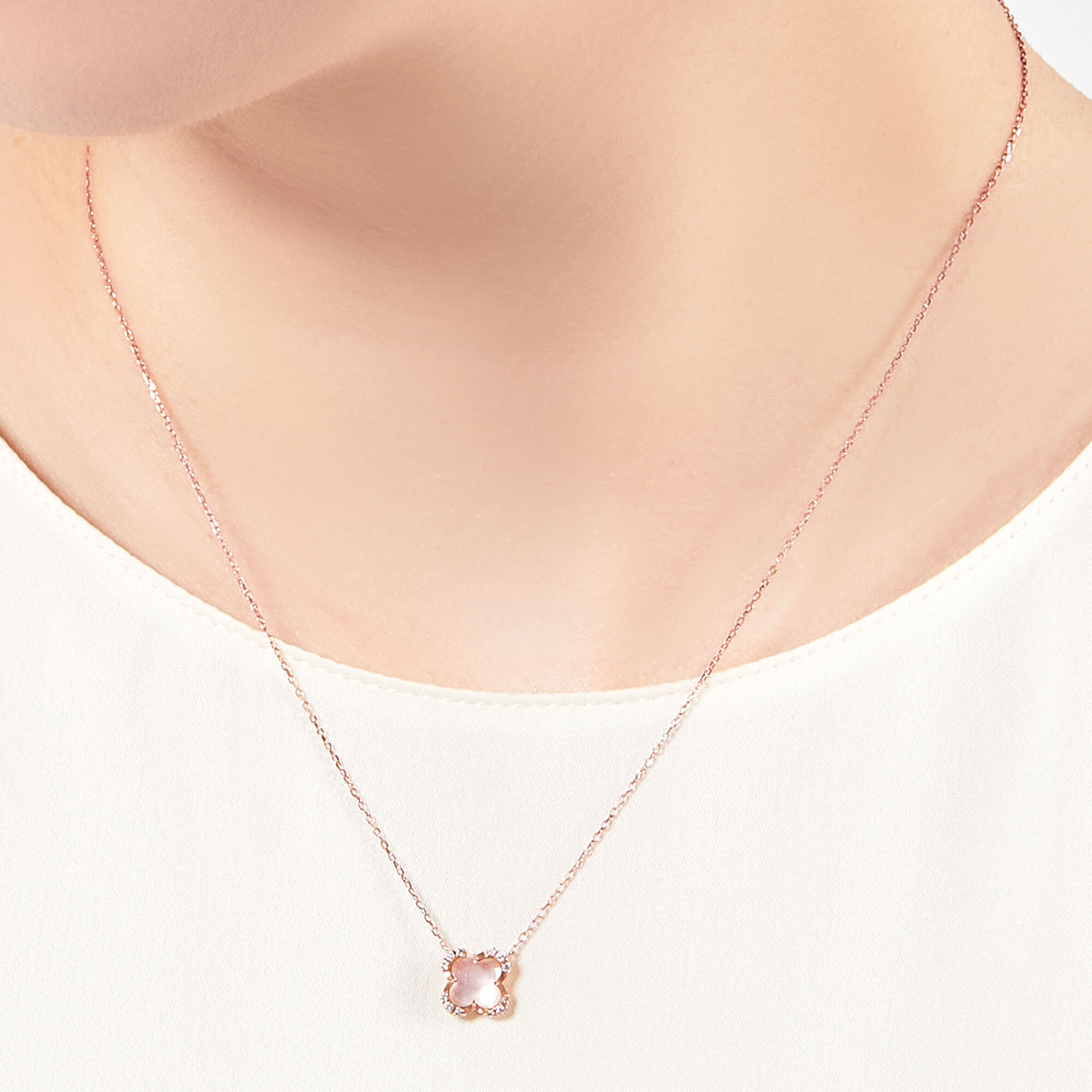 ピンクゴールドにシェルとクォーツを組み合わせたフェミニンなカラーリングでクローバーを可愛らしく描いたネックレス。