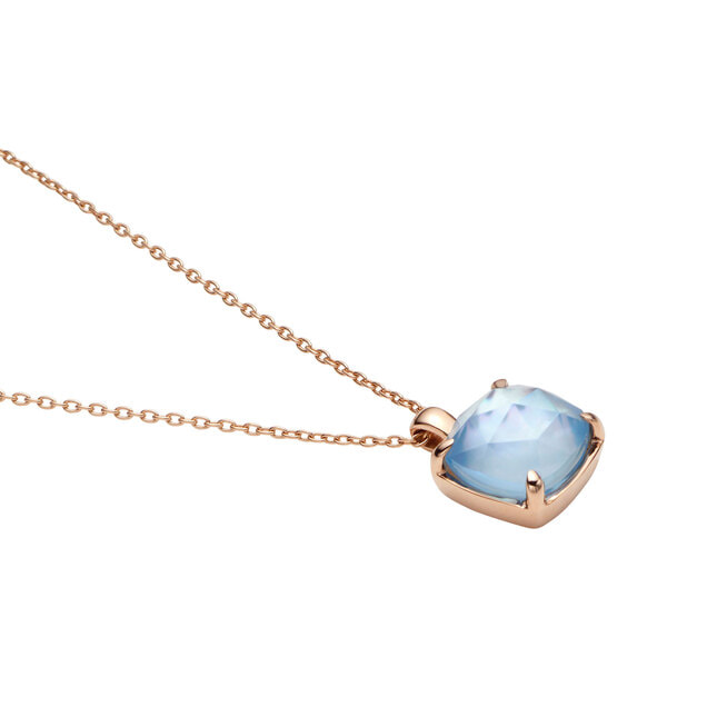 シェルの上にスカイブルートパースを重ねられ、明るいブルーの奥にやわらかさのあるシェルの輝きが透けて見えるネックレス。