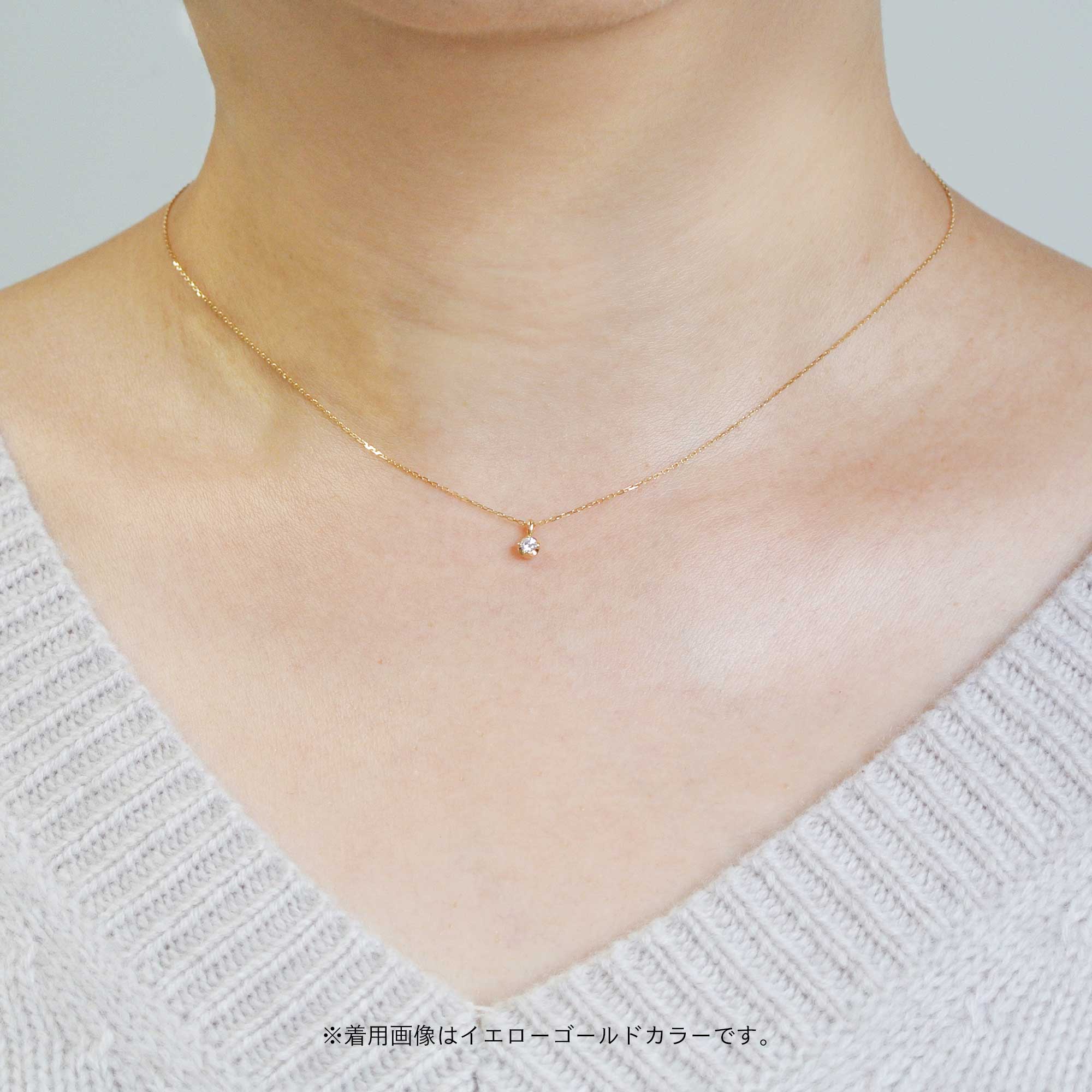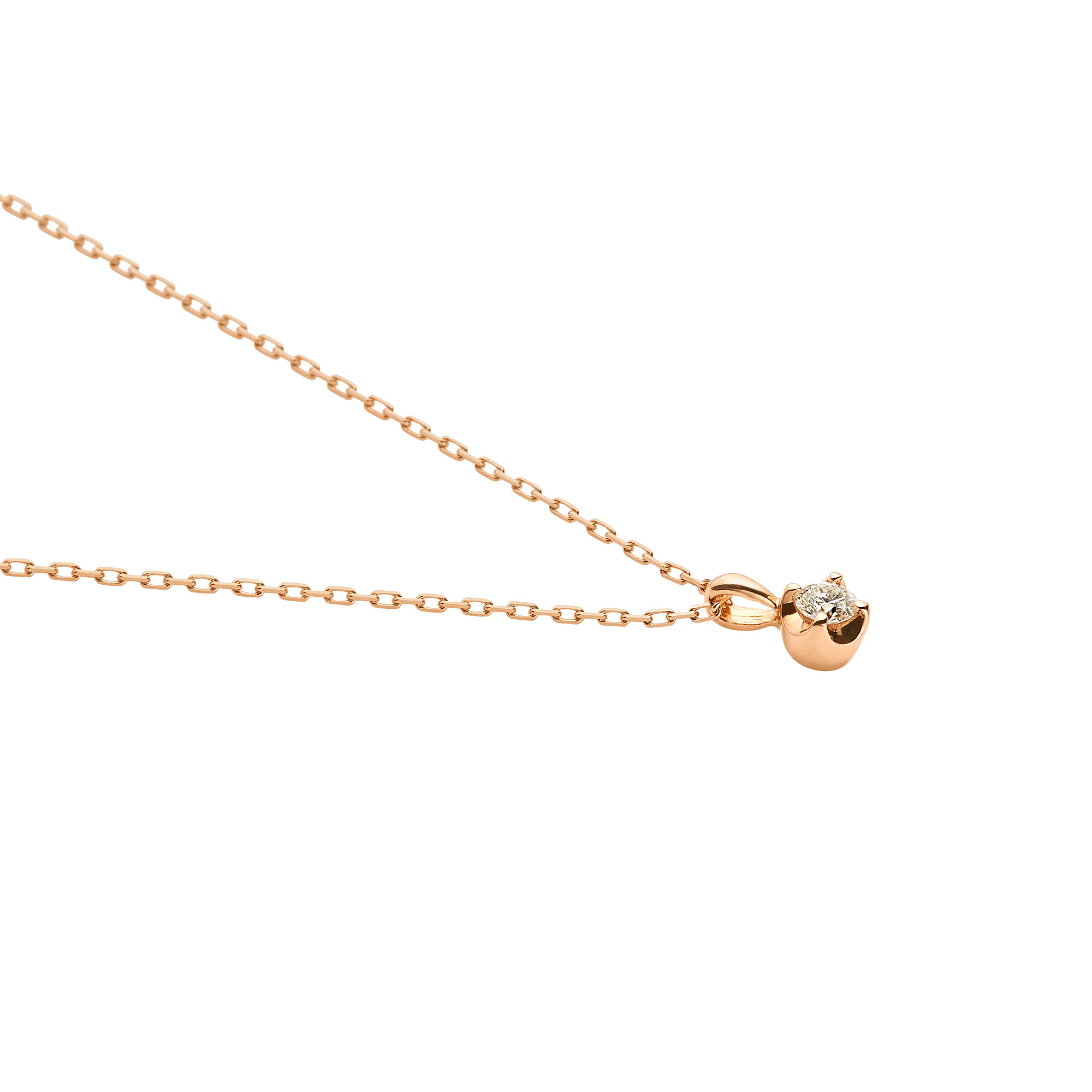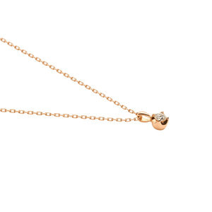 ピンクゴールドの縁取りがダイヤモンドの存在感を際立たせ、シンプルなデザインながらも胸元を明るく演出します。