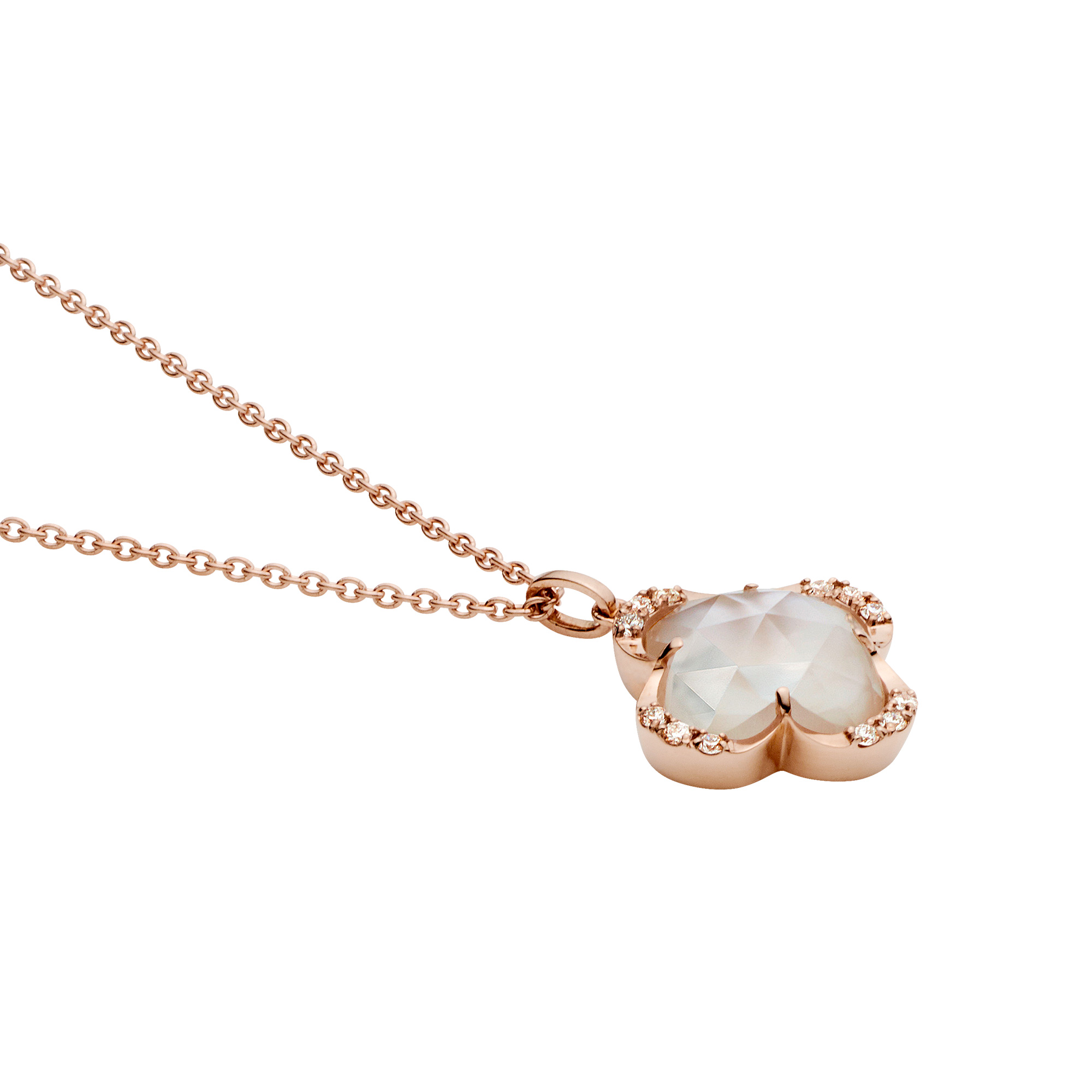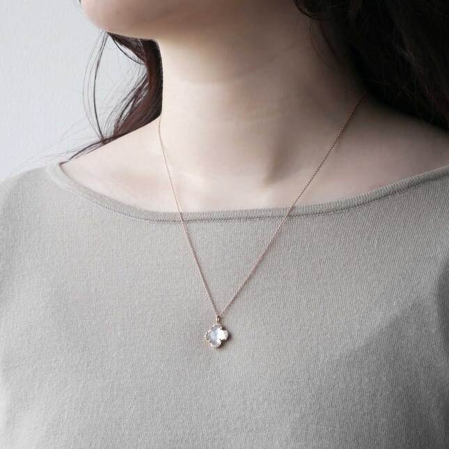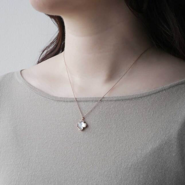 ピンクゴールドにさわやかなシェルとクォーツを組み合わせ、 フェミニンなカラーリングでクローバーを可愛らしく描いたネックレス。