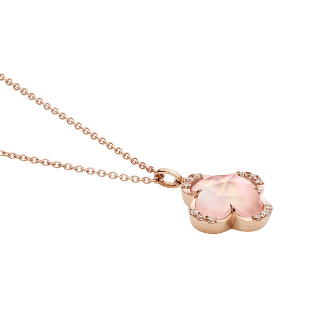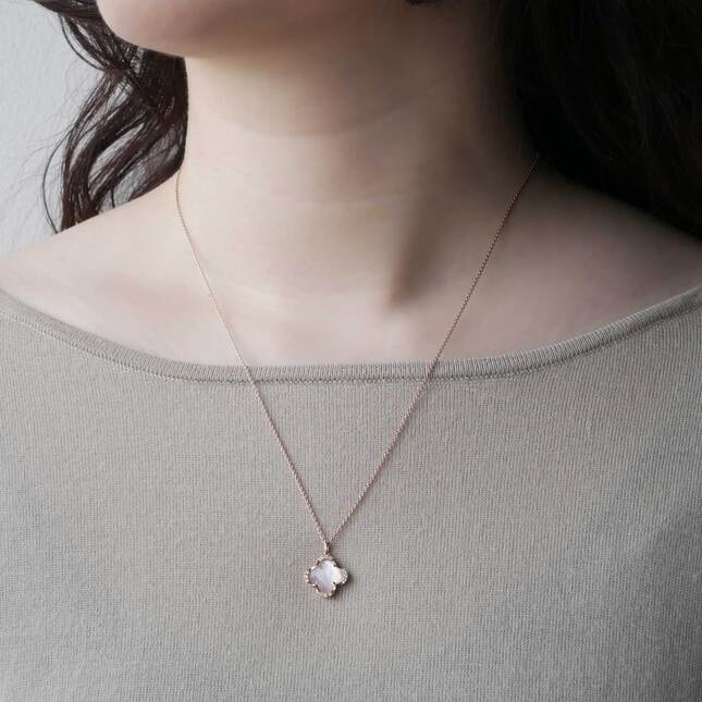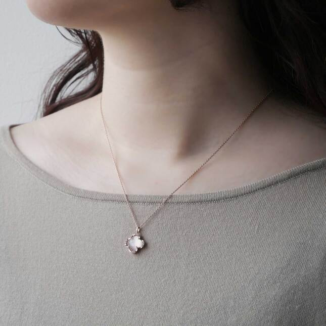 ピンクゴールドにさわやかなシェルとローズクォーツを組み合わせ、 フェミニンなカラーリングでクローバーを可愛らしく描いたネックレス。