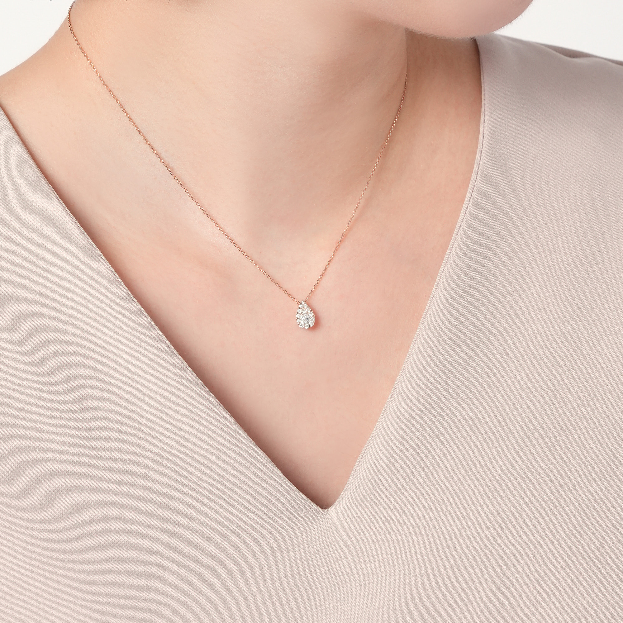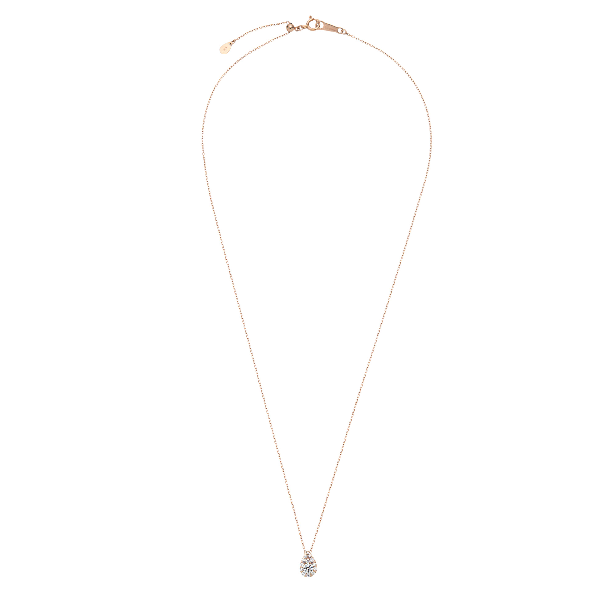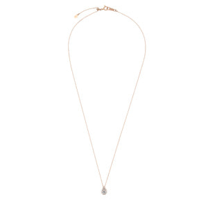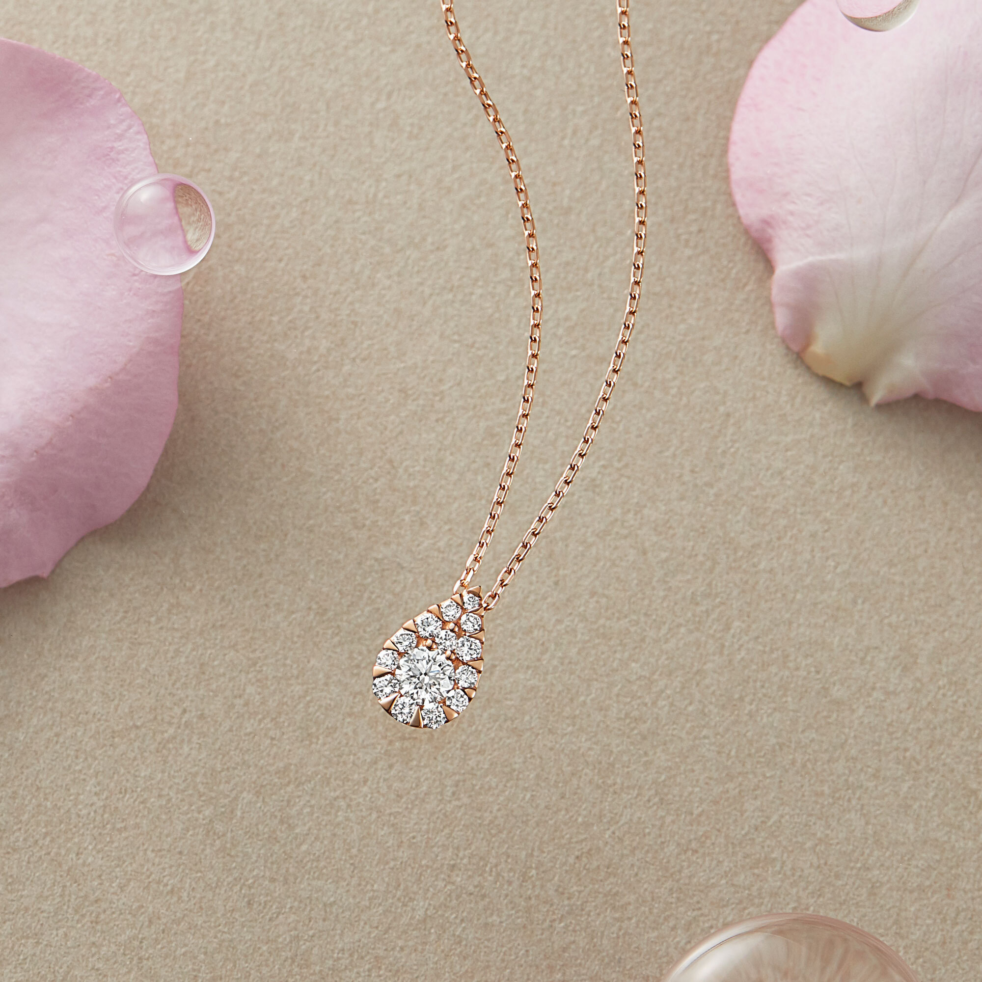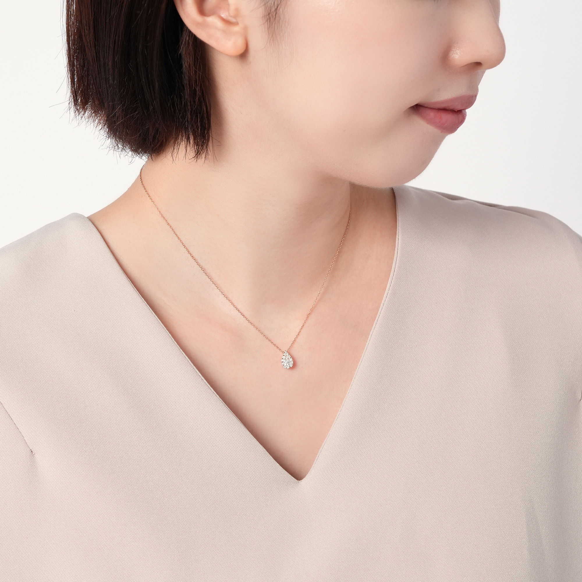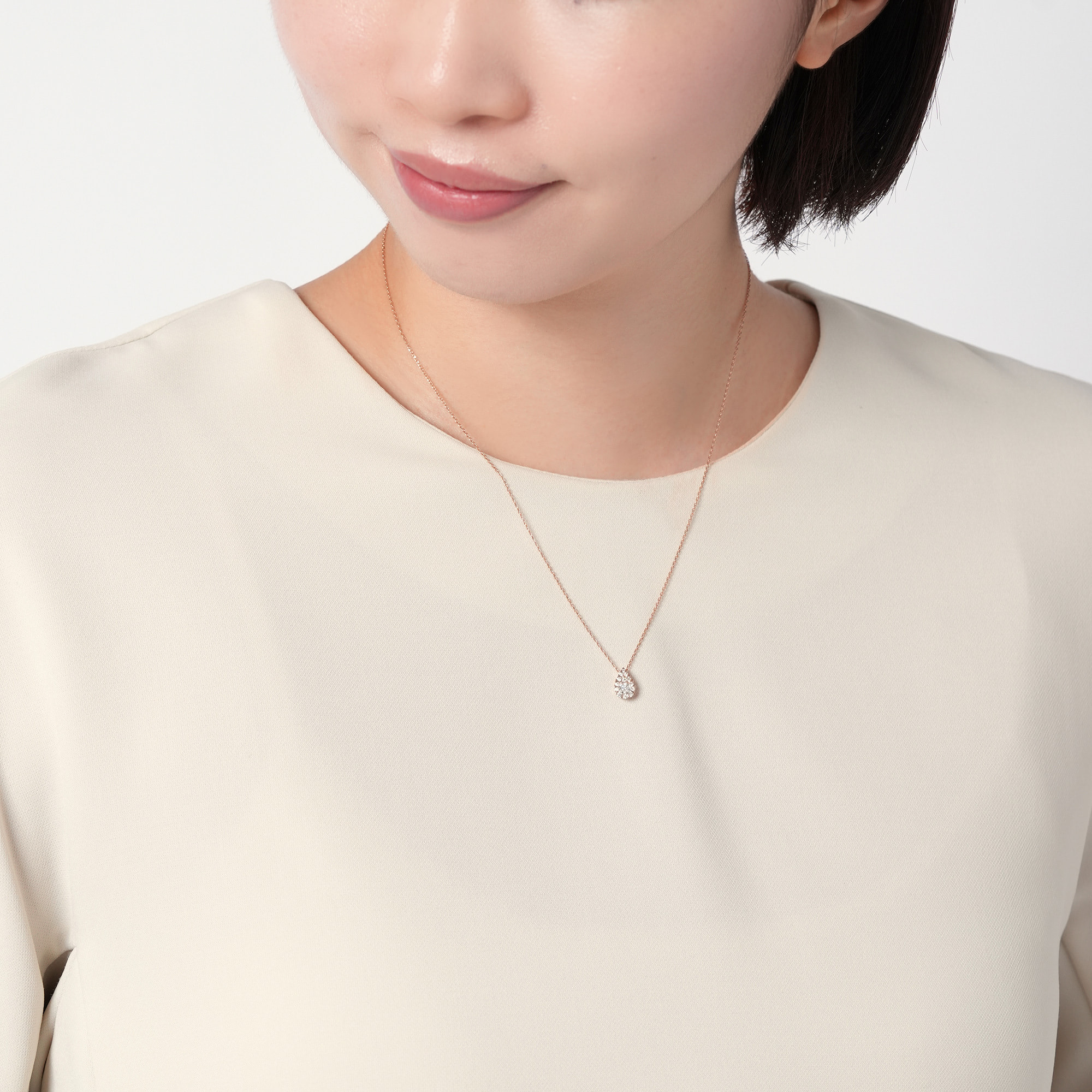 センターのダイヤモンドに爪を使わず、周囲のメレダイヤモンドで押さえて留めることで生まれる一体感ある強い輝きが魅力のネックレス。