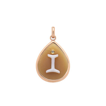 カメオの表面には、K18イエローゴールド台にセッティングされたダイヤモンドがイニシャルを装飾し、柔らかな天然の貝の質感に硬質な輝きを添えています。