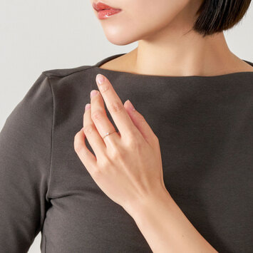 着用の際は、チェーンがねじれていない状態で指を入れ、トップが転がらないよう全体的に少しずつ、指の根元の方におろしていってください。