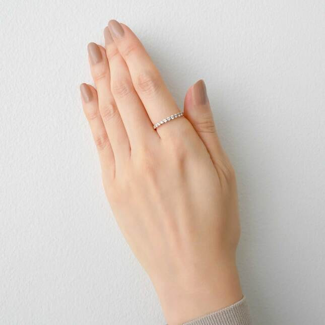 ダイヤモンドの輝きを存分に堪能できる華やかな印象の、爪留めのハーフエタニティリング。