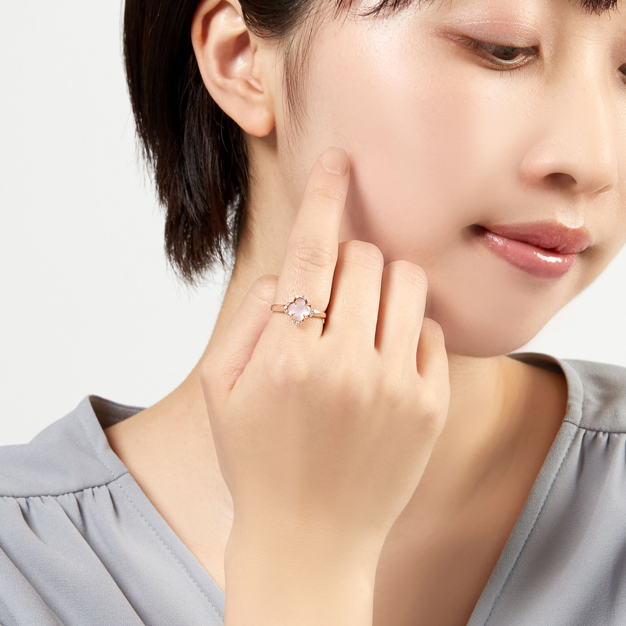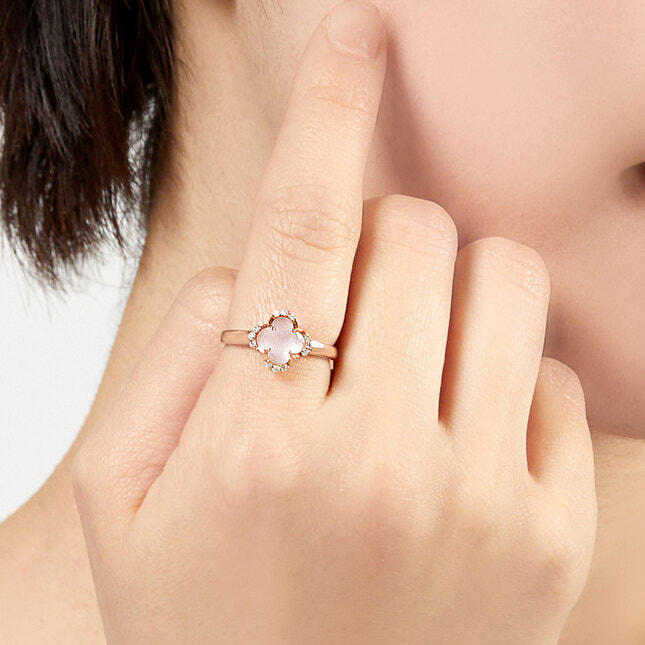 ピンクゴールドにシェルとクォーツを組み合わせたフェミニンなカラーリングでクローバーを可愛らしく描いたリング。
