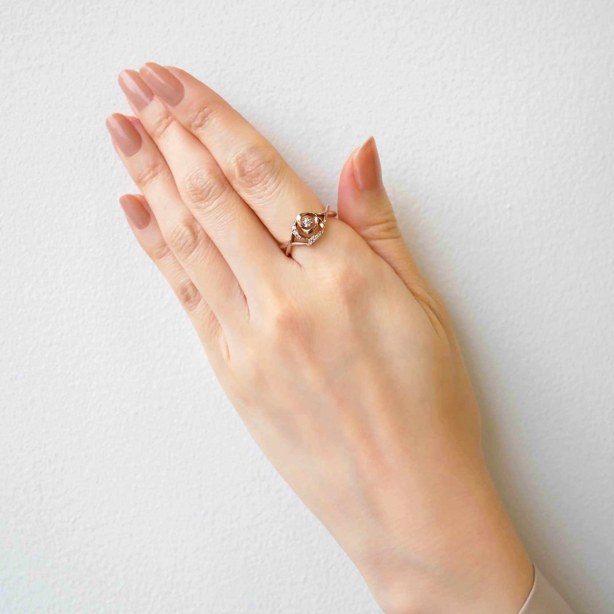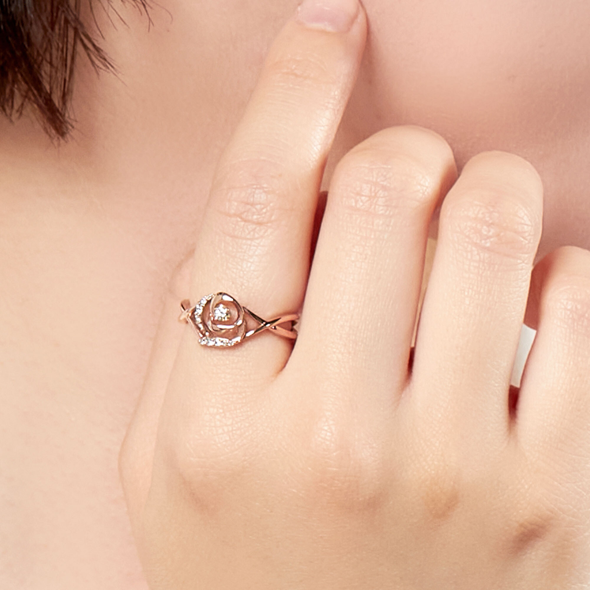 センターに輝くダイヤモンドからふんわりと広がるように描かれた優しいピンクゴールドのラインは、バラの蕾がゆっくりとほどけていくイメージ。なめらかにクロスしたアームが指先を綺麗に見せてくれます。