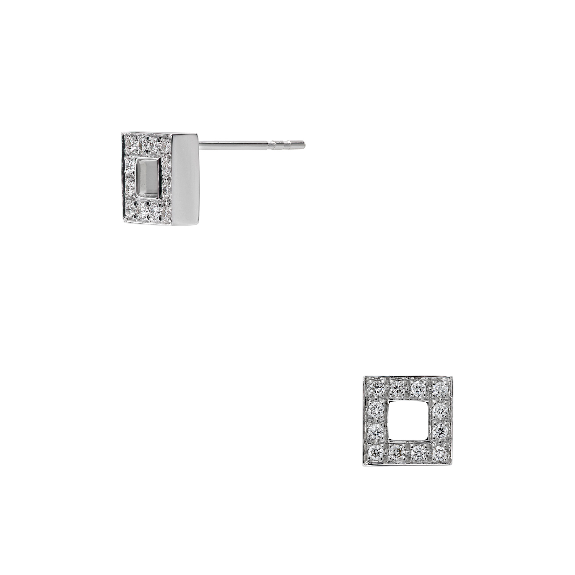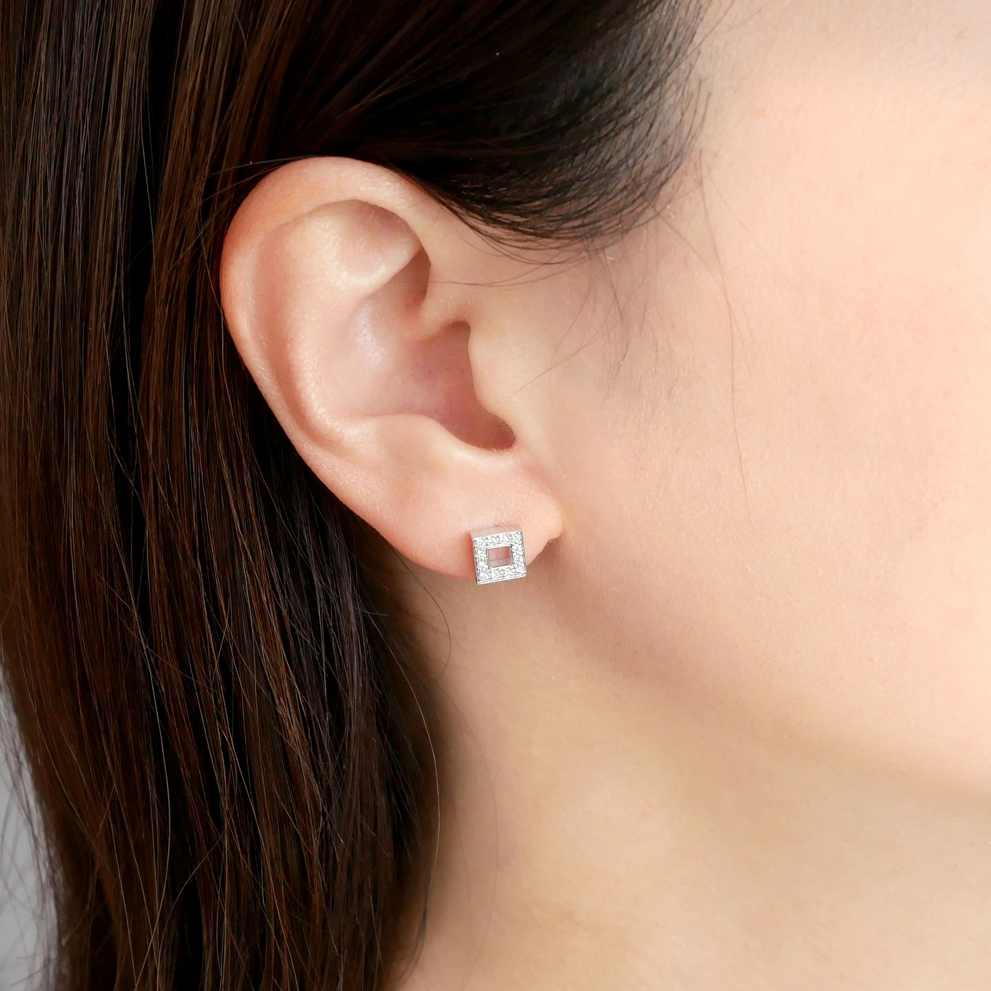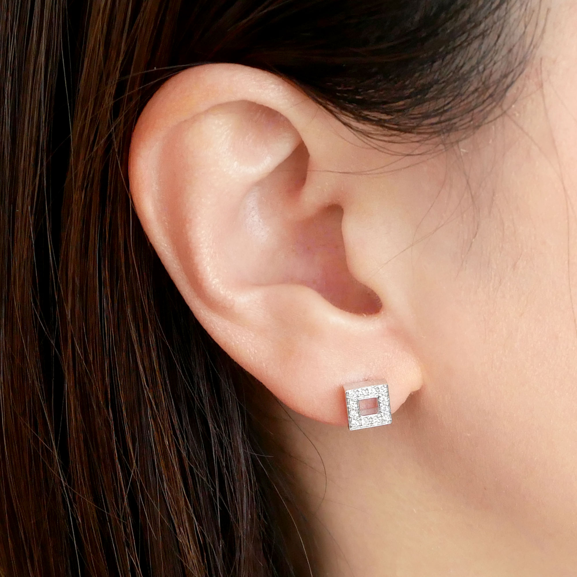 シャープなスクエアモチーフを、ダイヤモンドのきらめきでエレガントにアレンジしたピアスです。