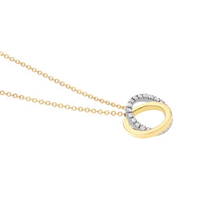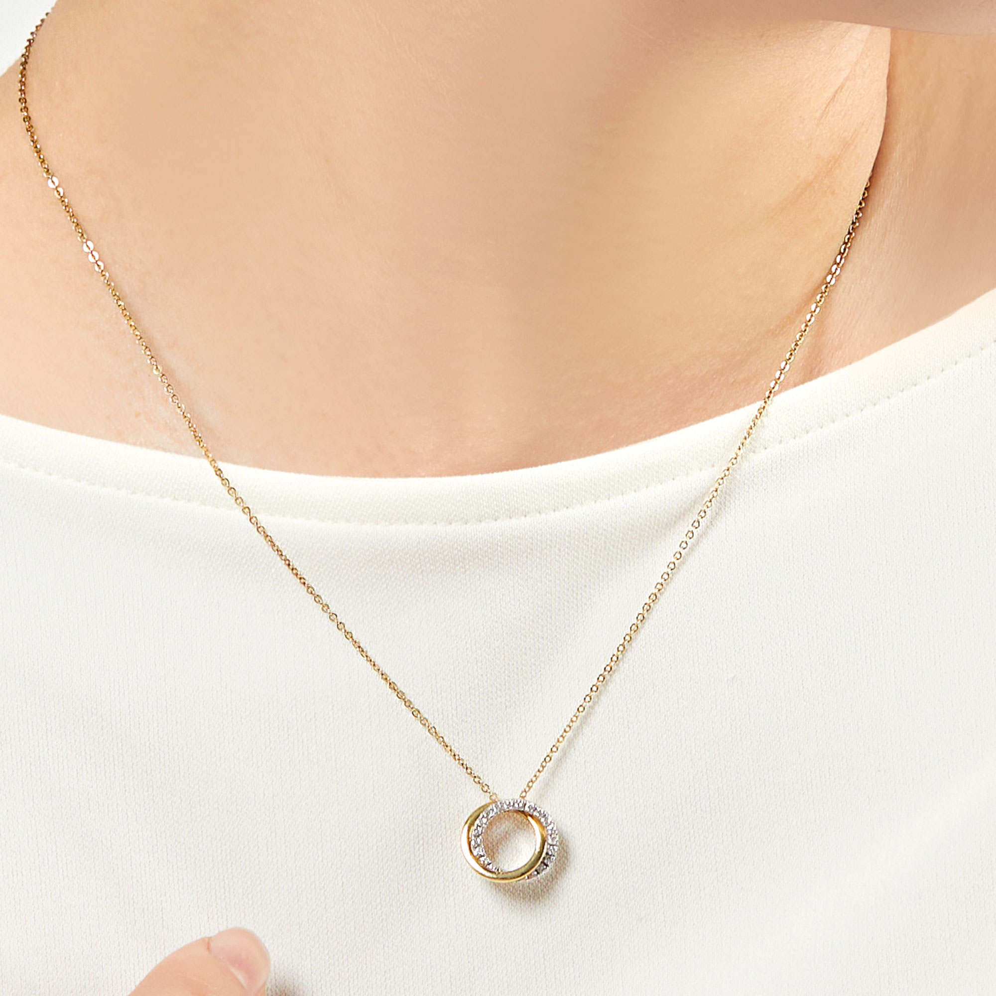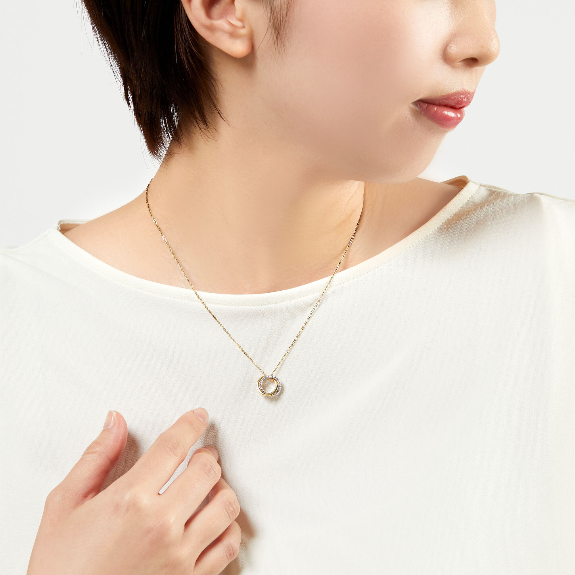地金とダイヤモンドで描いた二つのサークルが軽やかな空気を感じさせる、立体感のあるダブルサークルモチーフのネックレス。