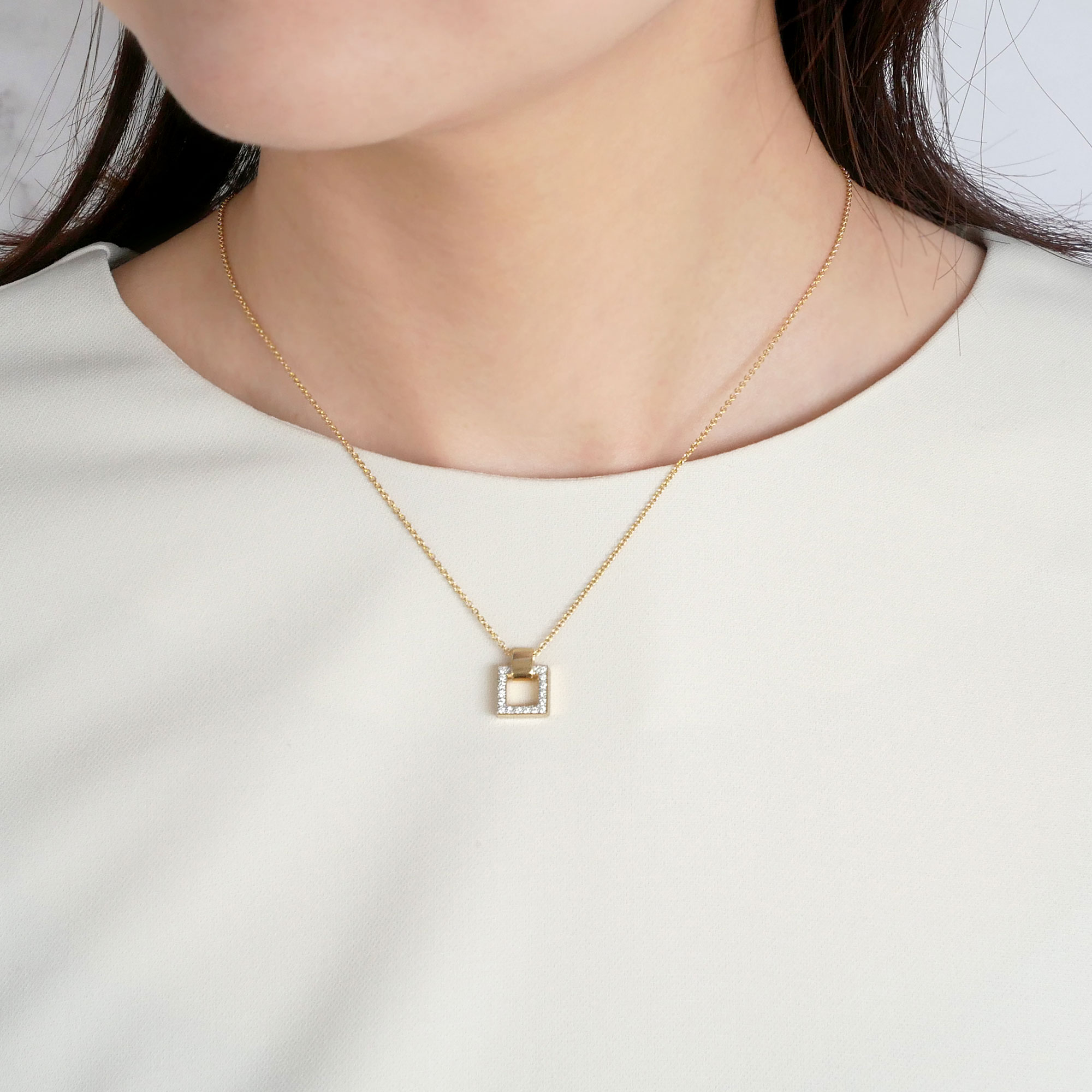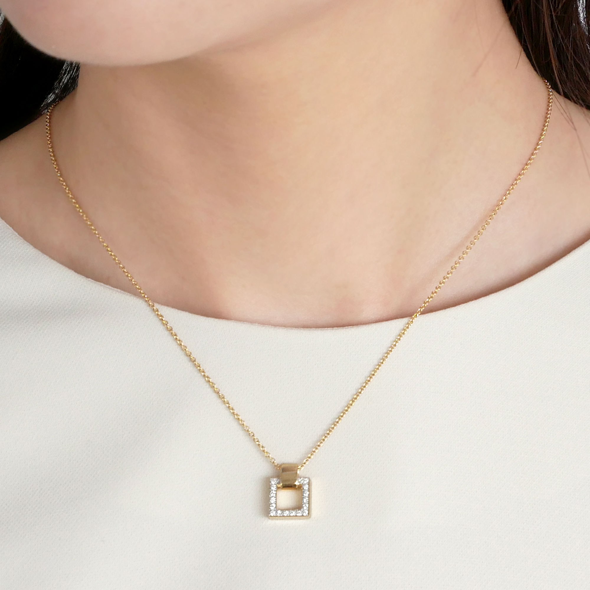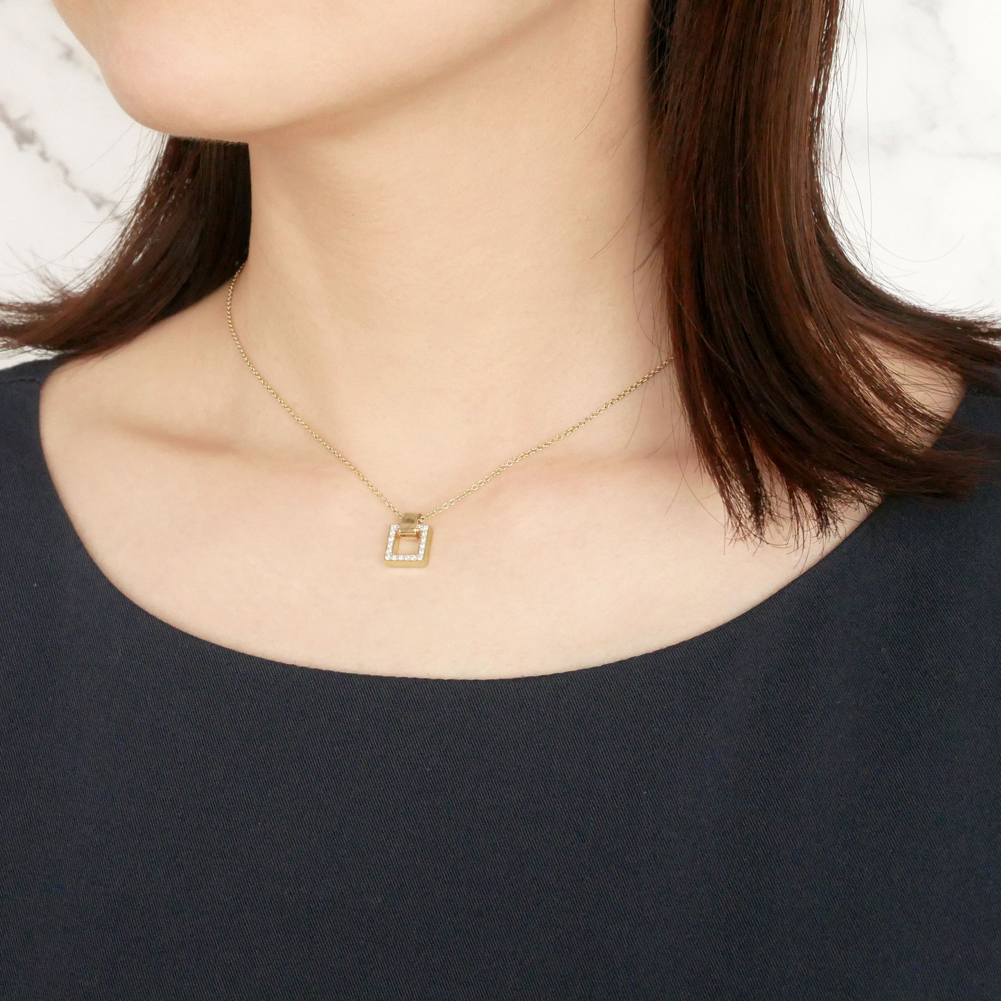 シャープなスクエアモチーフを、ダイヤモンドのきらめきでエレガントにアレンジしたネックレスです。