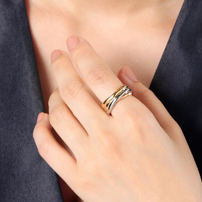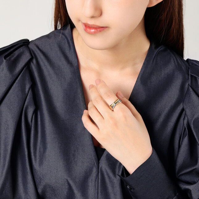 シンプルなデザインながら、それぞれの地金の色が生かされ、表情豊かで華やかな印象をまとわせます。
