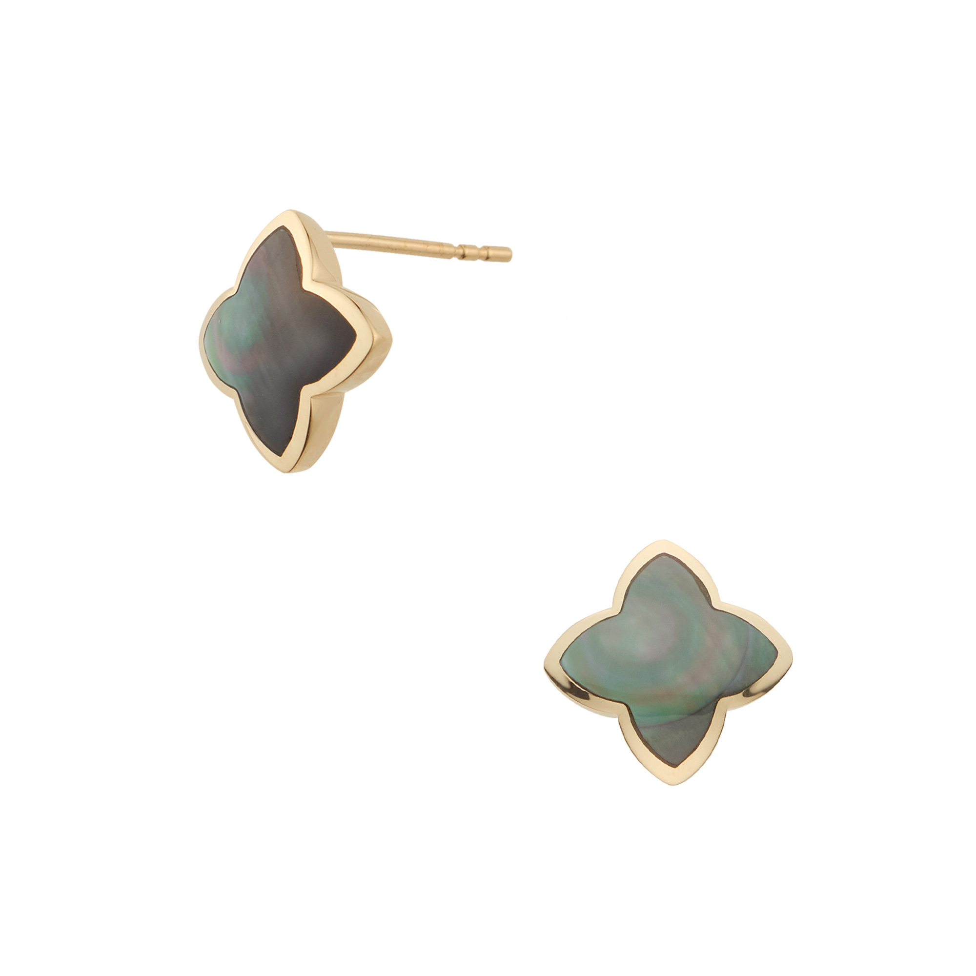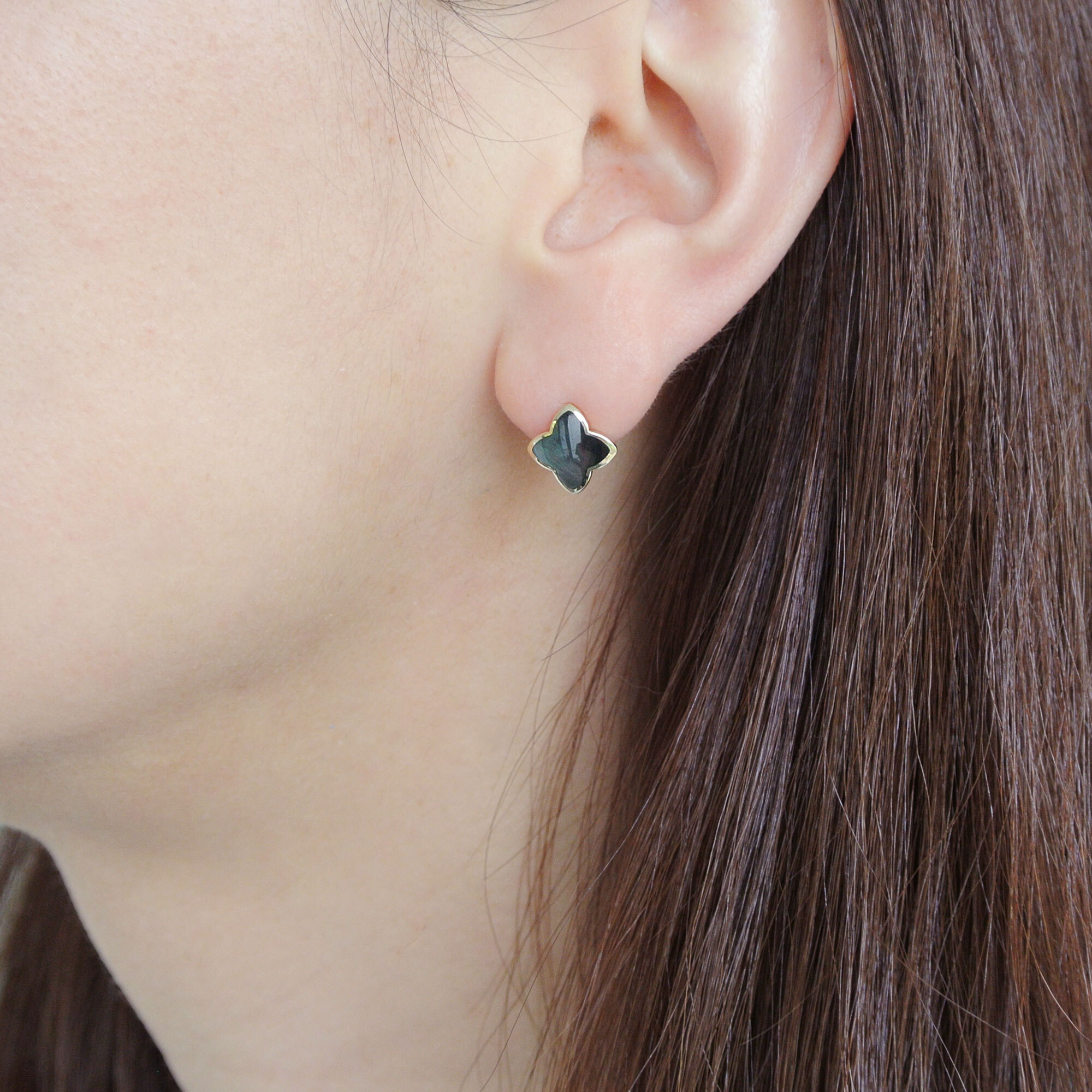 ブラックシェルで象ったモダンなフラワーモチーフのピアス。