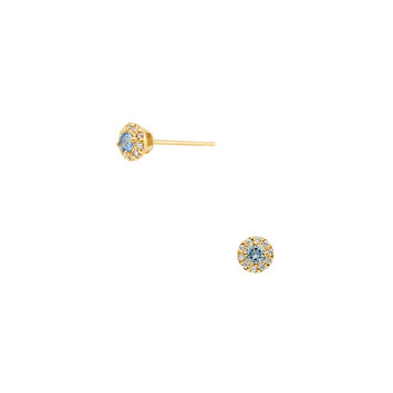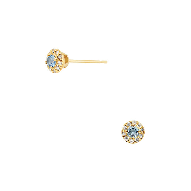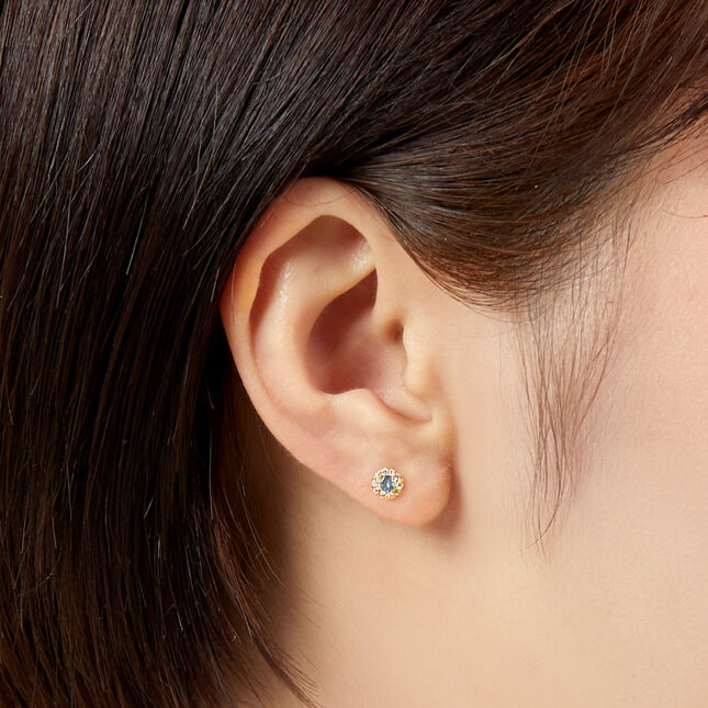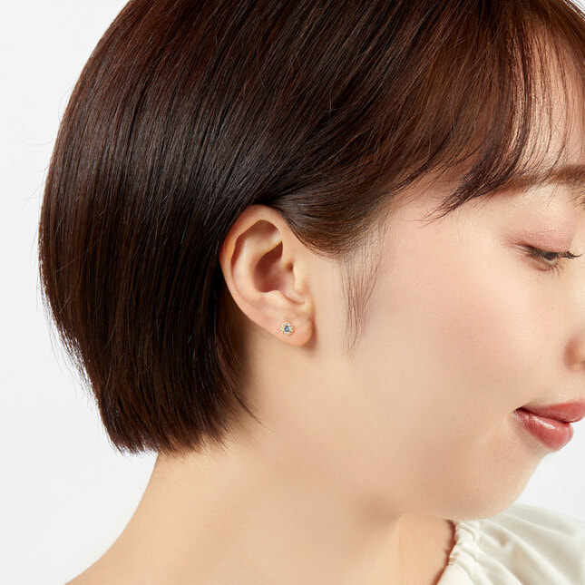 みずみずしく爽やかなアクアマリンをメレダイヤモンドで取り巻いた、さりげなくエレガントなデザインのピアス。