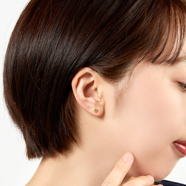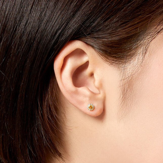 深みのある煌めきが印象的なシトリンをメレダイヤモンドで取り巻いた、さりげなくエレガントなデザインのピアス。