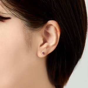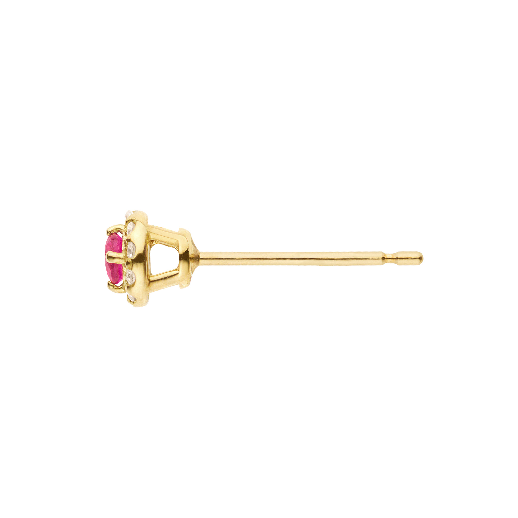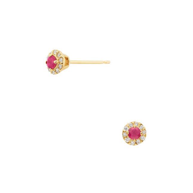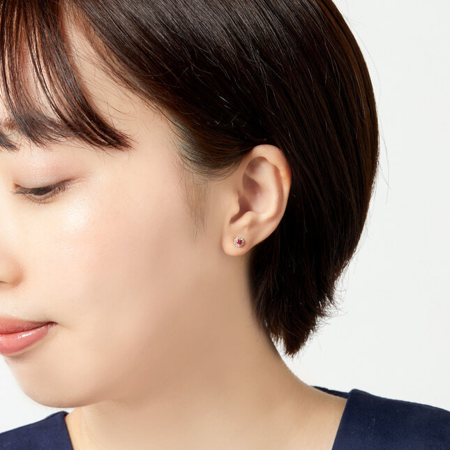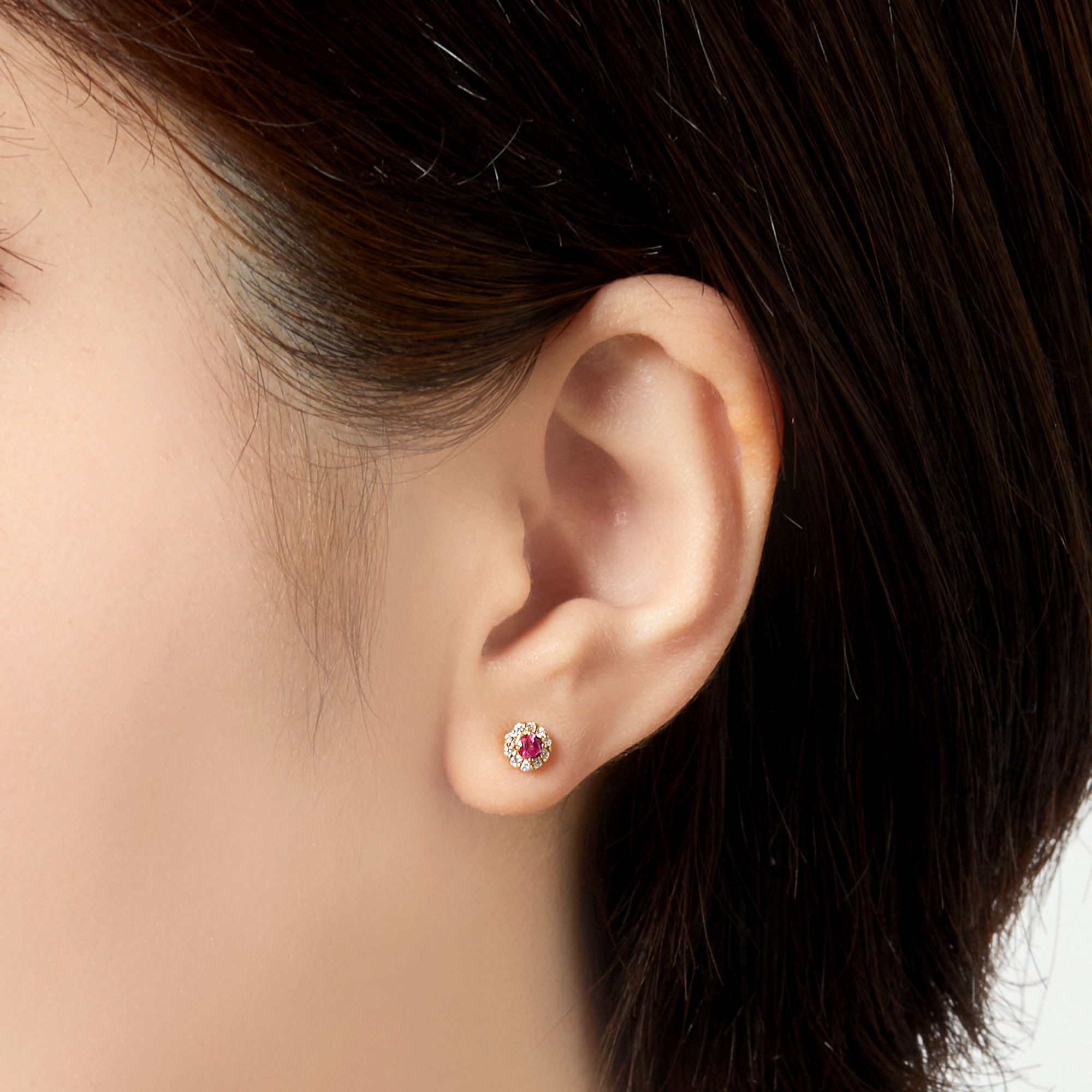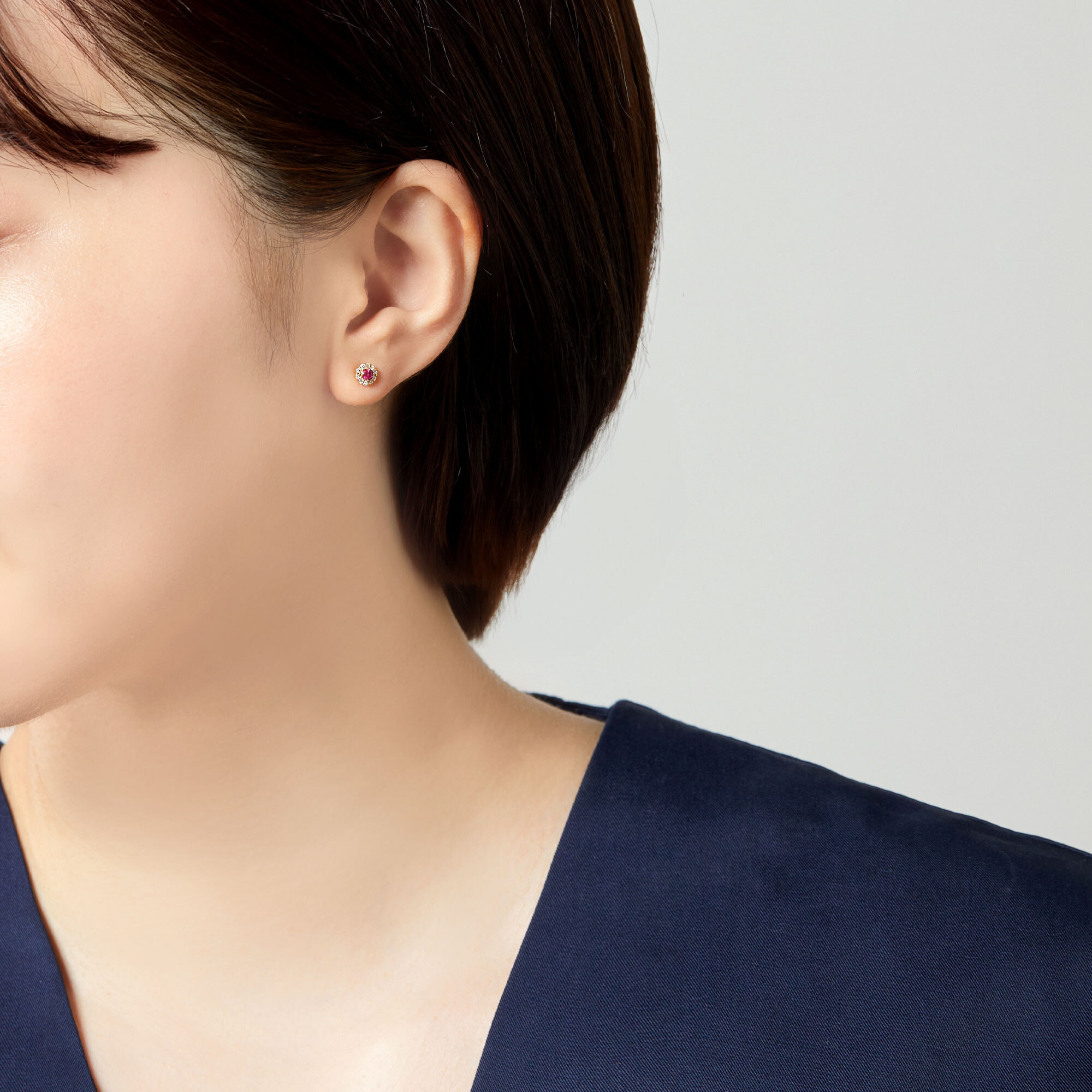 ルビーをメレダイヤモンドで取り巻いた、ベーシックでさりげなくエレガントなデザイン。