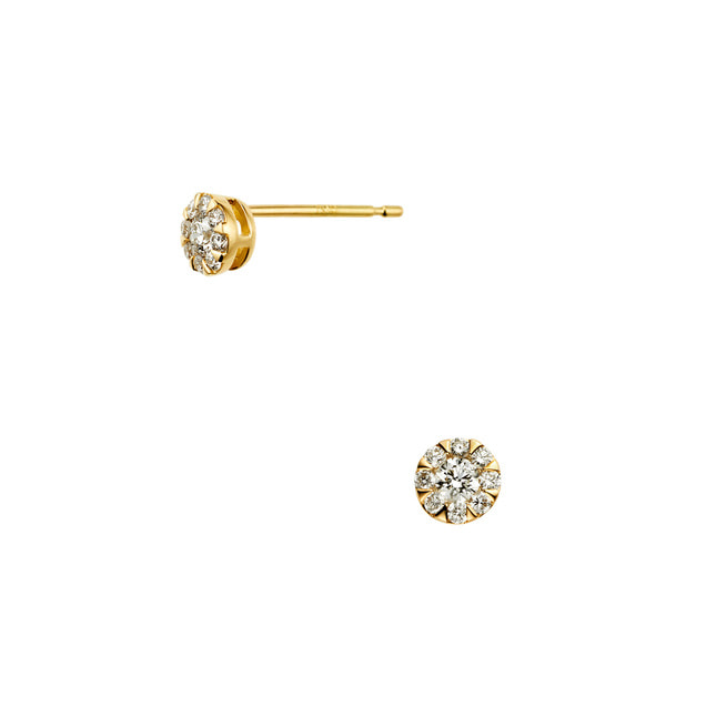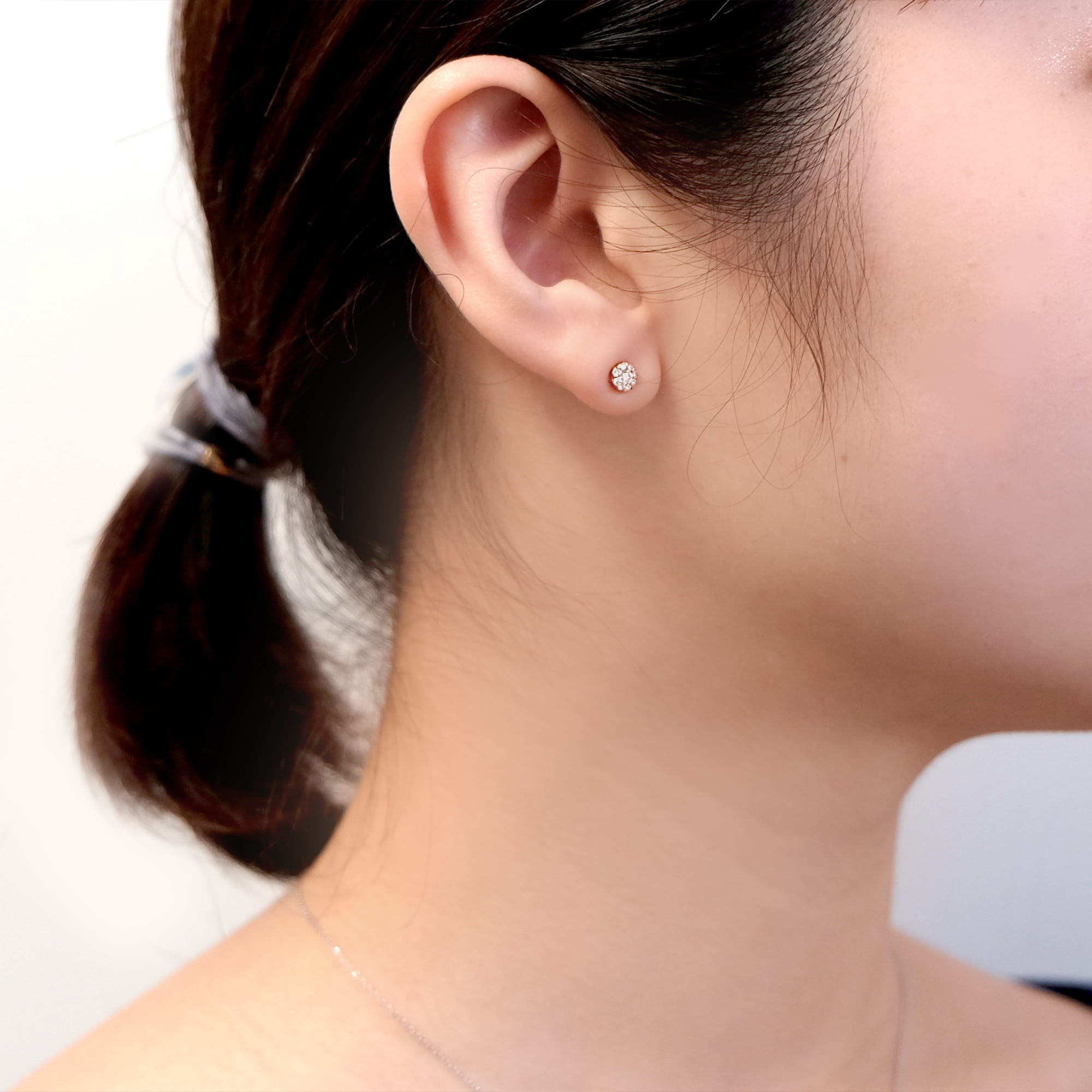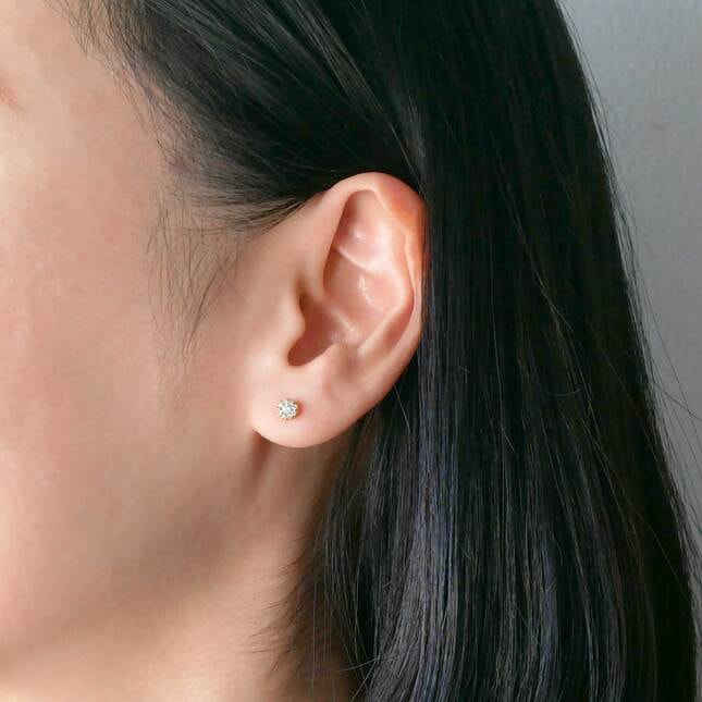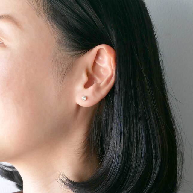 センターのダイヤモンドの周りをフラワーリースのようなメレダイヤモンドで縁取った、存在感のある輝きが魅力のピアス。