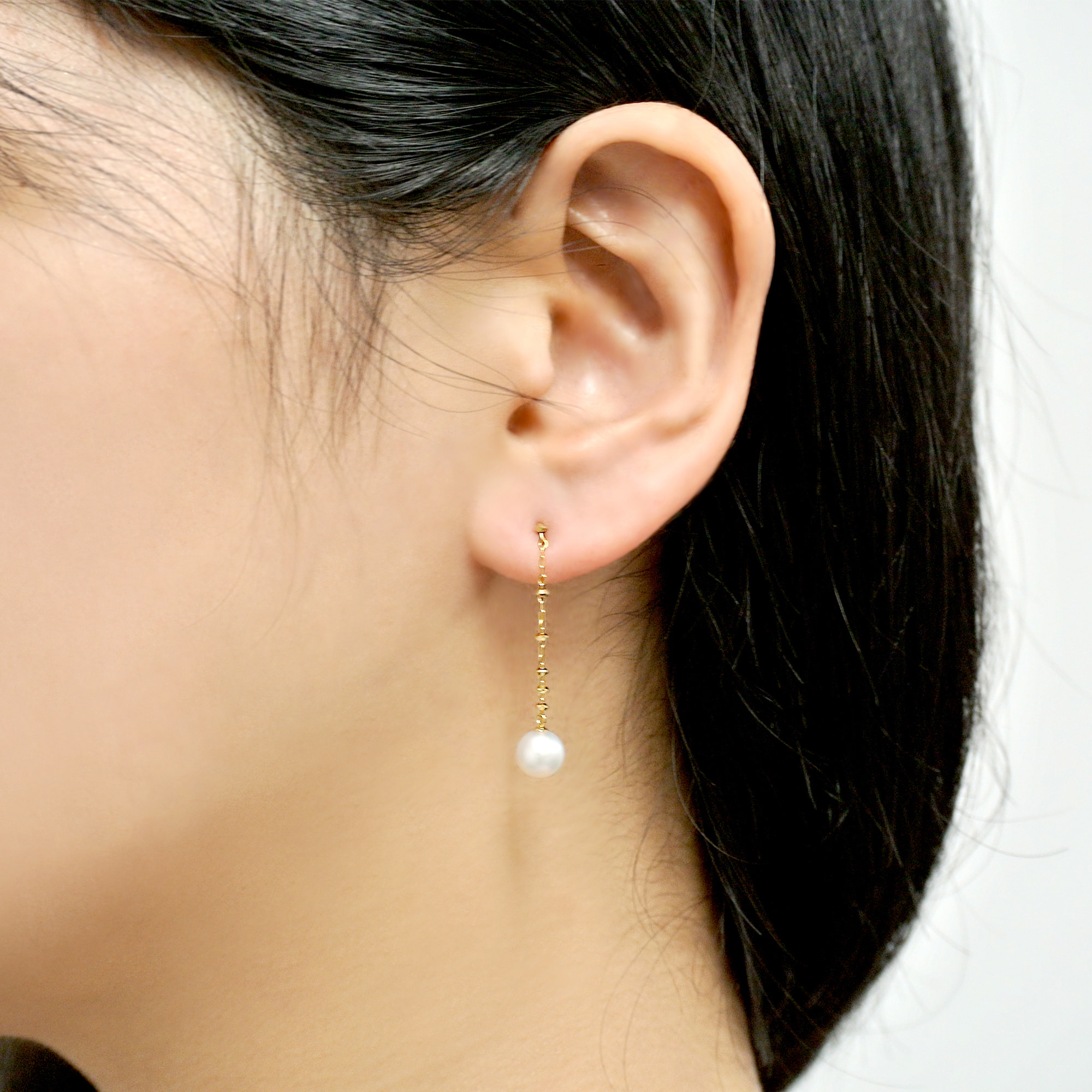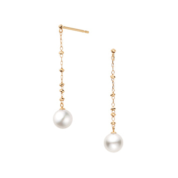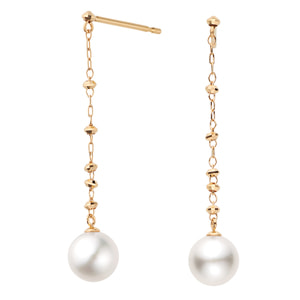 アコヤパールのやわらかい輝きと、華やかなゴールドのコントラストが美しいエレガントなチェーンピアス。