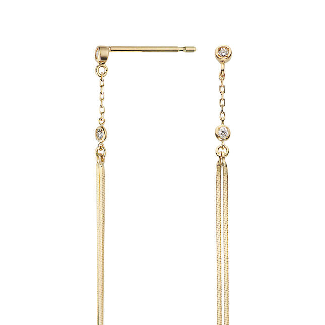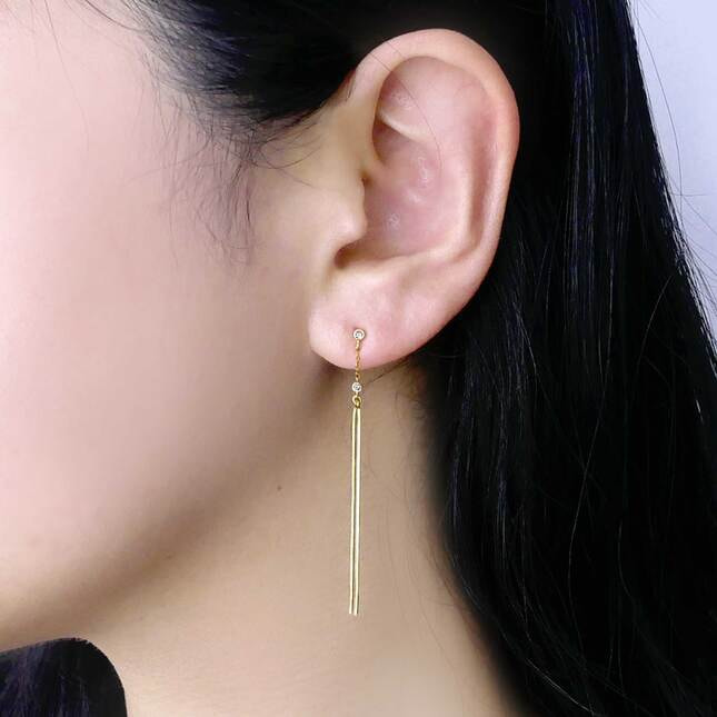 ゴールドで薄く縁取ることでさりげなく輝きを強調し繊細なチェーンで繋ぐことで全体が一筋の光のラインとなって印象的な横顔を演出してくれます。