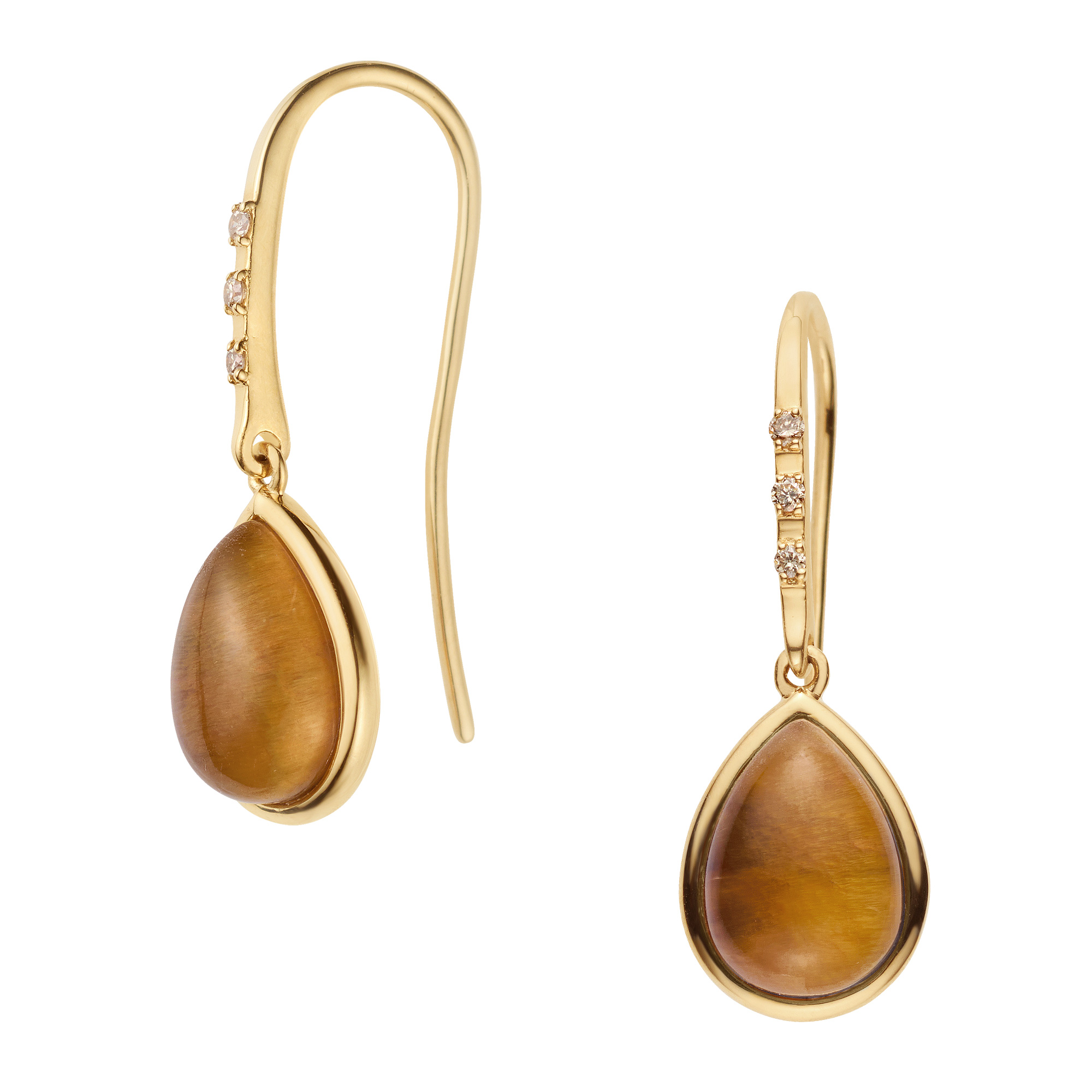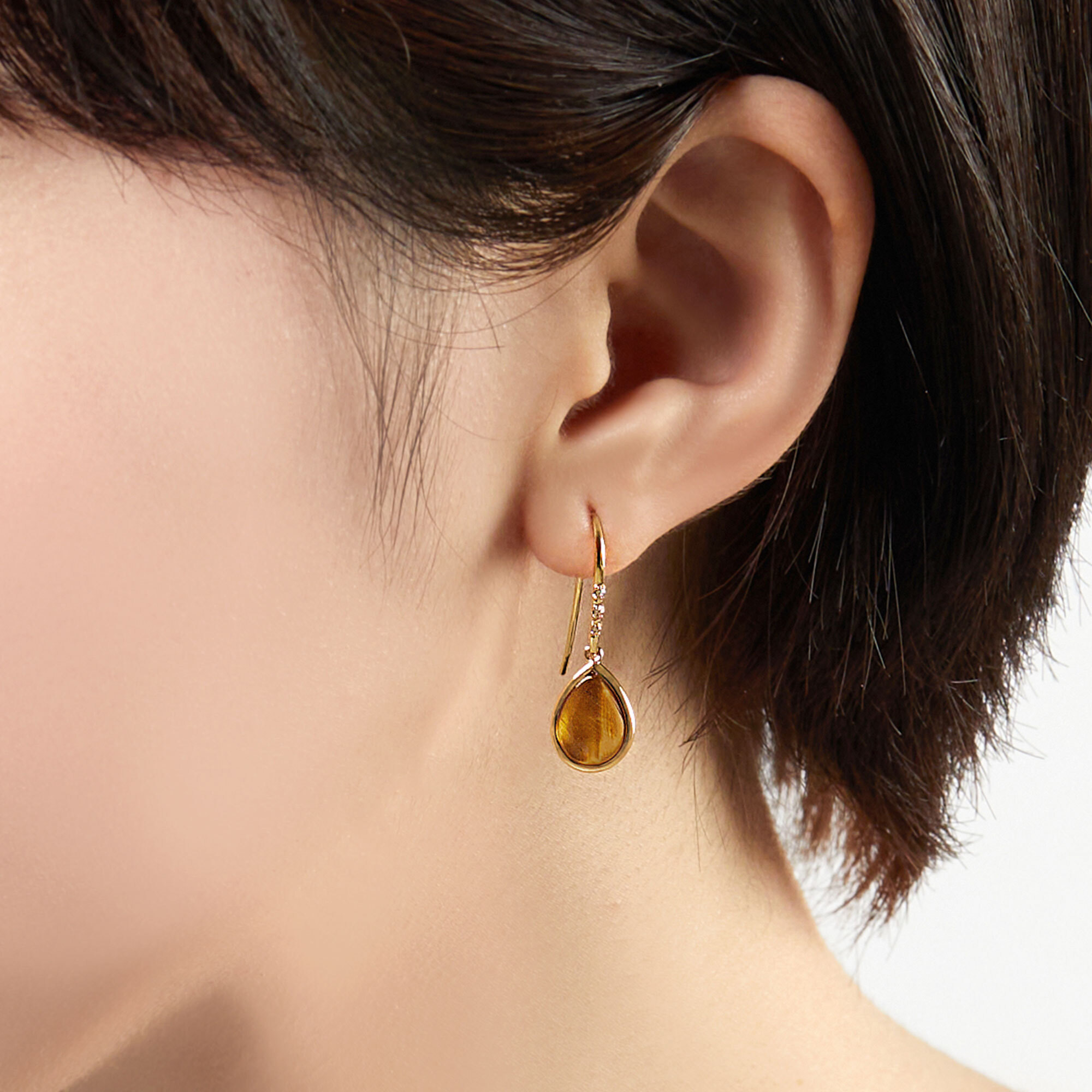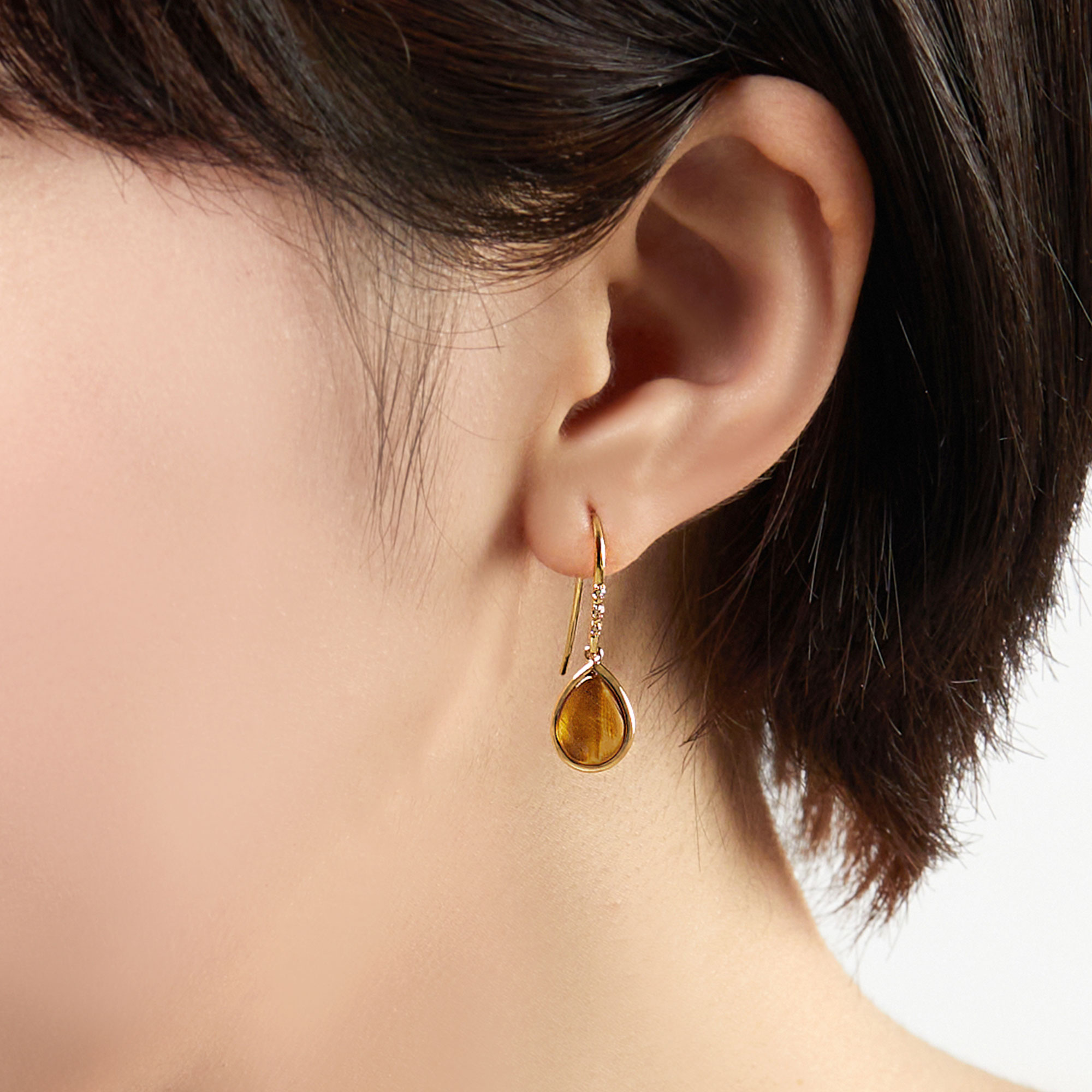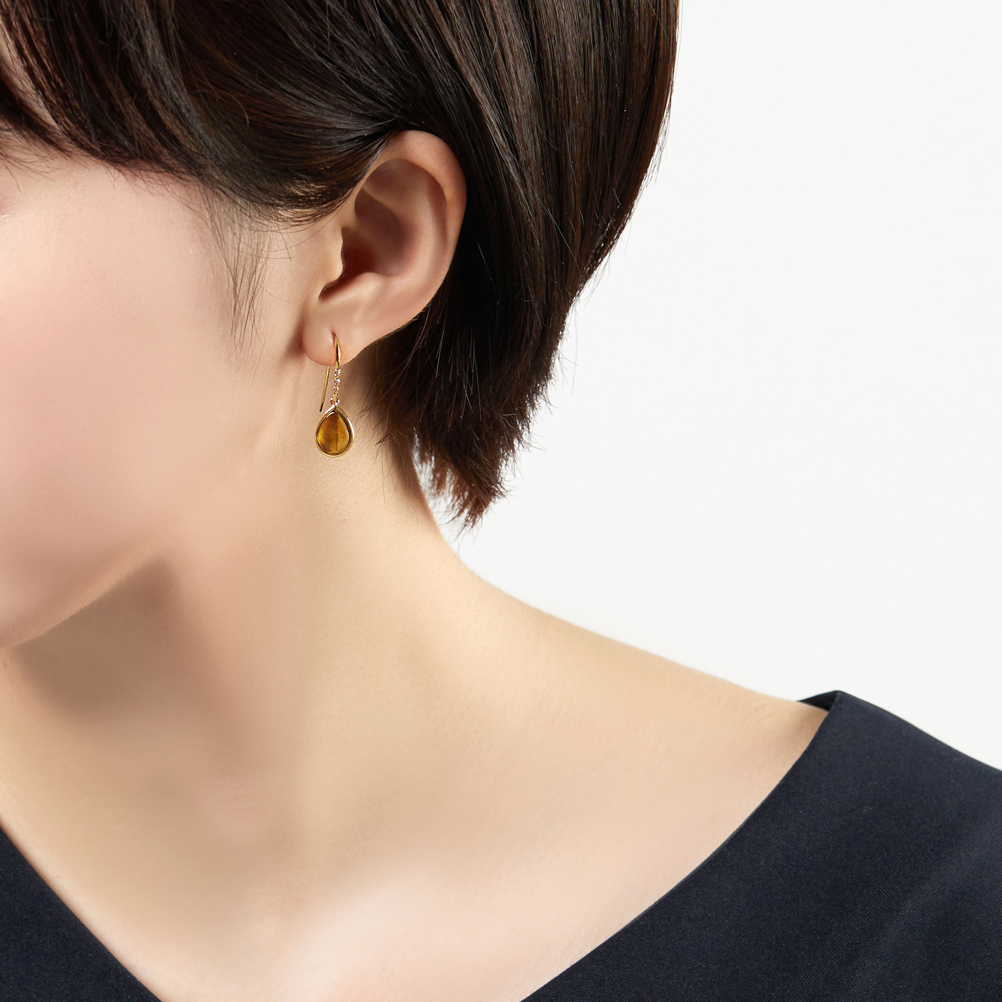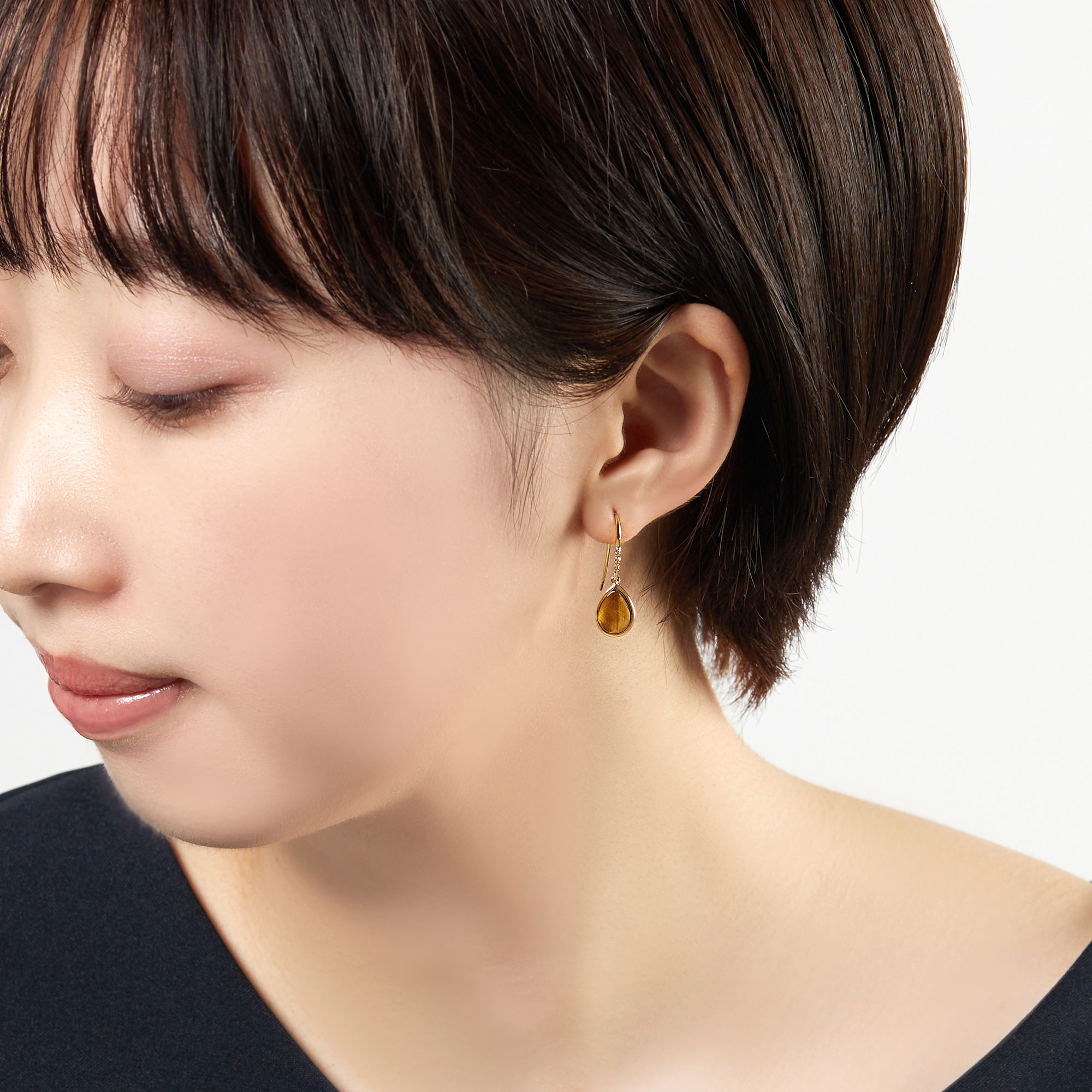 ふっくらとした雫型のフォルムと落ち着いたカラーがリラックスしたムードを醸し出し、フックにあしらわれたブラウンダイヤのきらめきが印象的な横顔を演出。