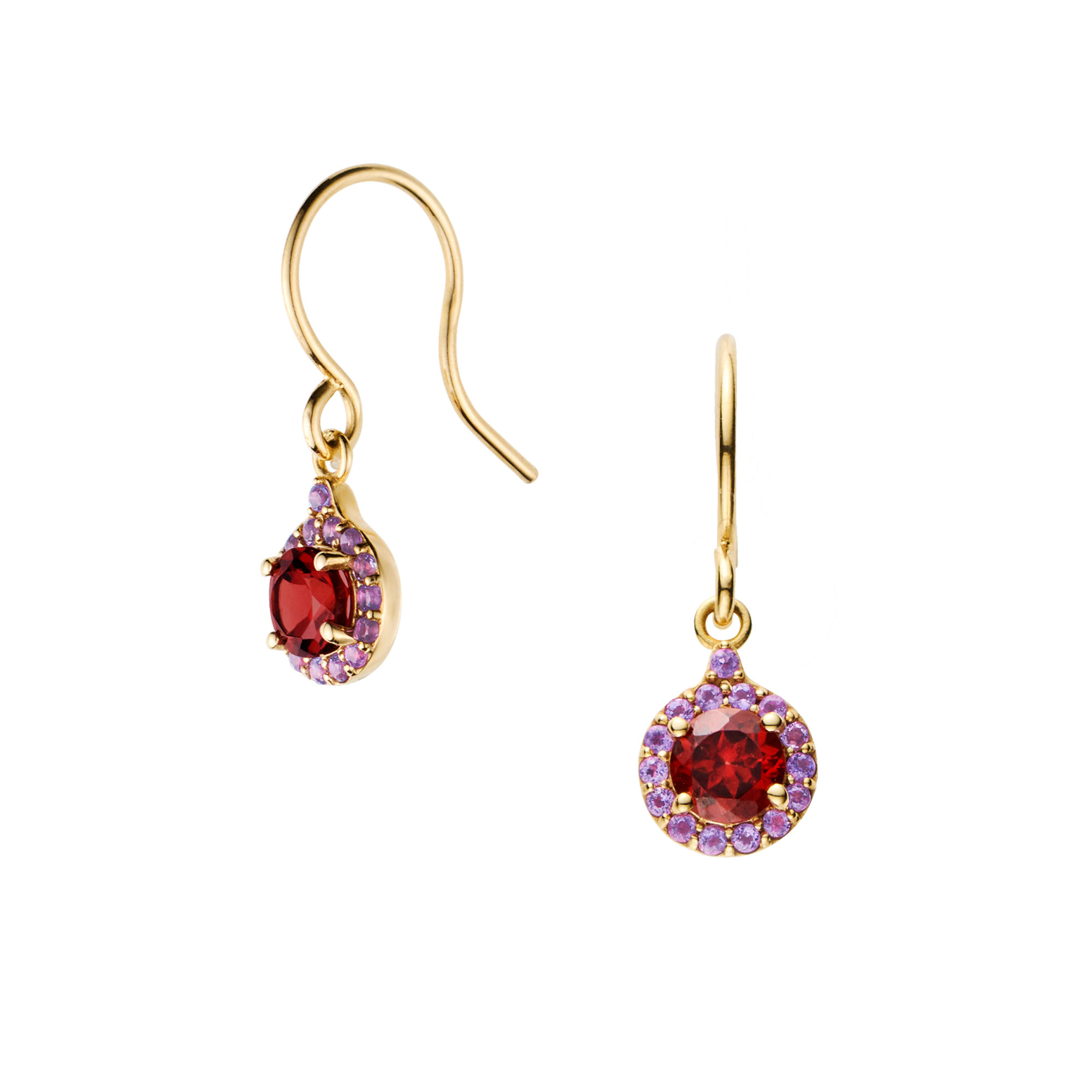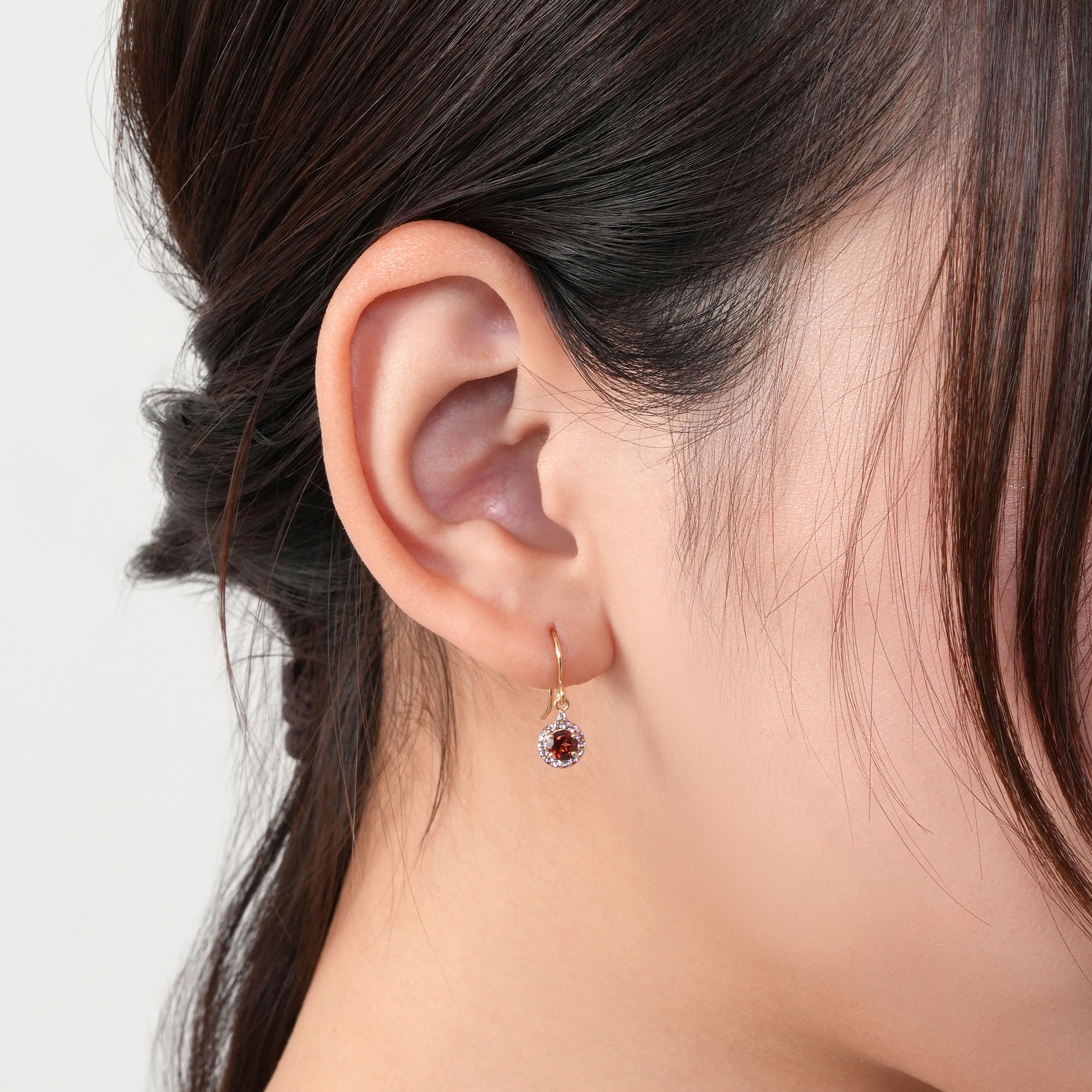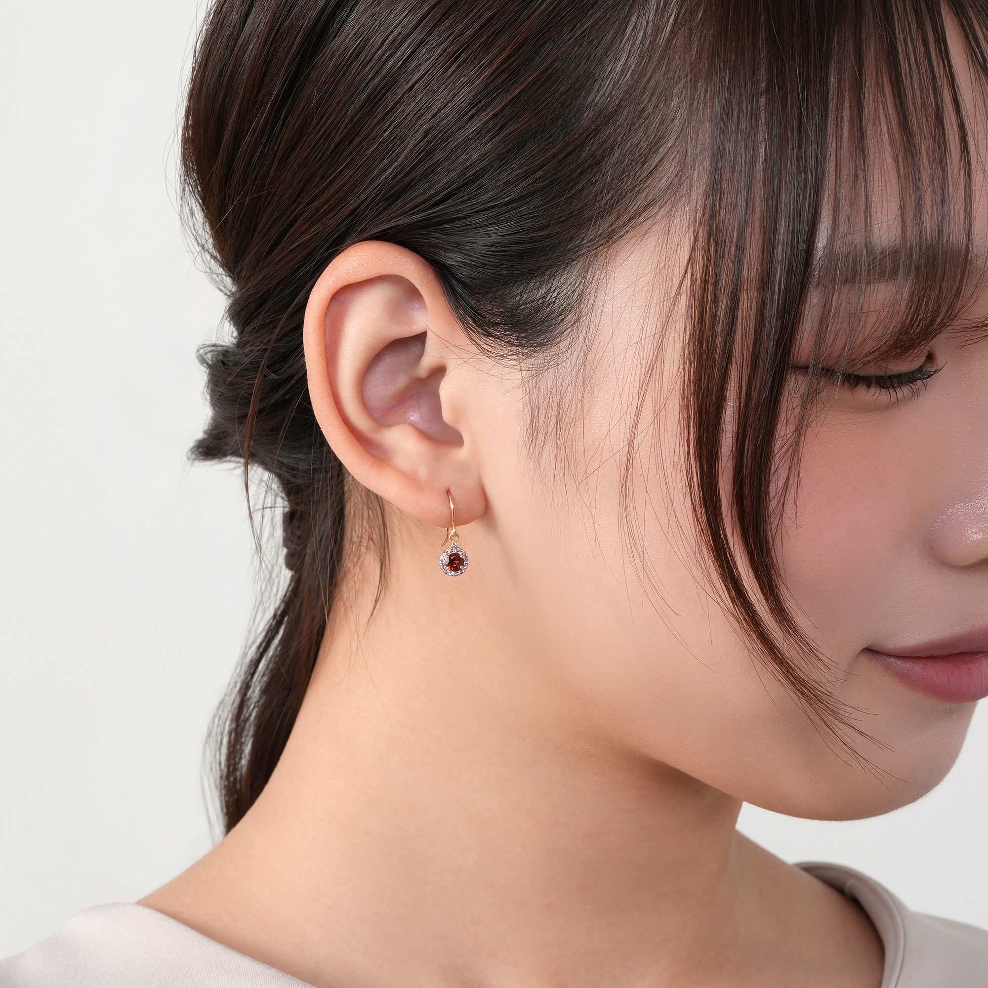 深い赤色のガーネットをアメシストで取り巻いた、インパクトある鮮やかな配色が印象的なピアス。