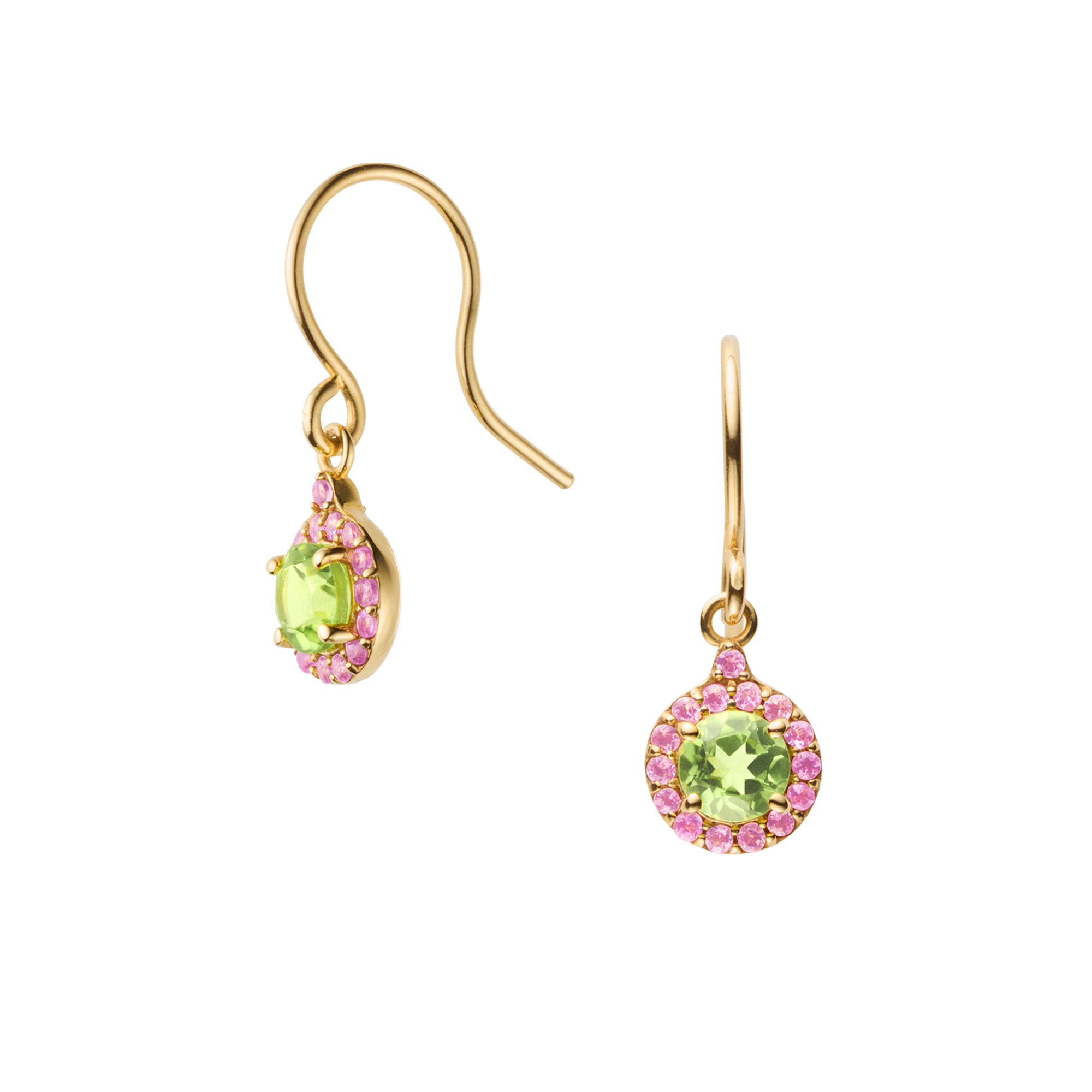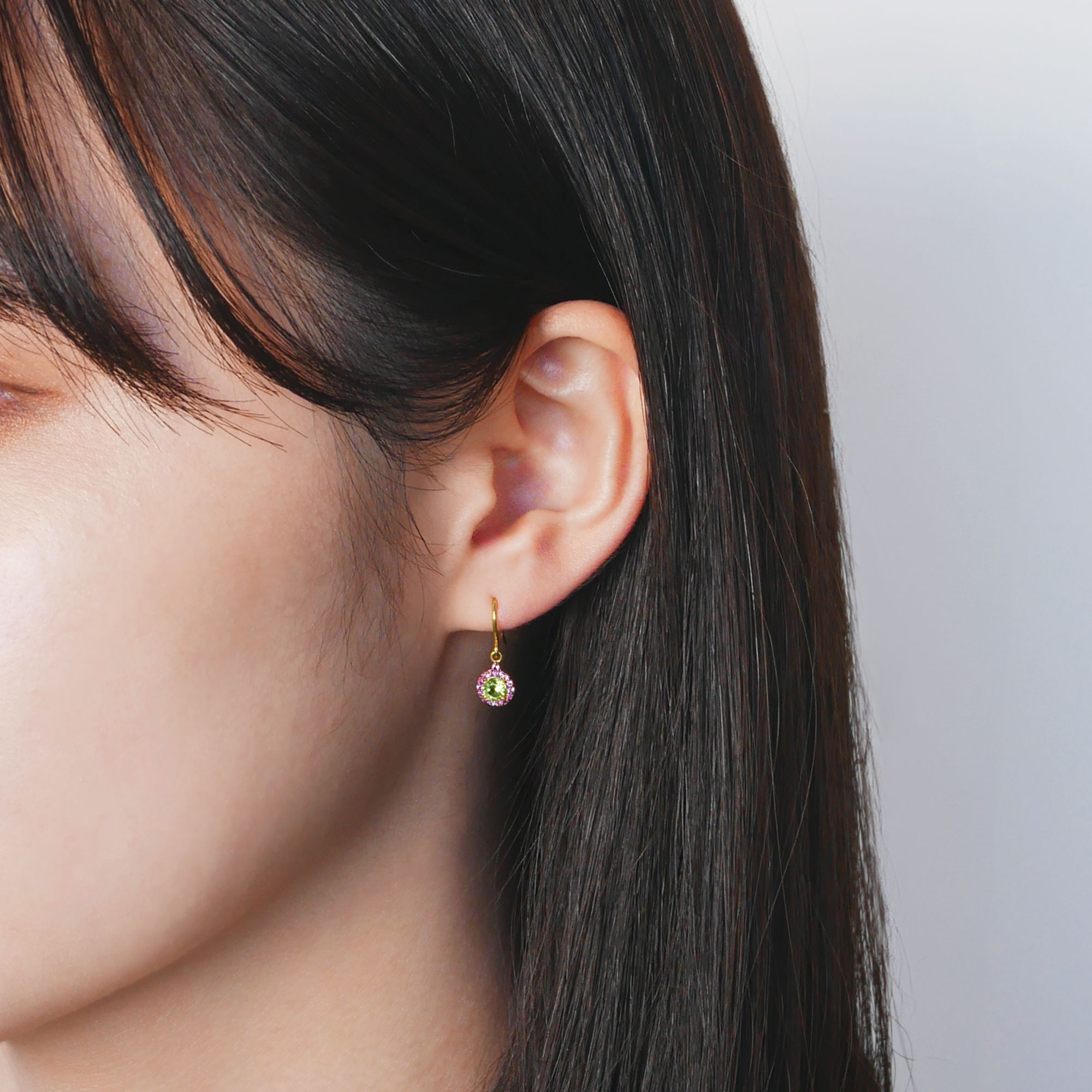 色鮮やかなペリドットを反対色のピンクカラーで取り巻いたピアス。