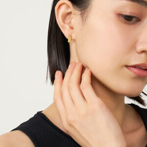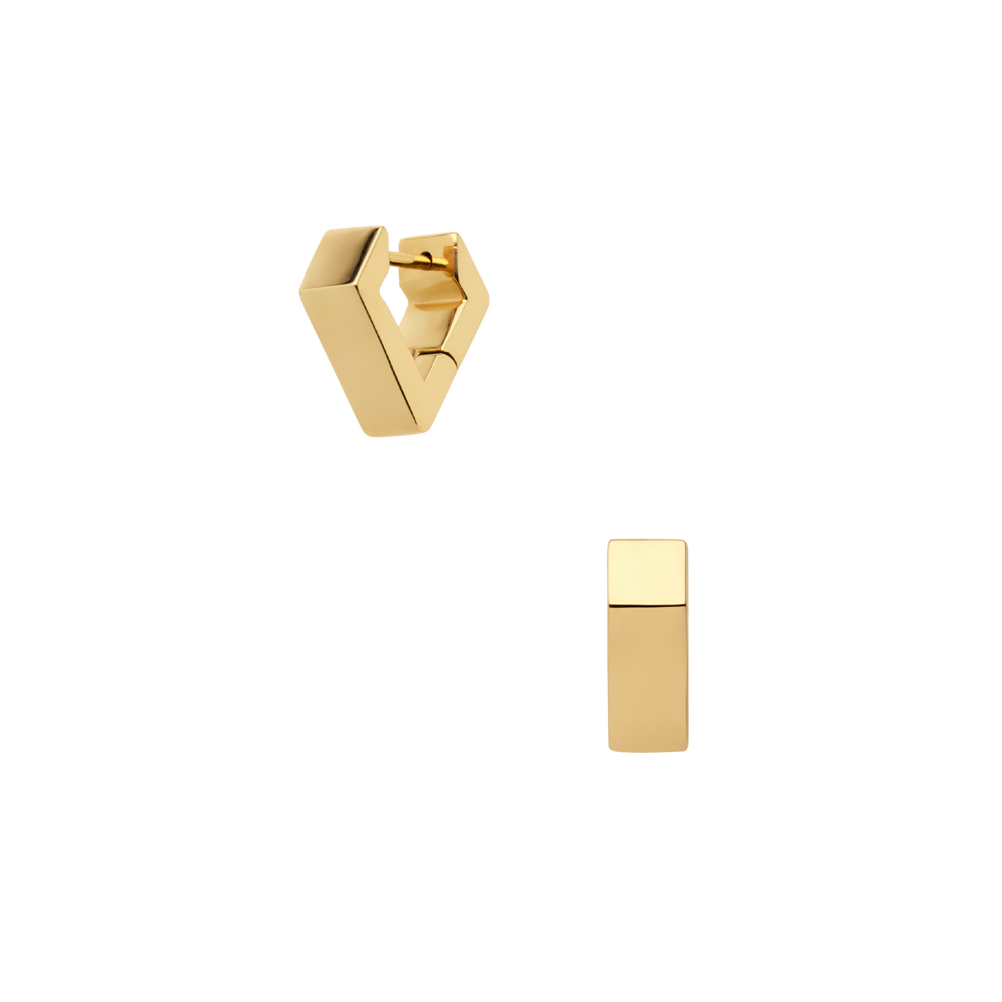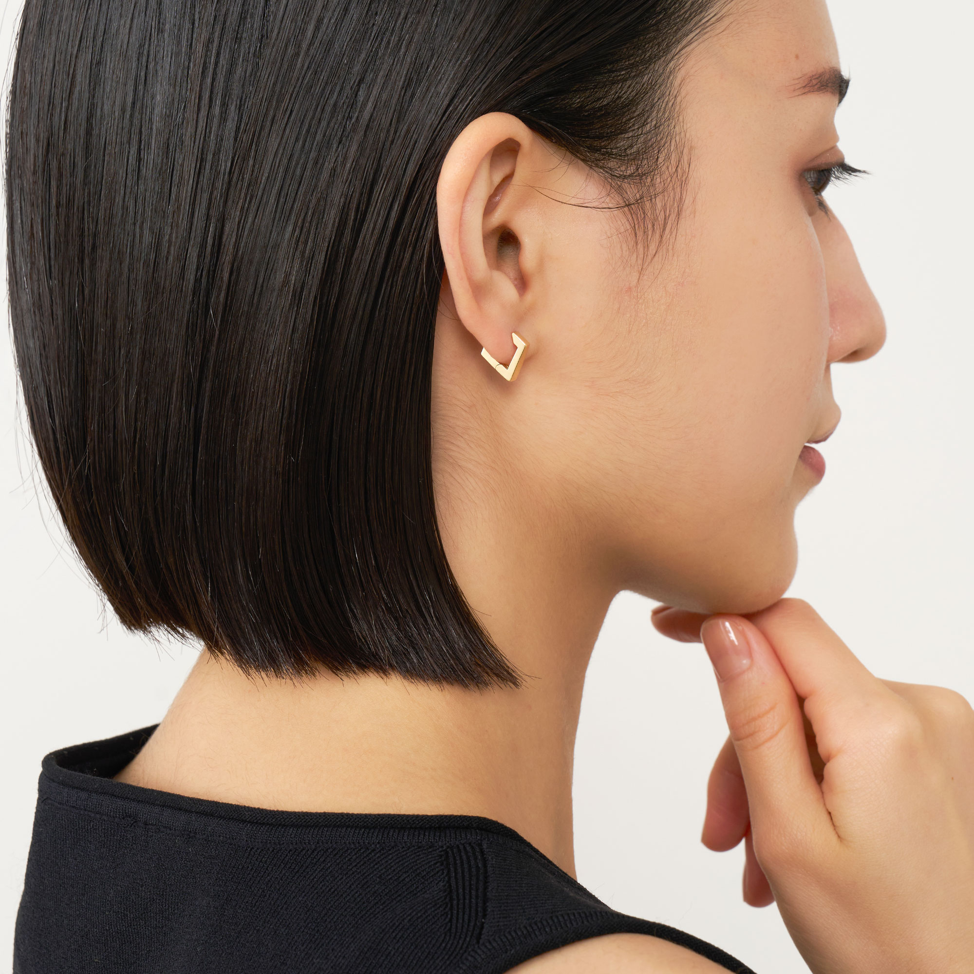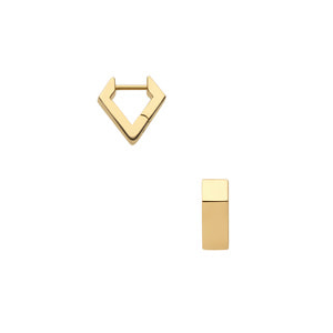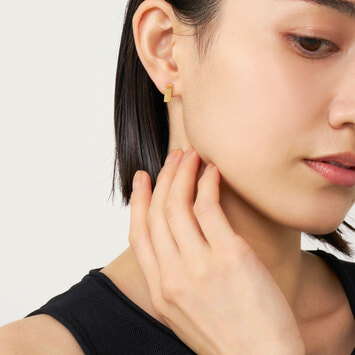 耳たぶを挟むダイヤモンド型のシルエットと、イエローゴールドのシャープな光沢が印象的なピアス。