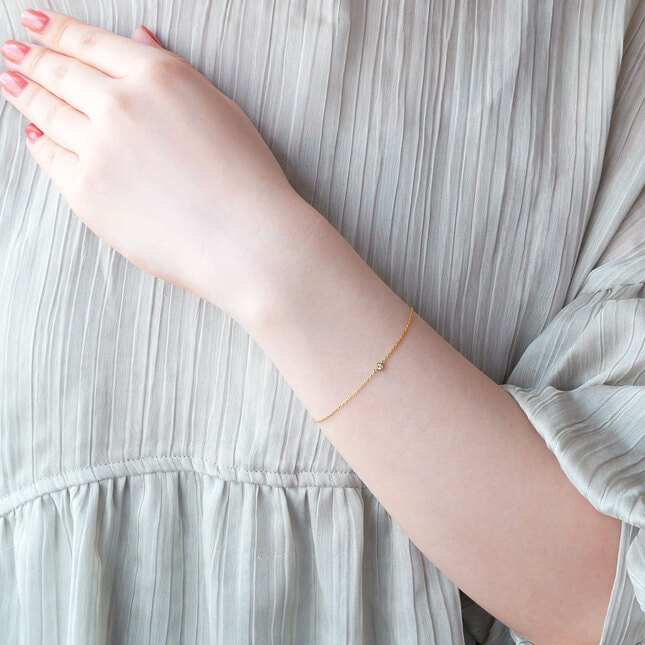 華奢なブレスレットは、腕時計と重ねて手元にきらめきをプラスしたコーディネートにもおすすめです。