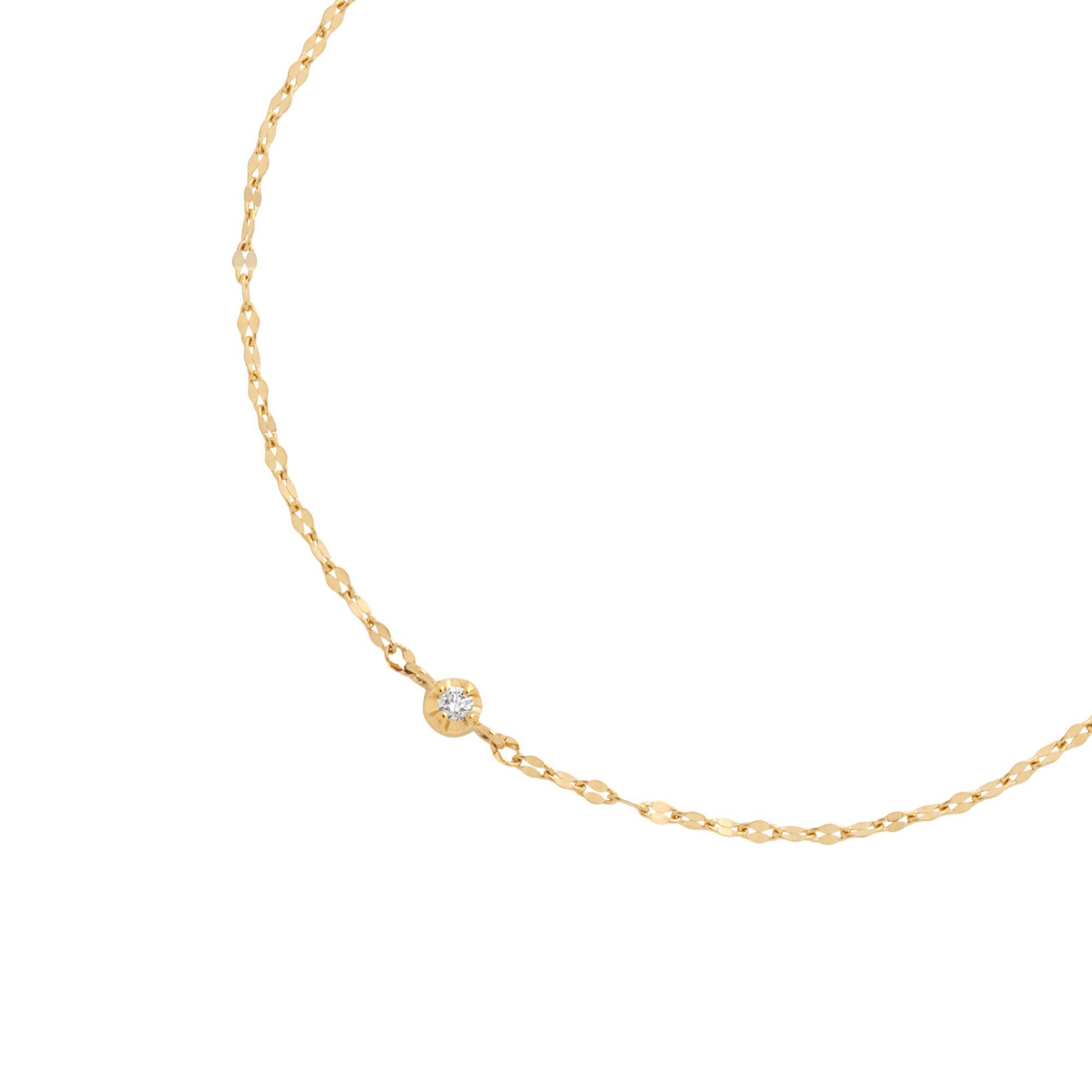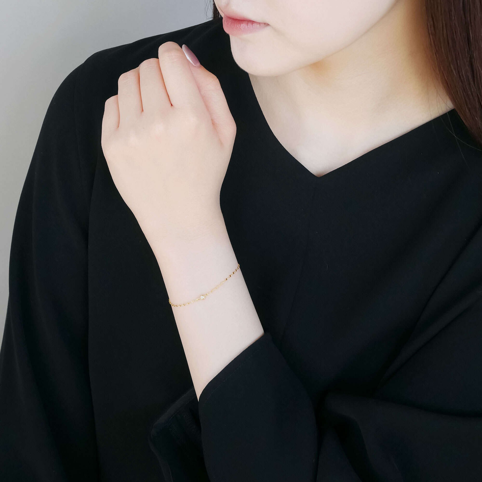 カットの入ったイエローゴールドのチェーンが小さなダイヤモンドの輝きを反射し、華奢ながら手元に華やぎをプラスしてくれそうなアイテムです。