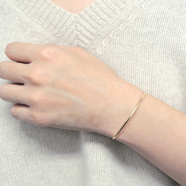 つや感のある光沢を放つイエローゴールドがクリーンな印象を与えつつも、細みで繊細なラインが手元を女性らしく演出してくれます。