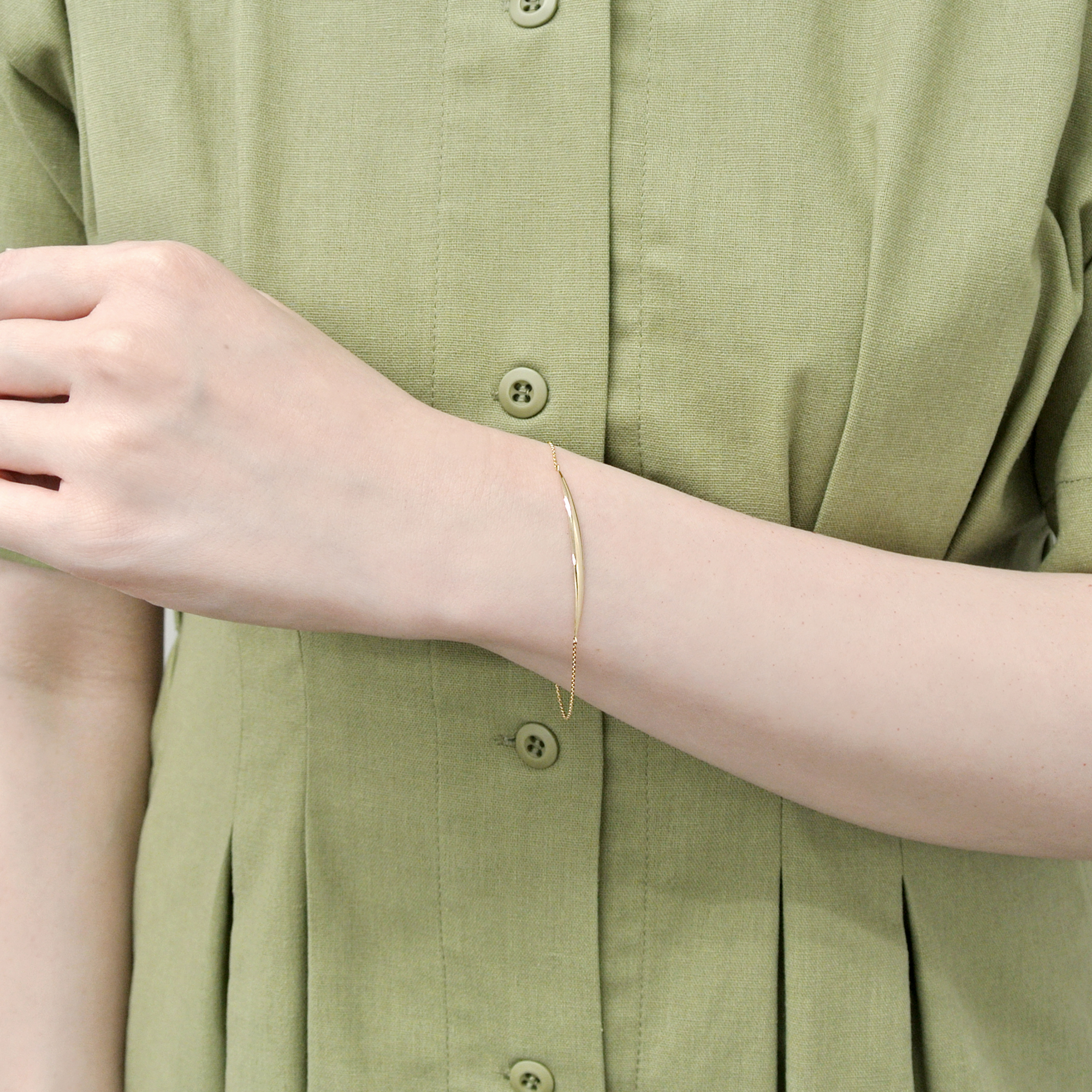 ゴールドの心地よい重みと手首に沿う緩やかなカーブが、しっとりと馴染むような着け心地です。
