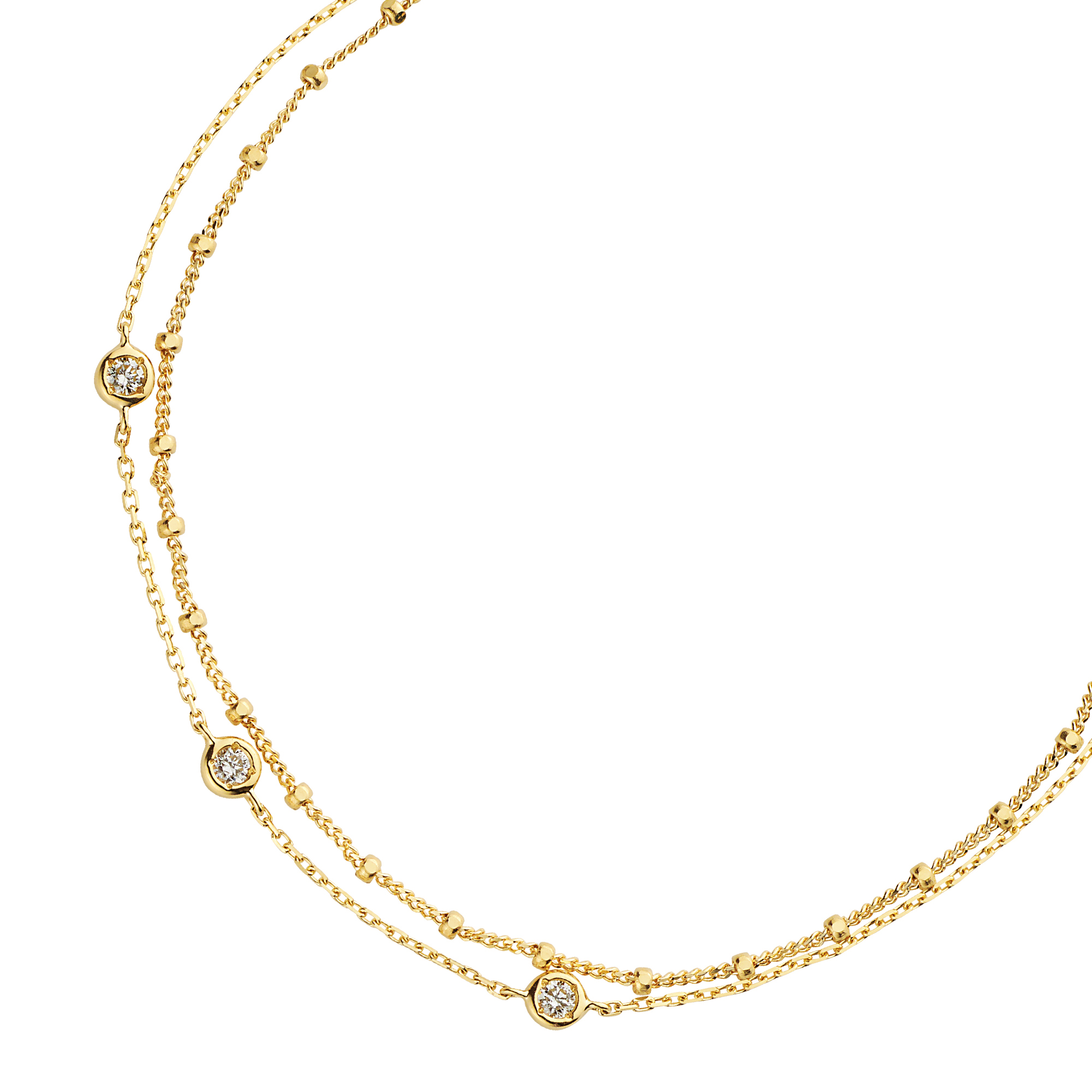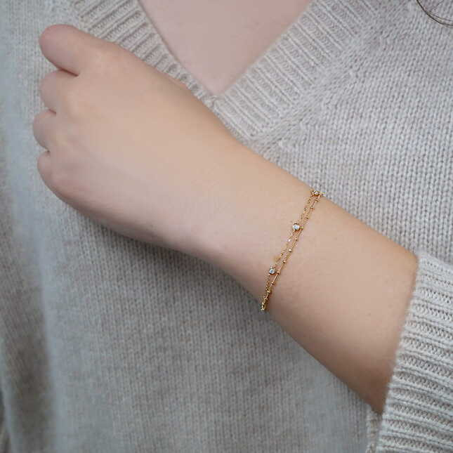 キラキラとしたパーツがリズミカルに並んだチェーンと、3石のダイヤモンドの煌きが美しく、手元に豊かな表情を生み出します。