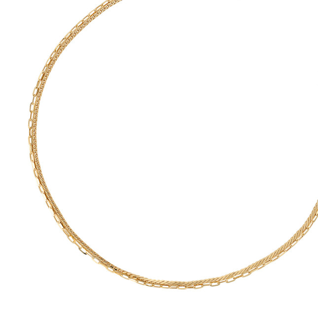 1本は目の細かい四角いチェーンで、ゴールドの艶めきと輝きが感じられる存在感のあるチェーン。