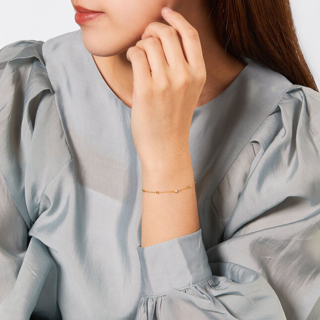 動くたびに光を反射して煌き、毎日の着こなしに上品な印象をプラスします。