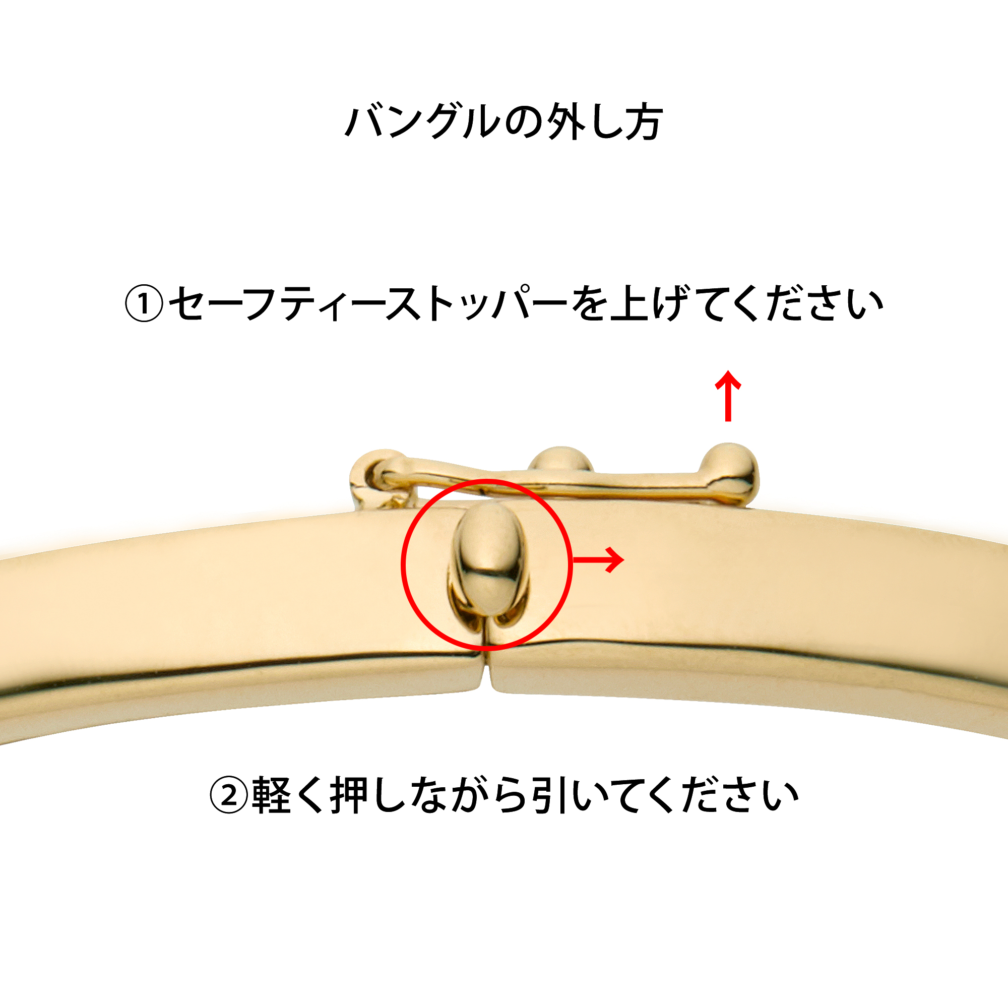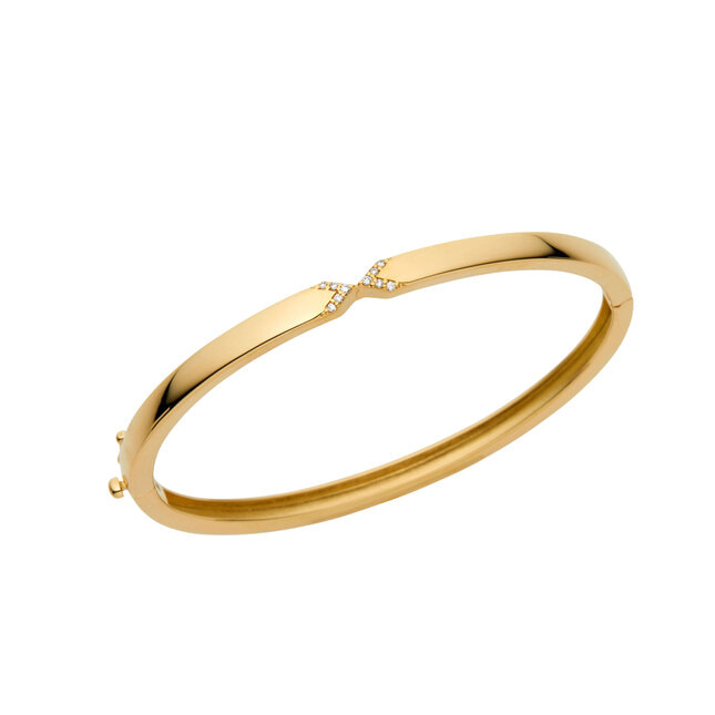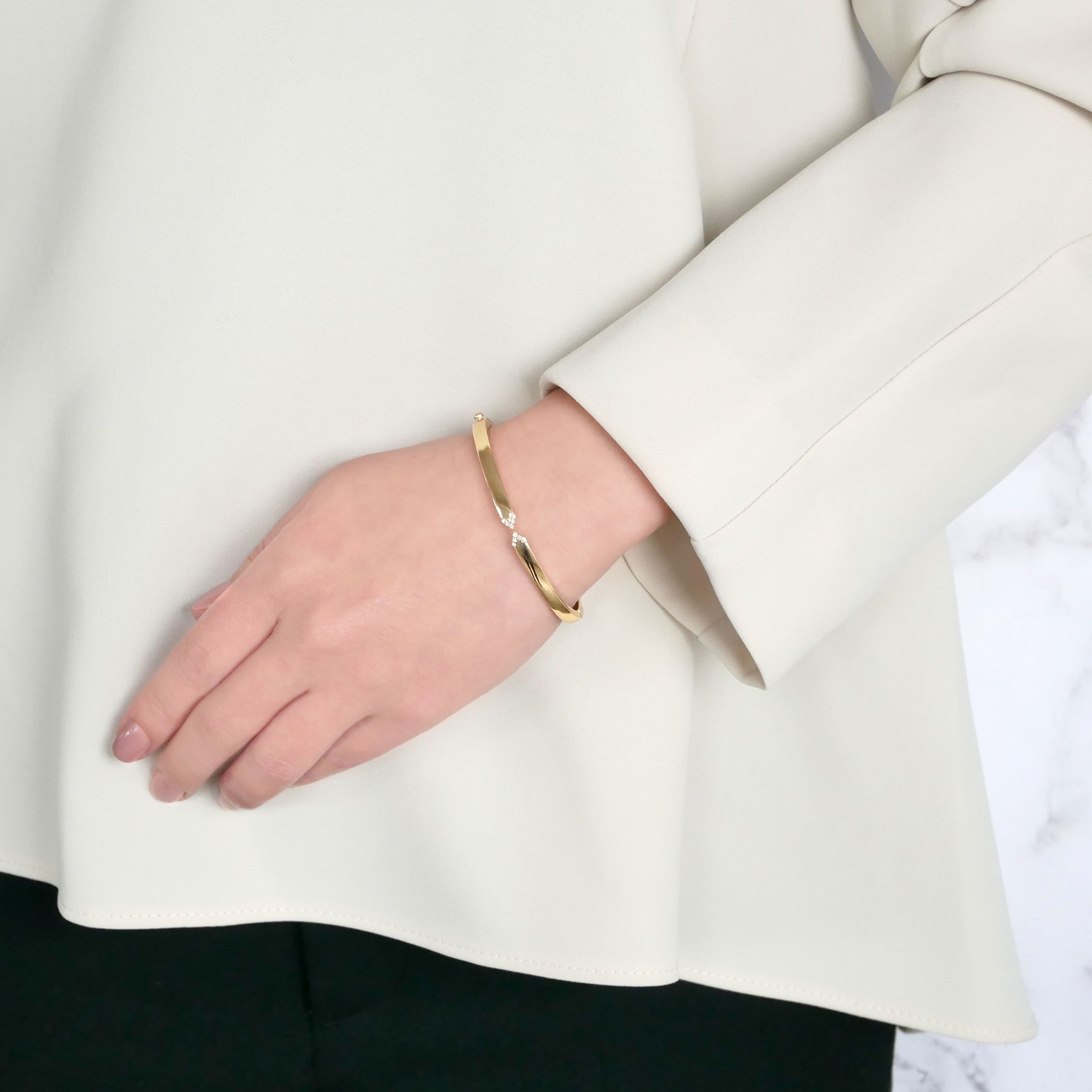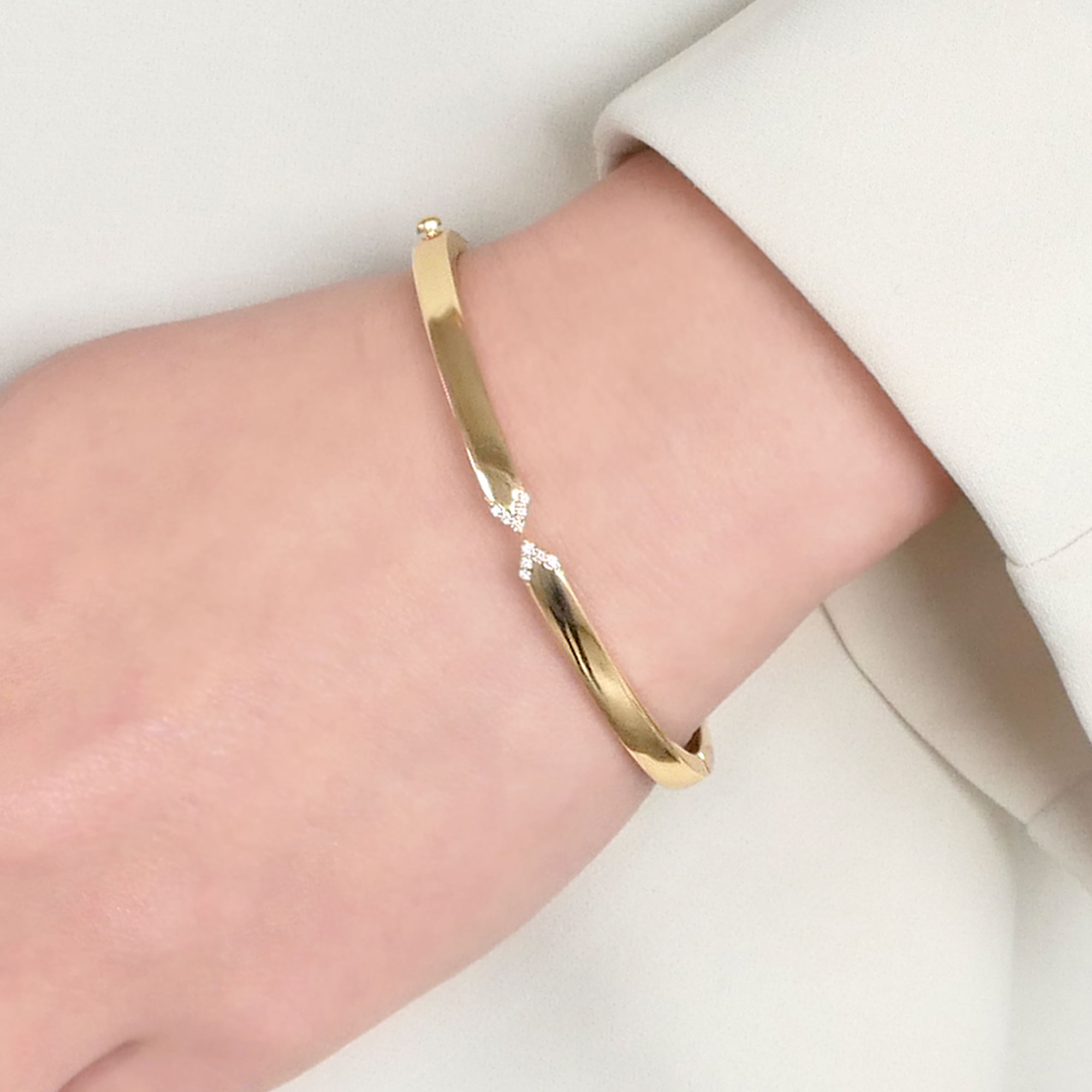 曇りなく磨かれたゴールドの直線的なラインが美しいバングル。