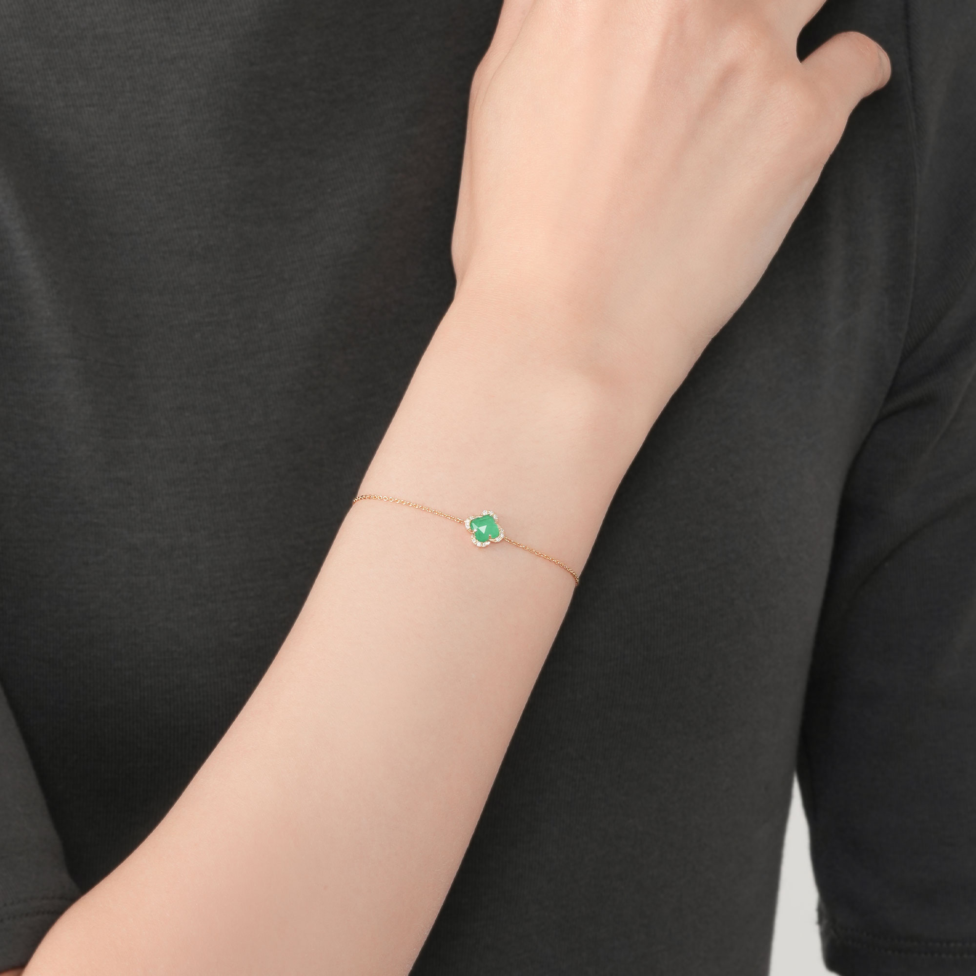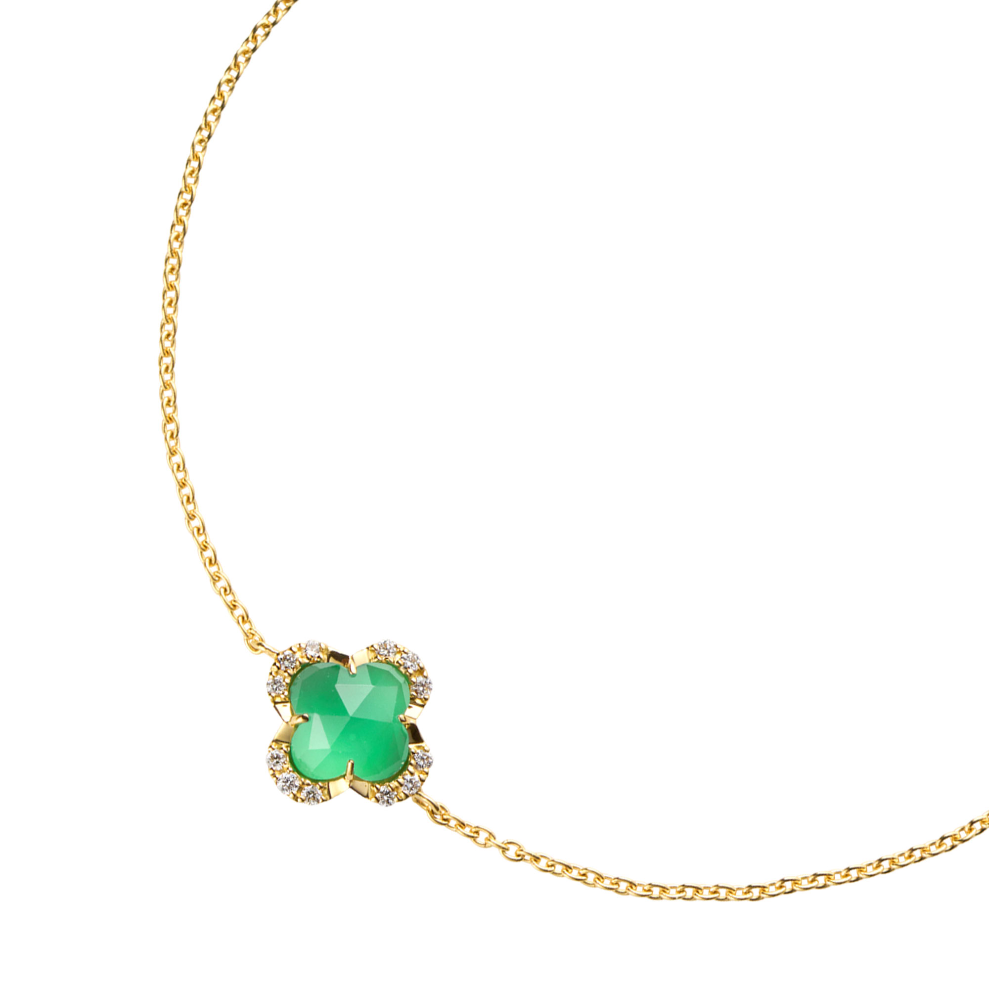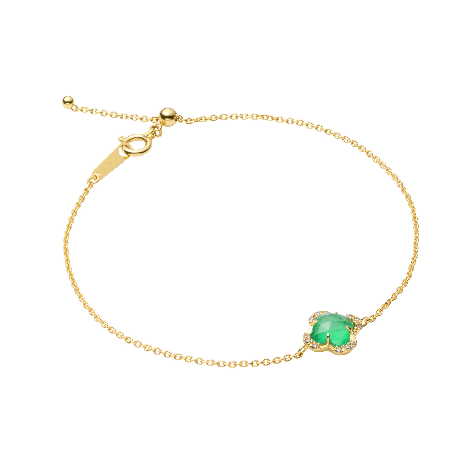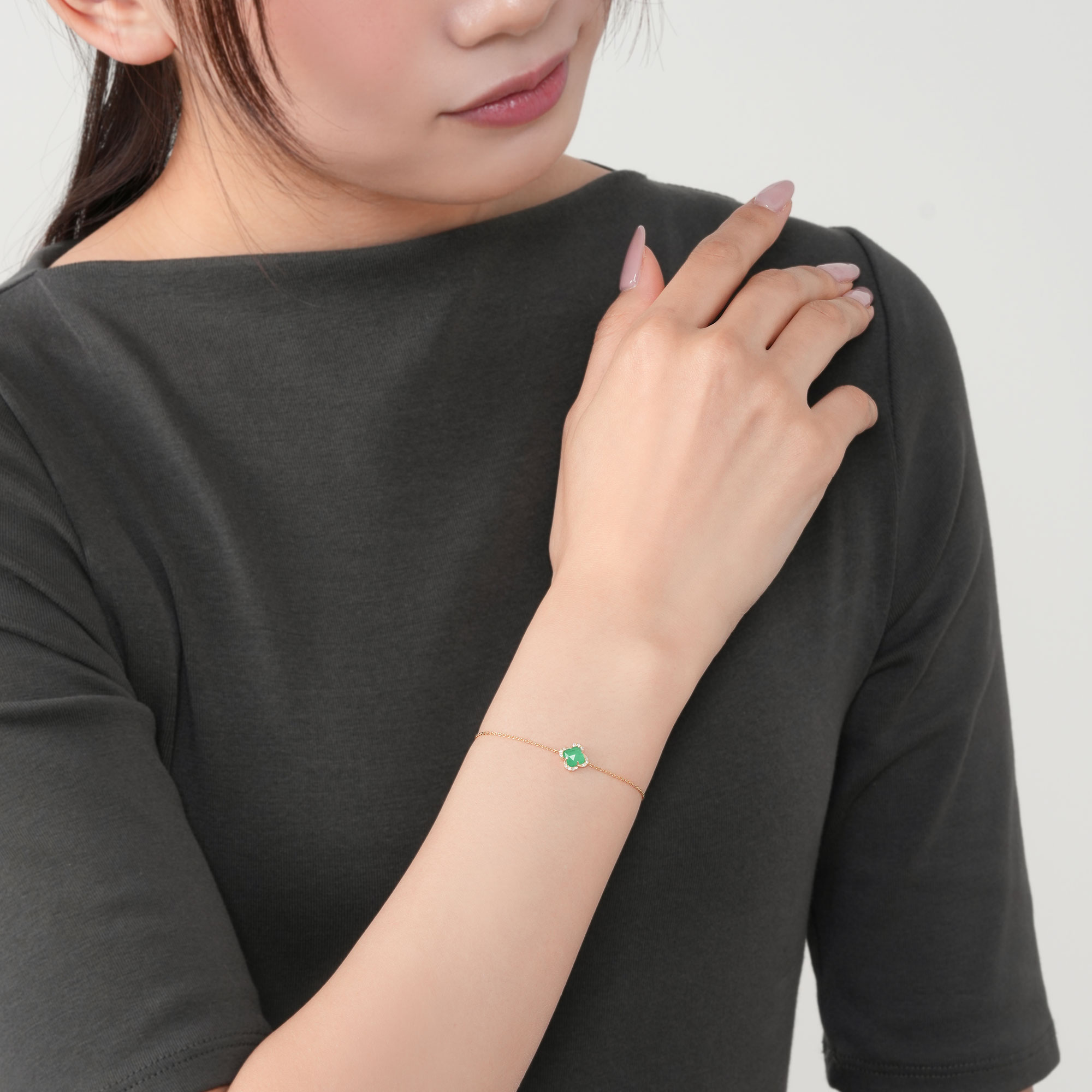 グリーンカルセドニーとクォーツを組み合わせた色鮮やかなカラーリングで、クローバーを可愛らしく描いたブレスレット。