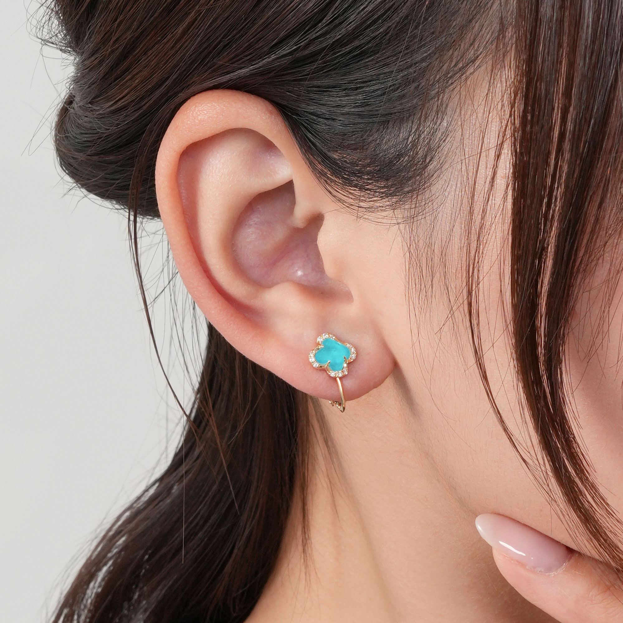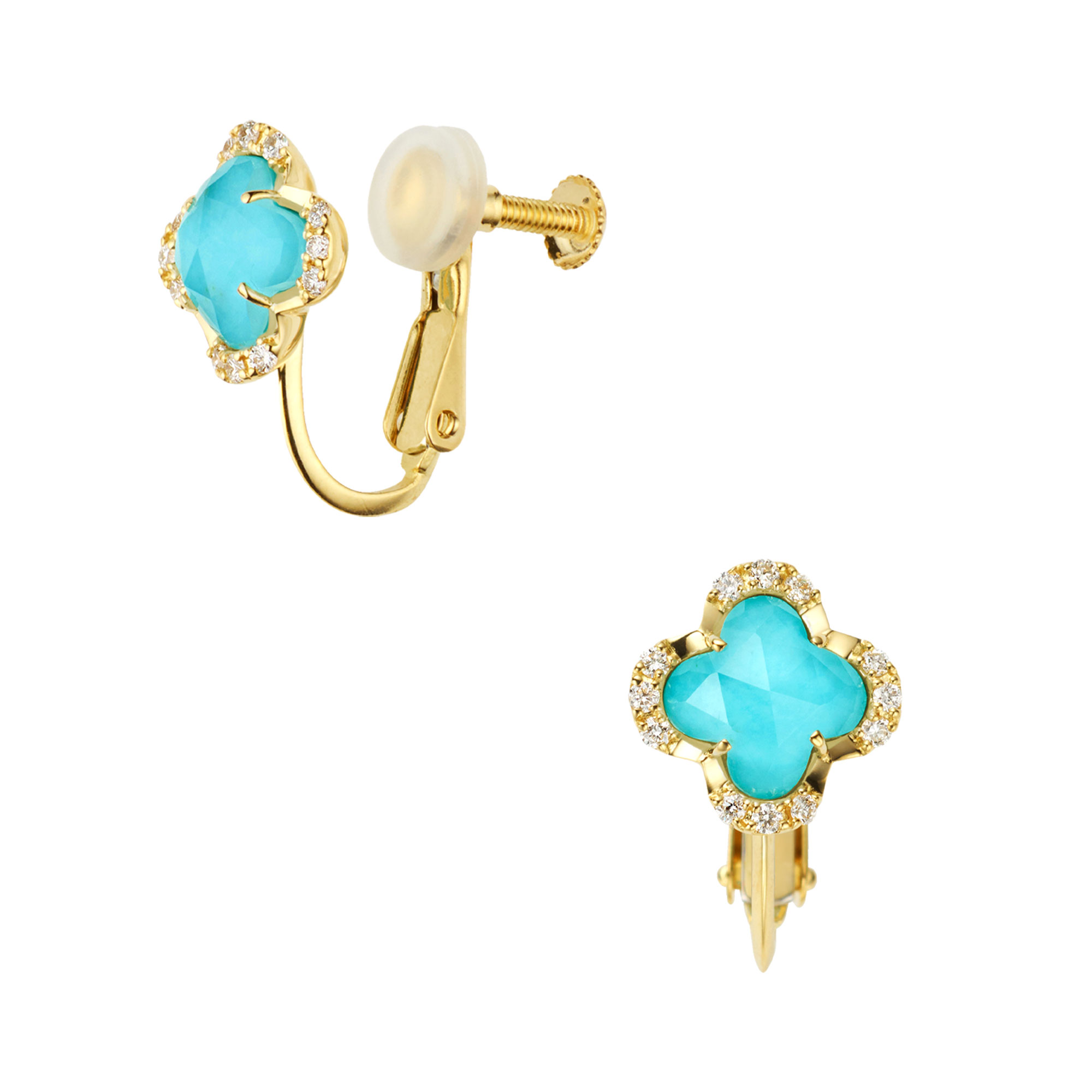 イエローゴールドに色鮮やかなターコイズとクォーツを組み合わせたイヤリング。