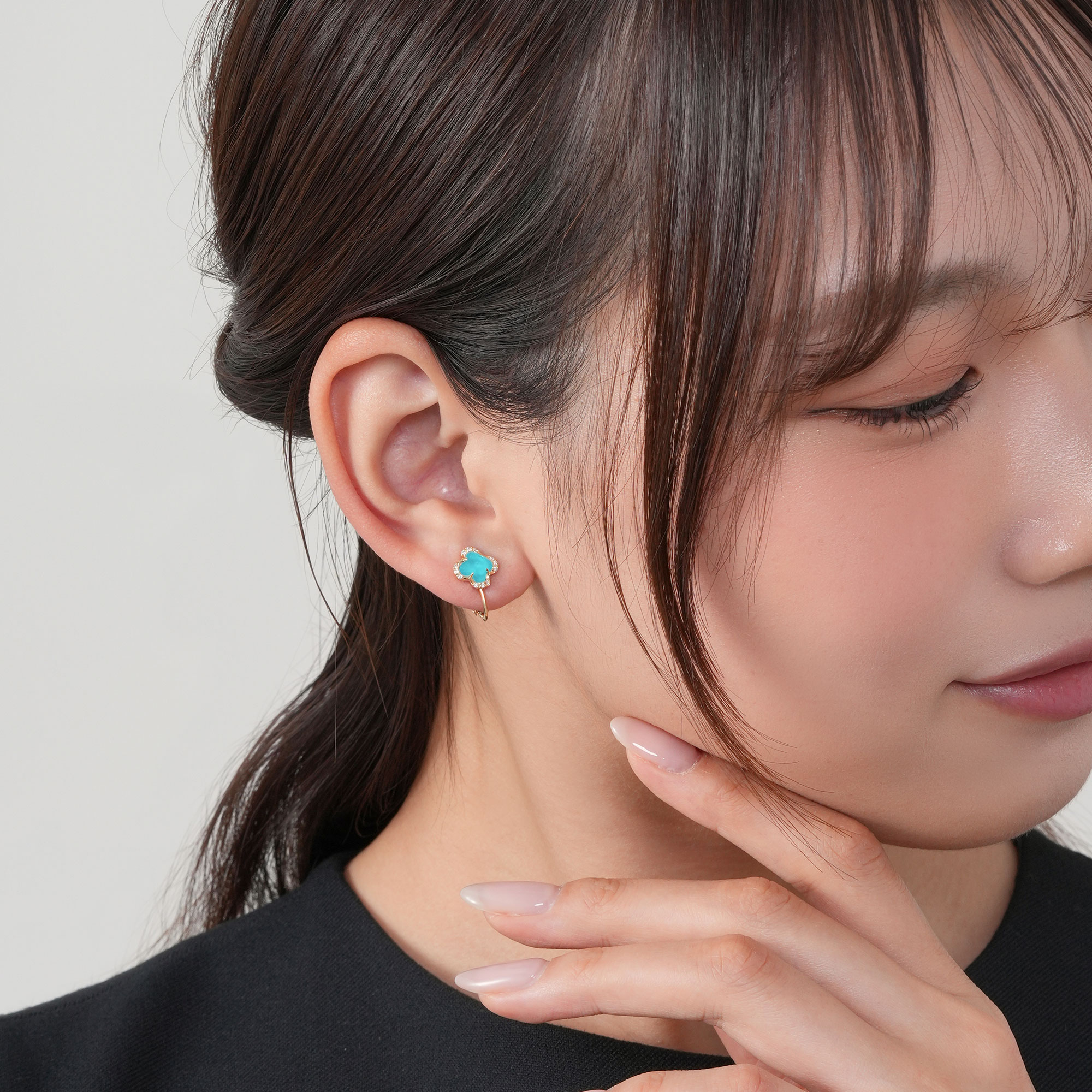 ターコイズの上にみずみずしい透明感のクォーツを重ね、華やかでツヤのある新しい質感に。