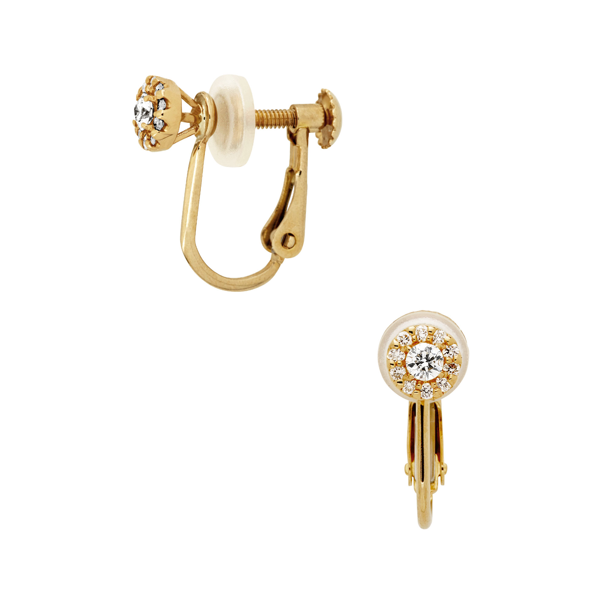 一粒ダイヤモンドを繊細なメレダイヤモンドで縁取ったイヤリング。