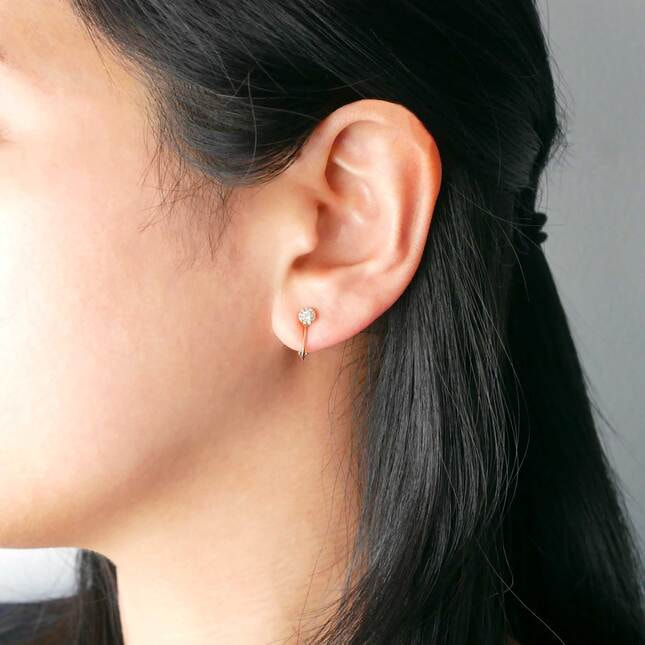 大小のダイヤモンドが互いの光を重ね合ったモチーフは、シンプルな一粒ダイヤモンドイヤリングにはないフェミニンさとエレガントさに満ちています。