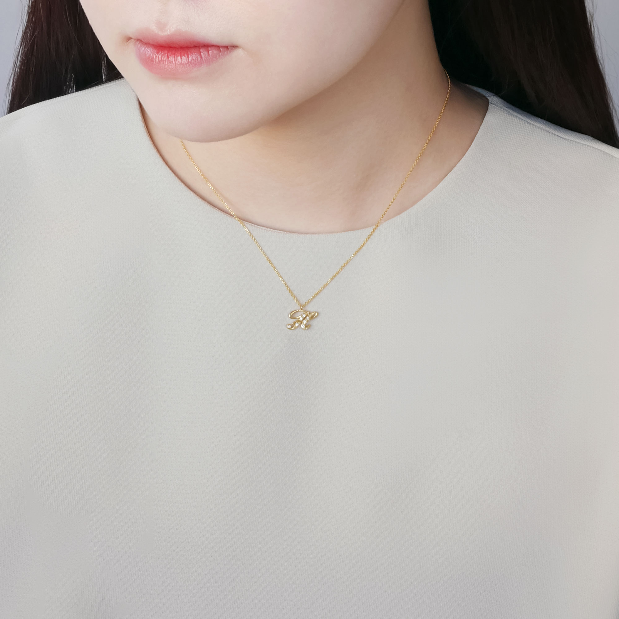 羽ペンのレタリングのような、華やかでエレガントな印象のイニシャルネックレス。